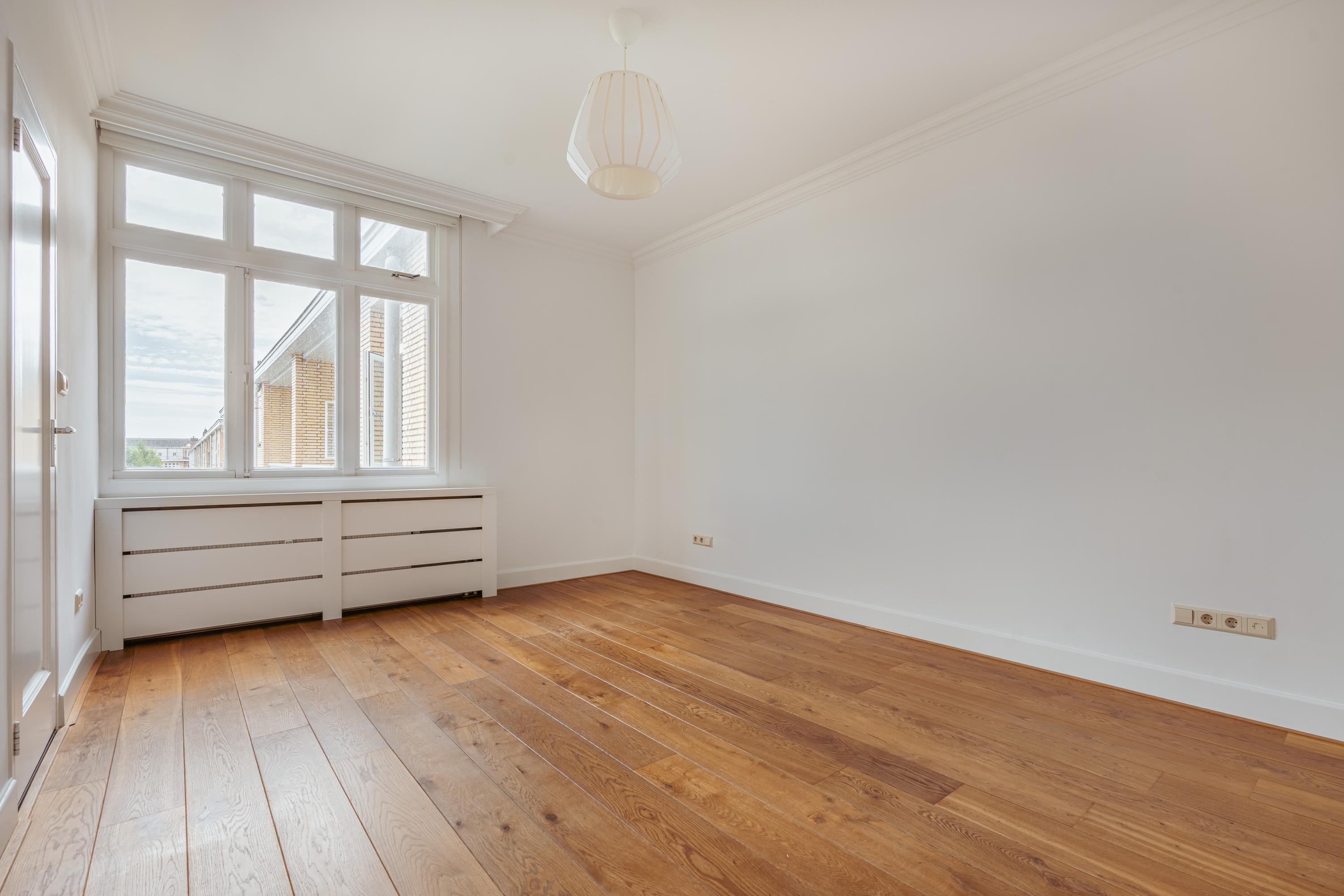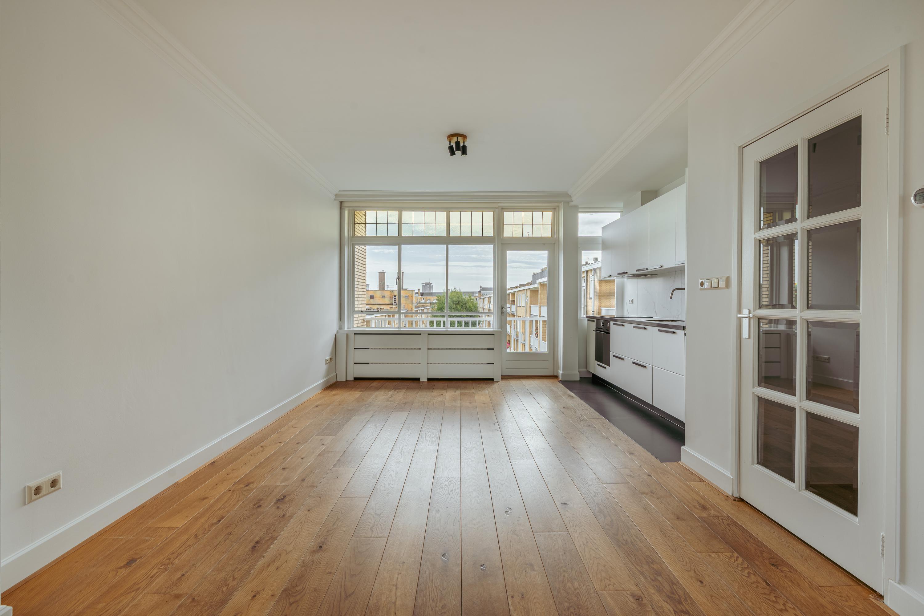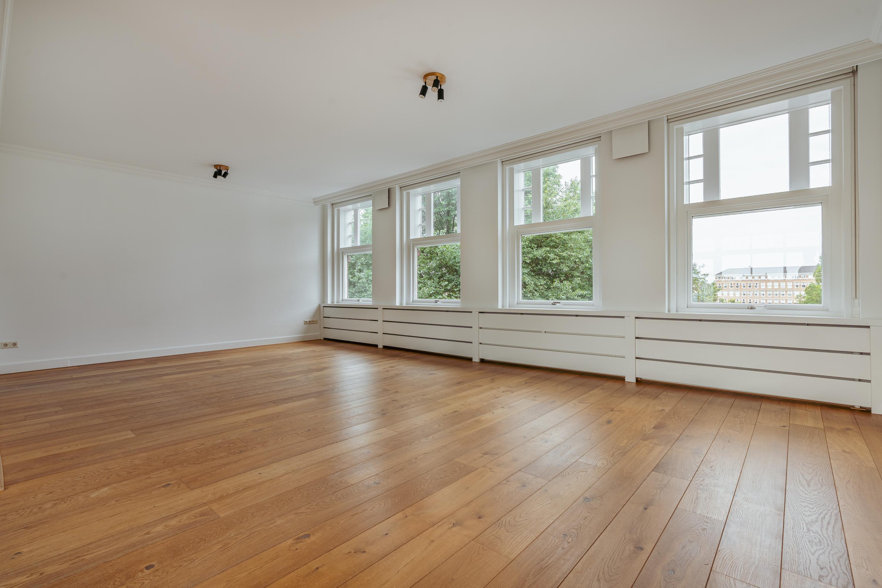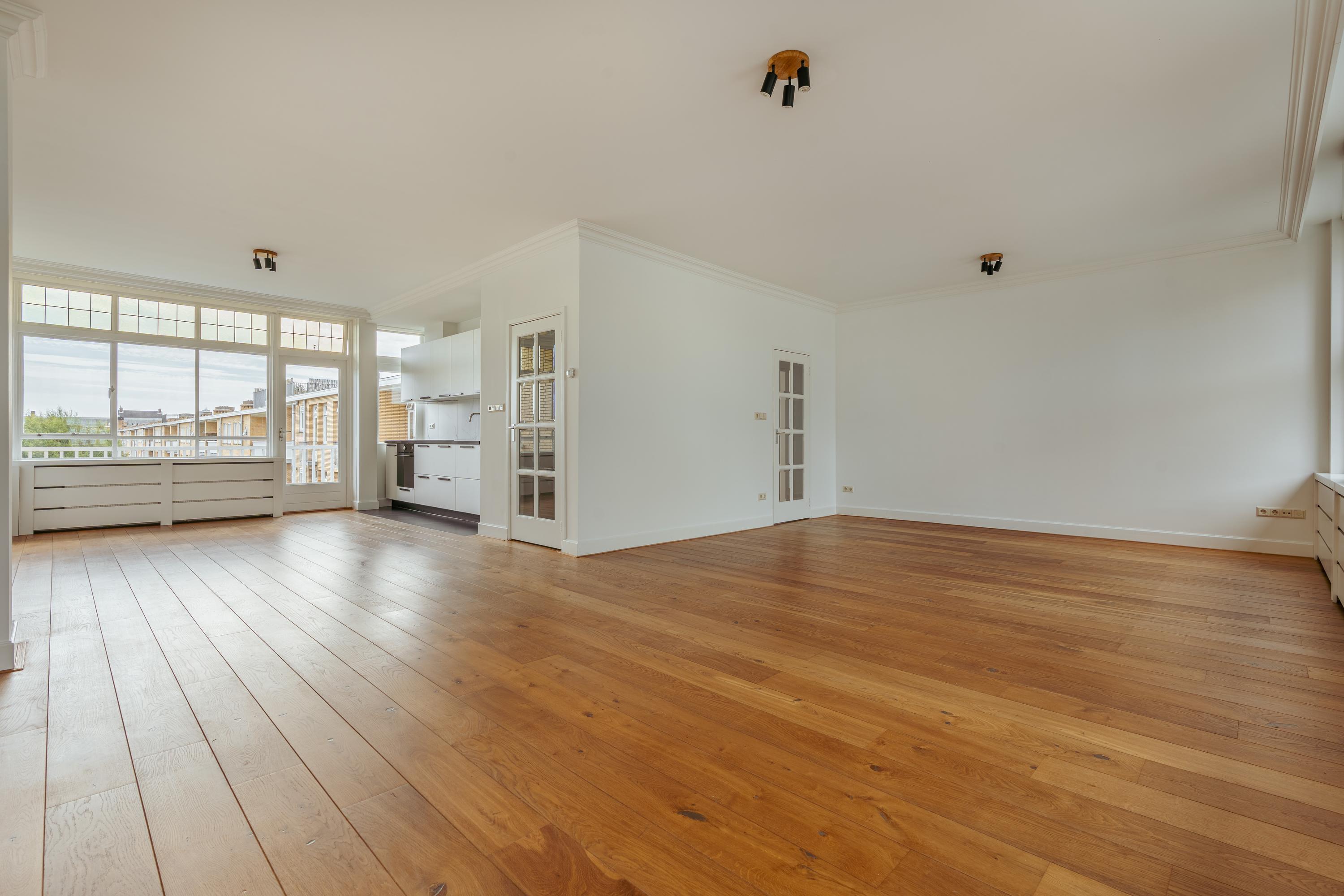 De lichte en indrukwekkend ruime woonkamer (ca. 39,5 m²) is gelegen aan de voorzijde van het pand en wordt gekenmerkt door grote raampartijen die voor veel licht zorgen met uitzicht over het groene en statige Minervaplein. De open woonkeuken is voorzien van diverse moderne inbouwapparatuur, waaronder een inductiekookplaat, combi-oven, vaatwasser, koelkast en vriezer. Vanuit de keuken heeft u toegang tot het balkon op het noord-oosten, een heerlijke plek om van de middag- en avondzon te genieten.