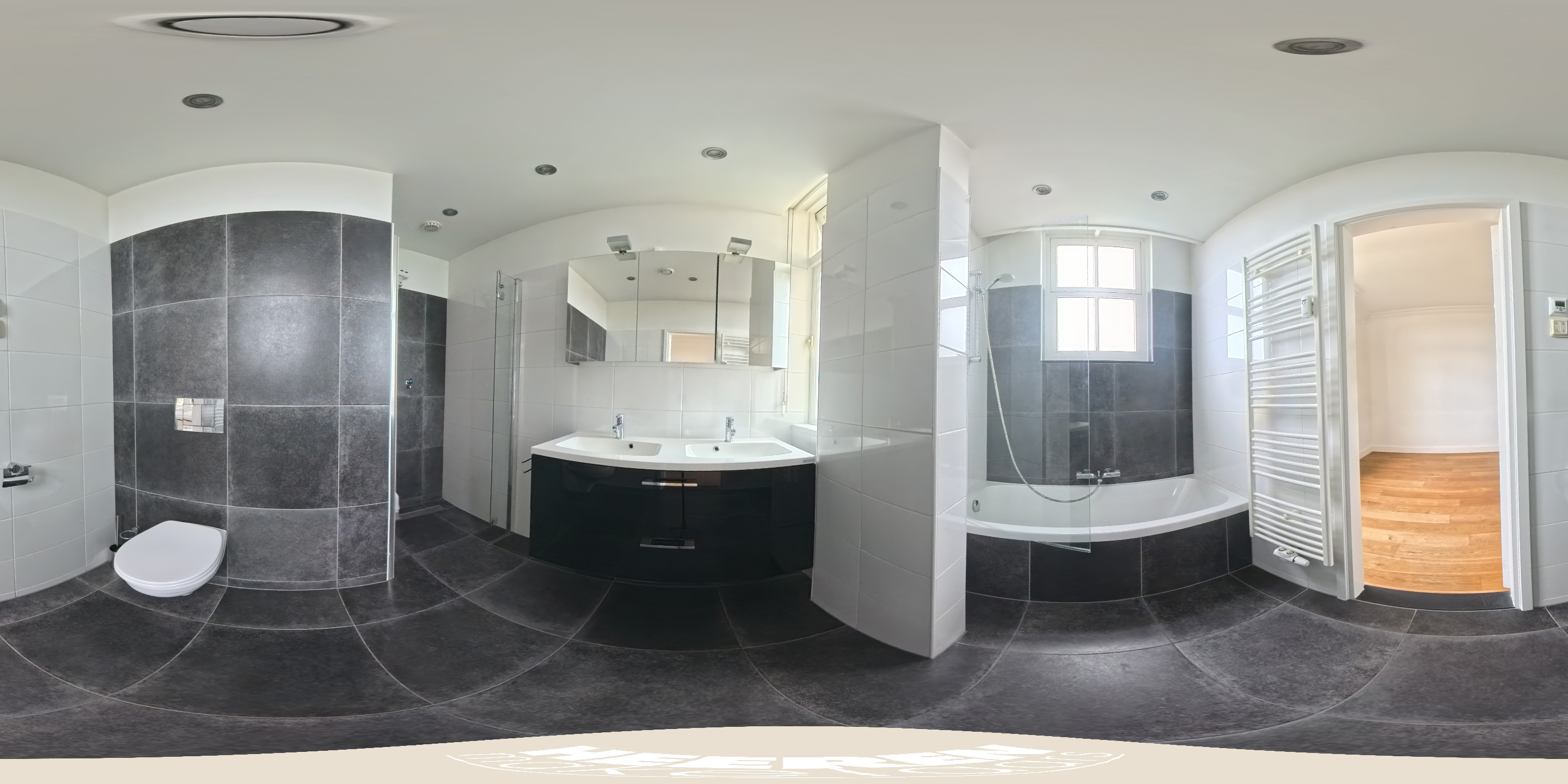 Centraal in de woning bevindt zich een tweede badkamer met toilet, wastafel en douche, bereikbaar vanuit de hal. Ook is er extra bergruimte aanwezig in de vorm van twee ingebouwde kasten naast de meterkast.