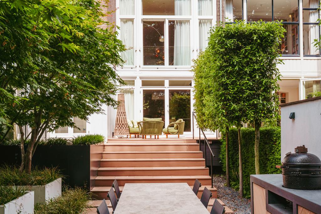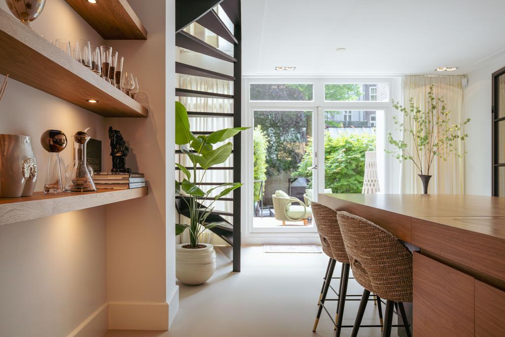 De woning is toegankelijk zowel vanaf de bel-etage als vanuit het souterrain, dat bereikbaar is via de trap of lift vanuit de hal of direct vanuit de bovengelegen eetkamer. Bij binnenkomst op deze verdieping treedt u de hal binnen, waar zich een separaat toilet bevindt. Aan de voorzijde ligt een slaapkamer met een en-suite badkamer, voorzien van een wastafel en douche. Deze multifunctionele ruimte wordt momenteel gebruikt als gym, maar is flexibel inzetbaar. De luxe uitgevoerde open woonkeuken bevindt zich aan de achterzijde en vormt het kloppend hart van deze verdieping. De keuken is uitgerust met hoogwaardige inbouwapparatuur van het merk Gaggenau, waaronder een koelkast, vriezer, Quooker, vijfpits gasfornuis geïntegreerd in het aanrecht, oven, stoomoven, vaatwasser en wijnklimaatkast. Het massief natuurstenen aanrechtblad in combinatie met het houten bargedeelte zorgt voor een warme, stijlvolle uitstraling. De keuken beschikt bovendien over bijzonder veel opbergruimte en is toegankelijk vanuit de eetkamer op de bel-etage of via openslaande deuren vanuit de hal. Een sfeervolle gashaard maakt de ruimte helemaal af. Aangrenzend aan de keuken bevindt zich een slaapkamer – momenteel in gebruik als werkkamer – die, net als de keuken, via openslaande deuren directe toegang biedt tot het ruime terras. Dit terras leidt via een trap naar de fraai aangelegde, op het zuiden gelegen achtertuin, die ook bereikbaar is via een achterom aan het Schapenburgerpad. Deze toegang biedt de zeldzame mogelijkheid om de achtertuin te betreden en bijvoorbeeld fietsen direct in de tuin te plaatsen, uniek in het centrum van Amsterdam. De tuin, onder architectuur aangelegd door Erik van Gelder, beschikt over een complete buitenkeuken, ideaal voor lange zomeravonden, en is ook voorzien van een vrijstaande berging. Hier geniet u in alle rust van zon en privacy, tot in de late uurtjes.