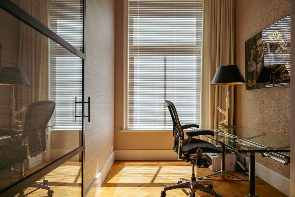 De gehele verdieping is hoogwaardig afgewerkt met stijlvol en sfeervol behang, wat de ruimte warmte en karakter geeft. Grote raampartijen aan beide zijden van de verdieping zorgen voor een uitzonderlijke hoeveelheid daglicht en benadrukken de ruimtelijkheid en luxe van het geheel.