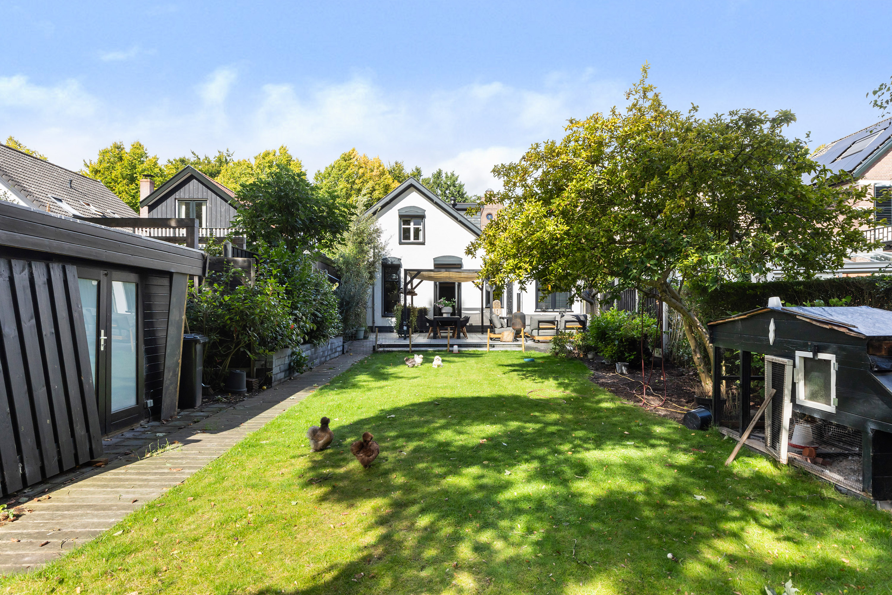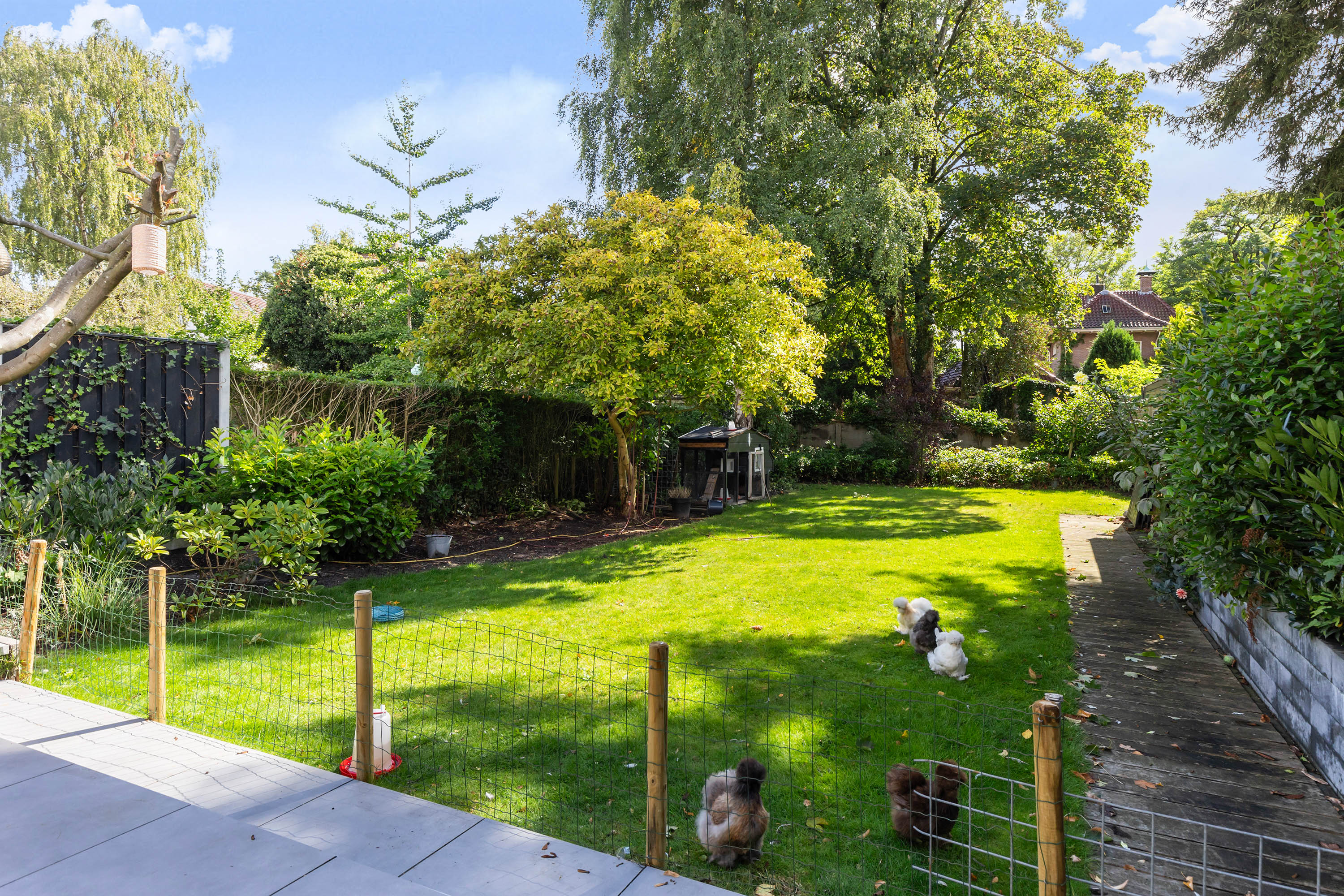 De achtertuin is circa 30 meter diep, volledig besloten en gelegen op het zuidwesten. Dankzij de volgroeide bomen en het groen rondom geniet u hier van optimale privacy. Het royale terras biedt ruimte voor zowel een grote loungeset als een eettafel, zodat u op elk moment van de dag van zon of schaduw kunt genieten. Verder is er een gazon, een kippenren en een houten berging aanwezig.