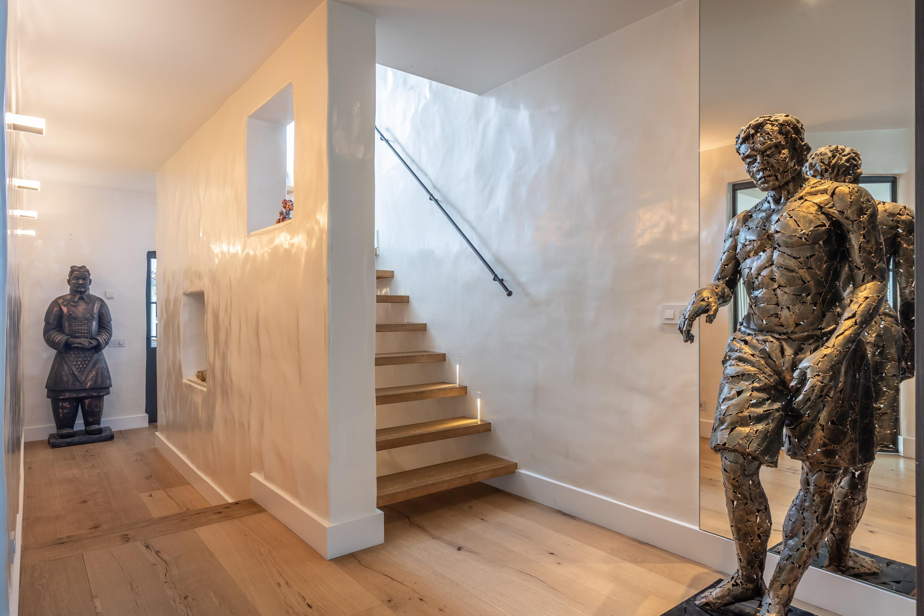 De entree is royaal, met open eiken trappen en sfeervolle verlichting. Het toilet is luxe uitgevoerd met een wandcloset, urinoir en marmeren wastafelmeubel.