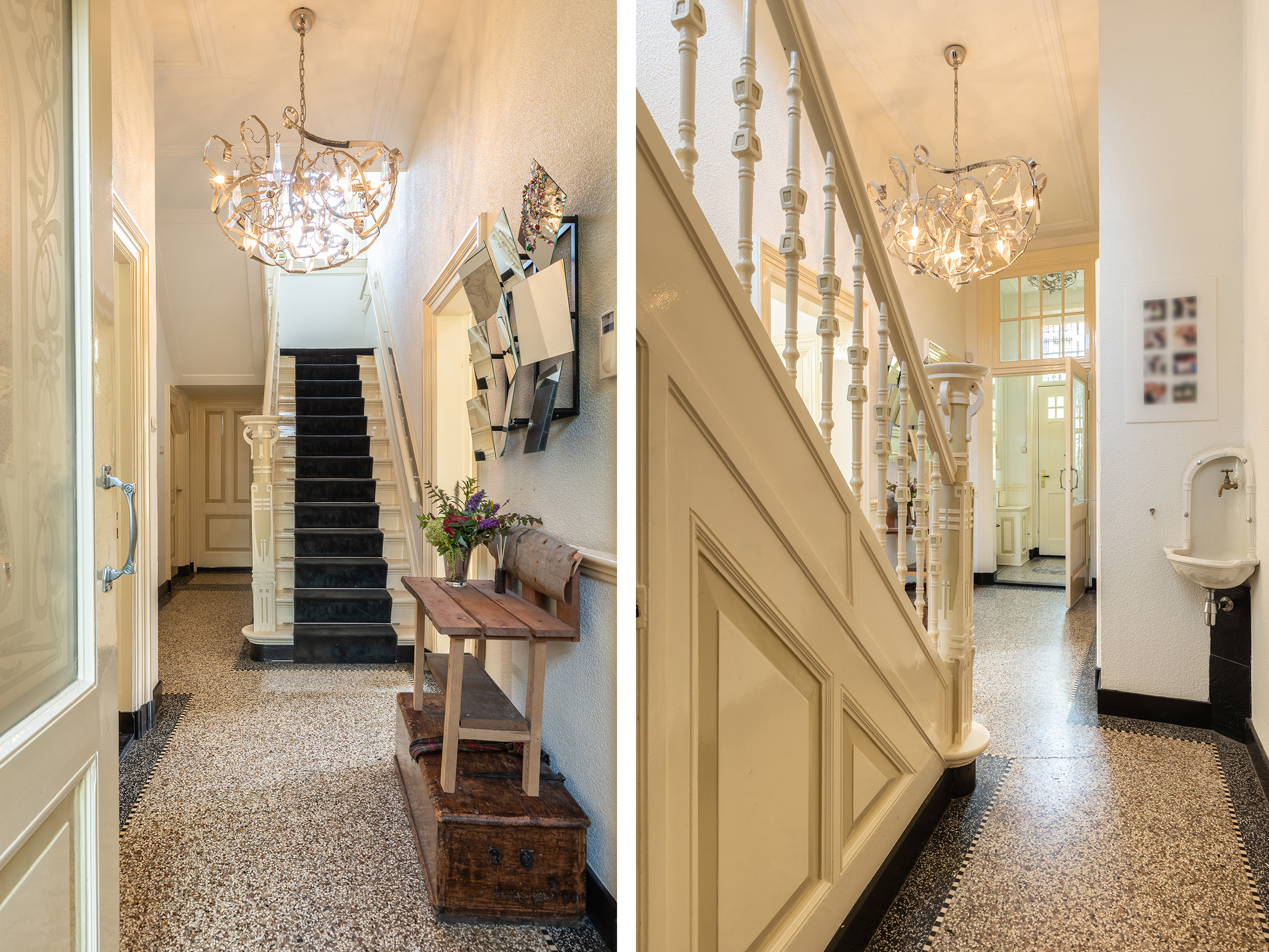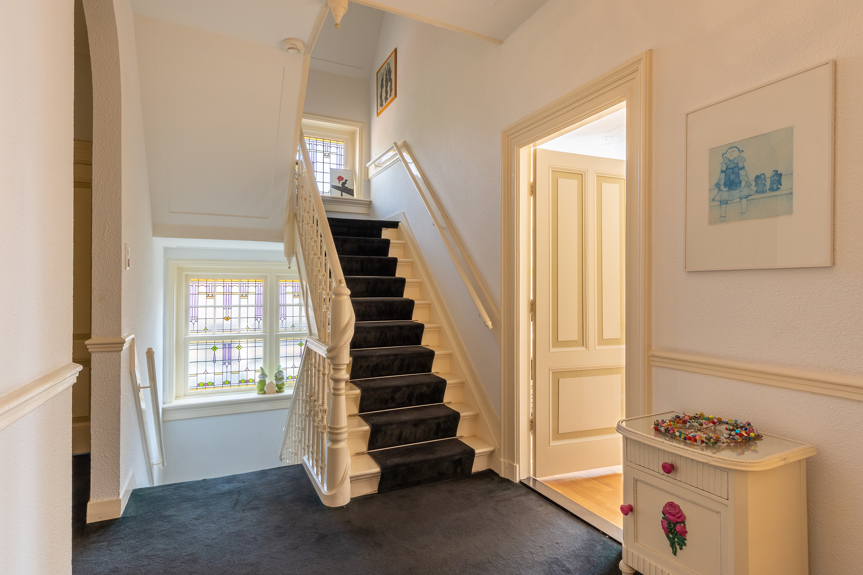 Indeling: Bij binnenkomst via de imposante voordeur betreedt u de vestibule met origineel tochtportaal. De ruime hal, voorzien van een granitovloer met het logo van de oorspronkelijke vrijmetselaarsbewoners, biedt toegang tot alle belangrijke leefruimtes. Rechts vindt u de royale woonkamer en-suite met een prachtige erker, originele suitedeuren met inbouwkasten en een ornamentenplafond. De voorkamer is ingericht als zitkamer, voorzien van een open haard met marmeren schouw. Via de en-suitedeuren betreedt u de lichte serre, die veel natuurlijk lichtinval biedt en ideaal is voor ontspanning met uitzicht op de tuin. De achterkamer, ingericht als lounge, heeft een sfeervolle Jacobus houtkachel en schuifdeuren naar het zonnige terras.