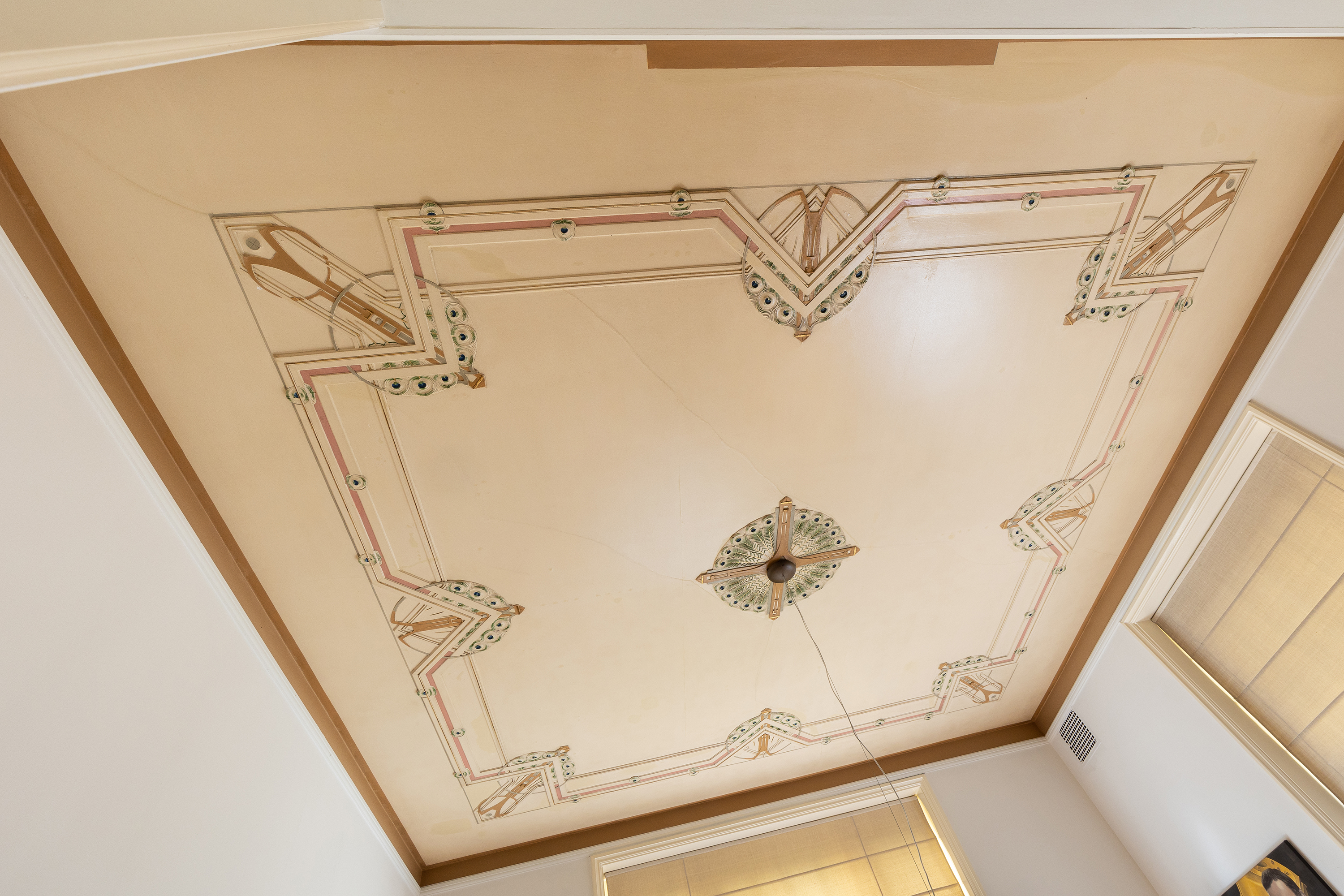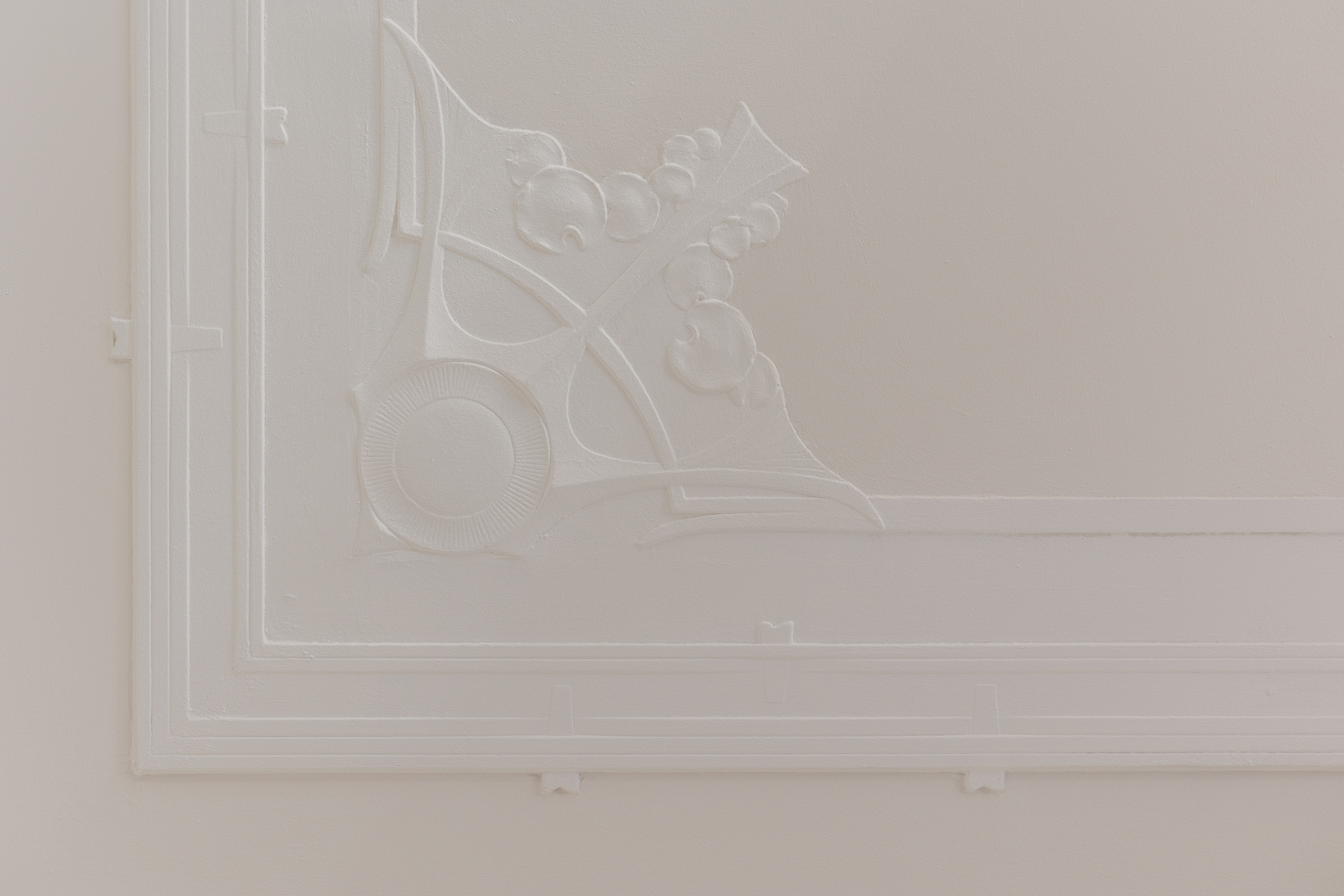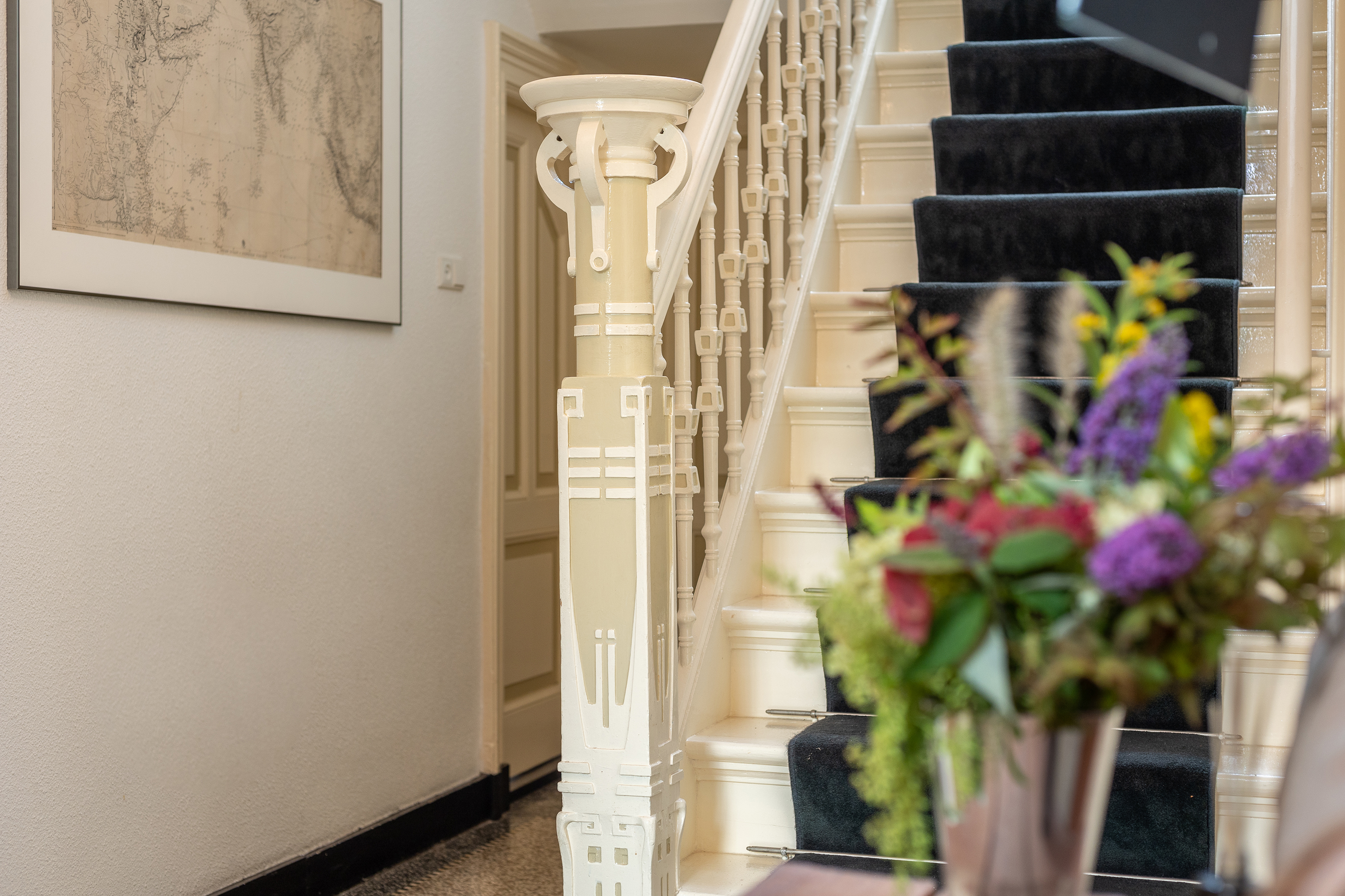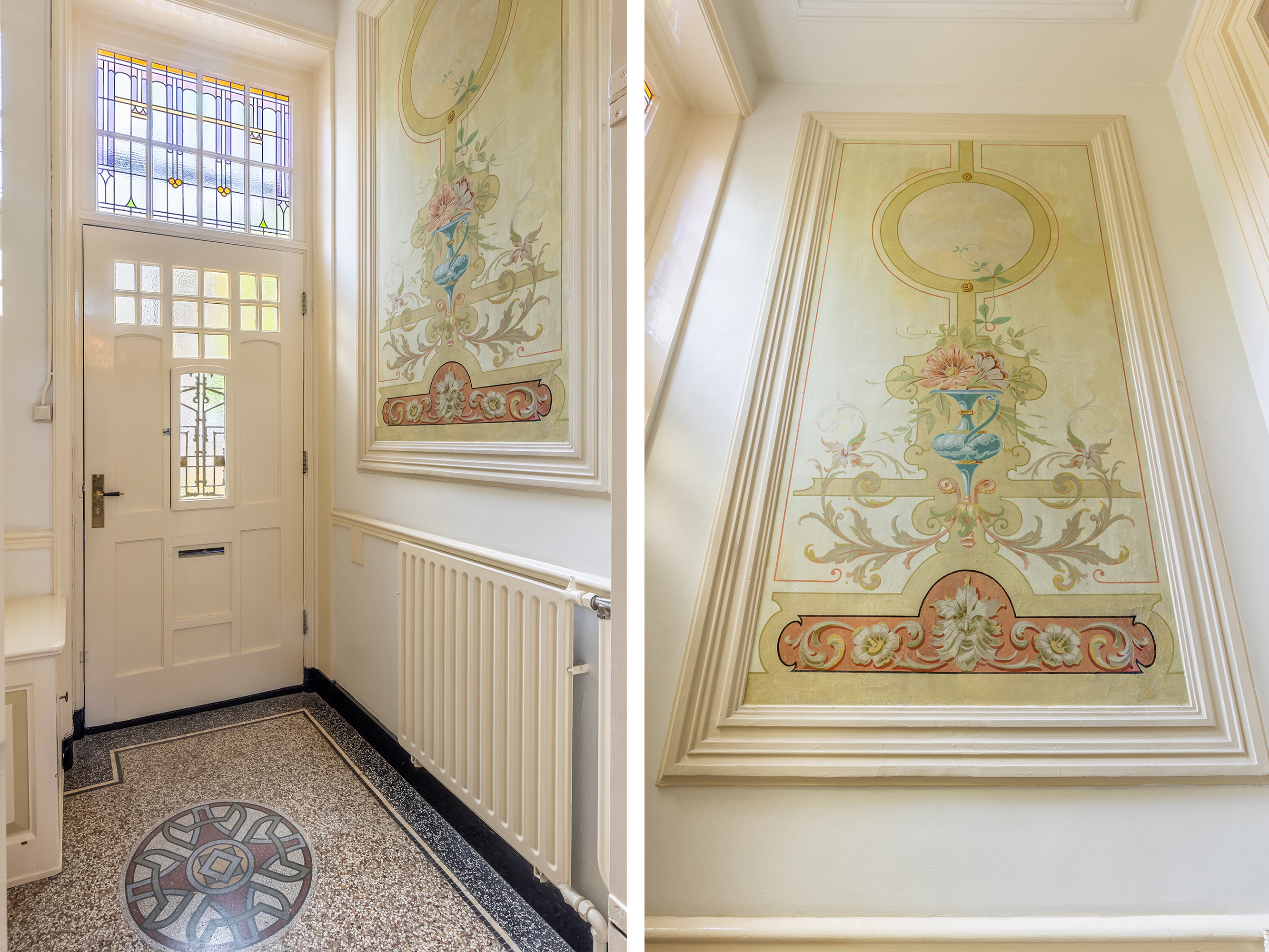 Aan de linkerzijde van de hal bevindt zich een ruime werkkamer, ideaal gelegen aan de voorzijde van de woning en voorzien van het unieke olieverfplafond in originele kleuren. Deze ruimte biedt rust en karakter, perfect als thuiskantoor of studieplek.