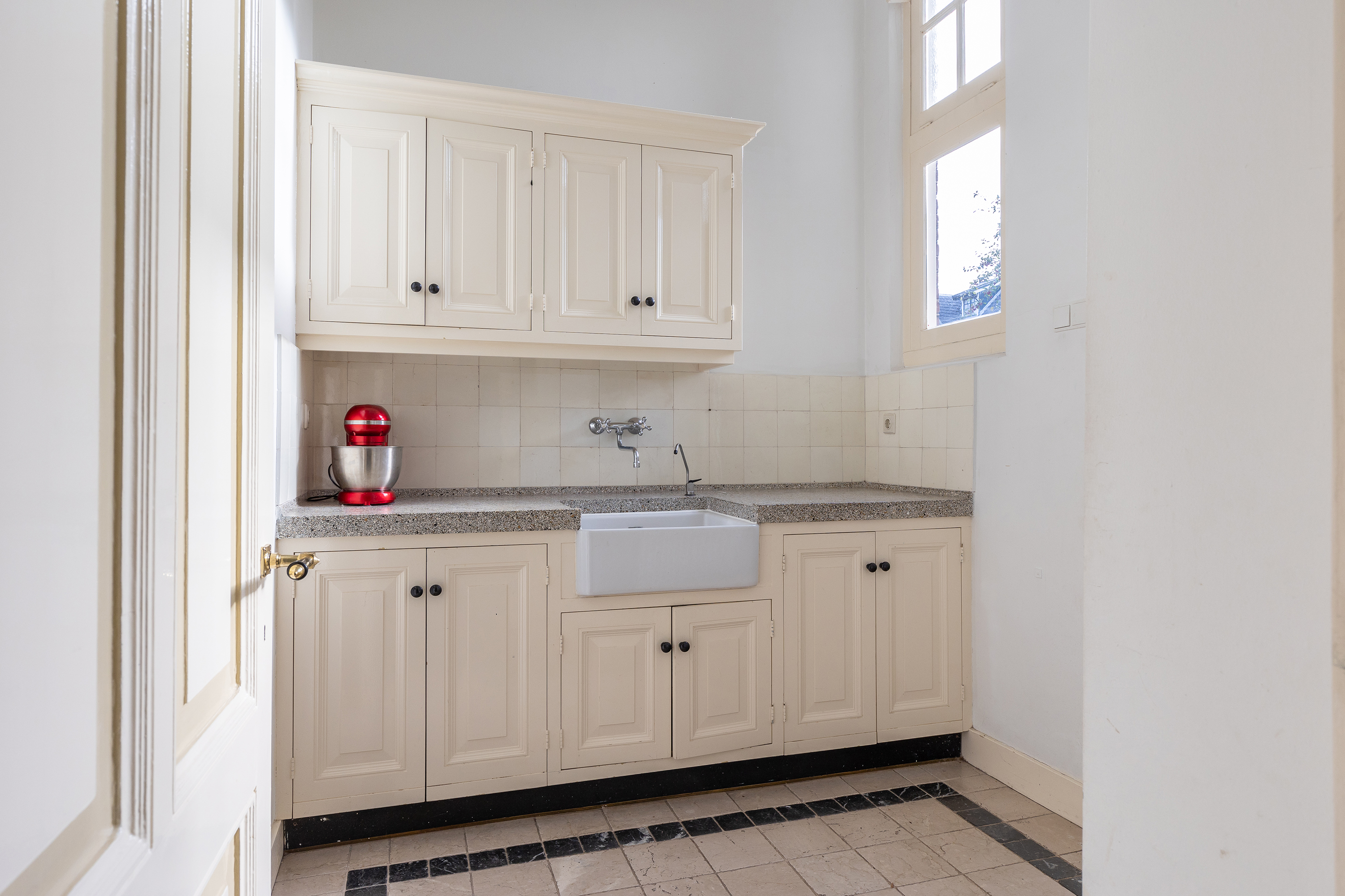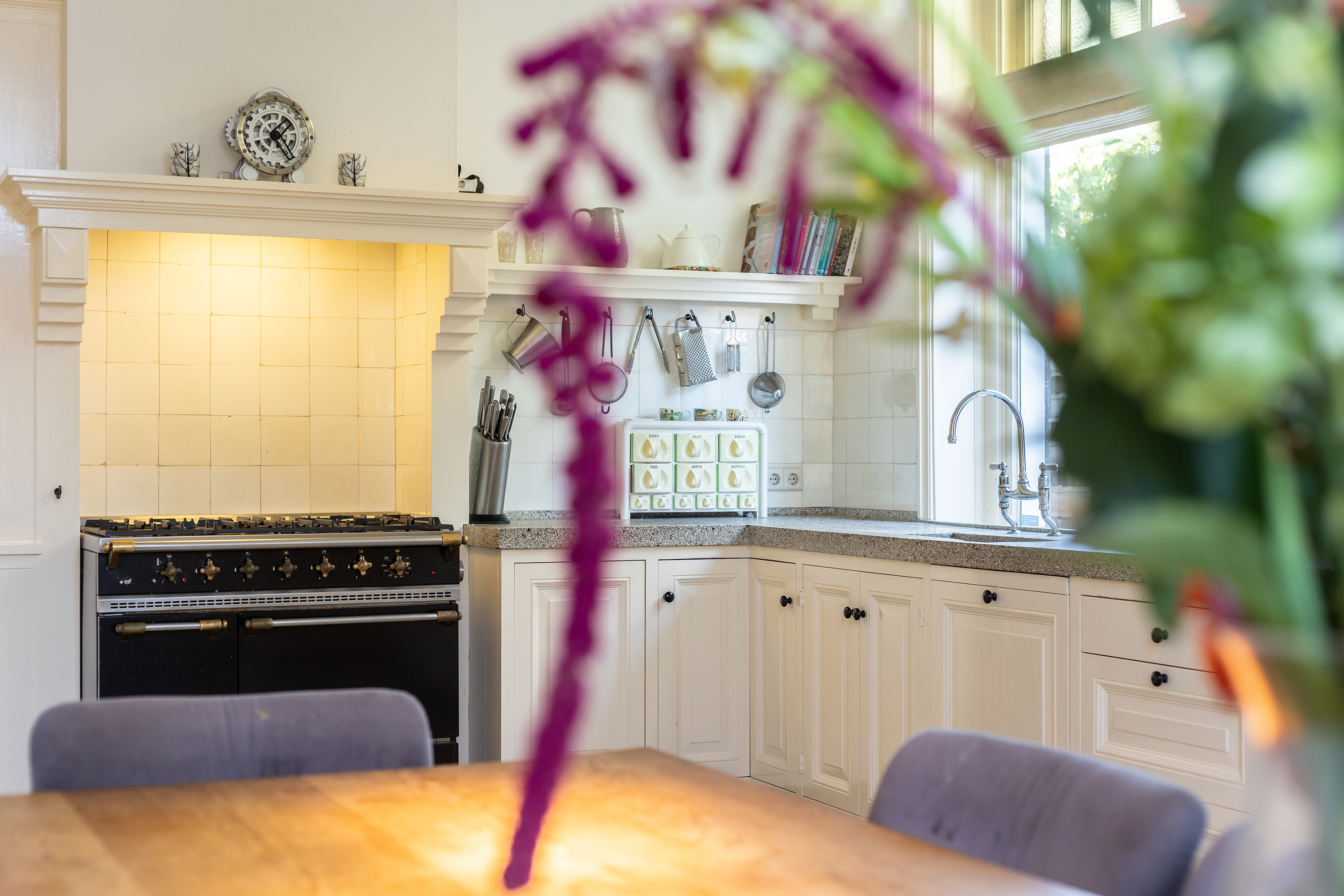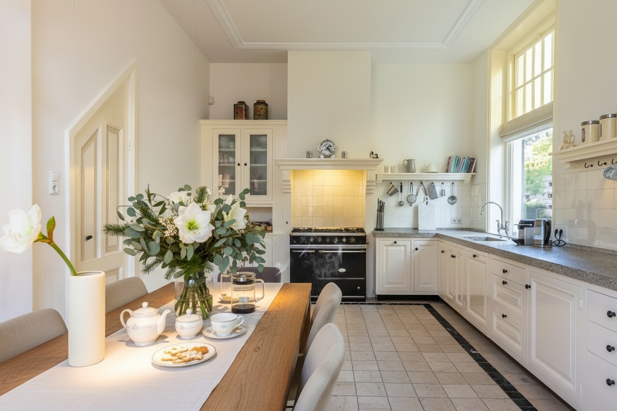 De woonkeuken is luxe uitgevoerd met maatwerk keukenkasten, afgewerkt in roomwit, en een granito aanrechtblad. In de schouw is een Lacanche gasfornuis met vijf pitten en twee ovens geplaatst. De keuken is ruim genoeg voor een grote eettafel, perfect voor gezellige diners met familie en vrienden. Naast de keuken bevindt zich de bijkeuken met wasmachine-aansluiting en toegang tot het terras.