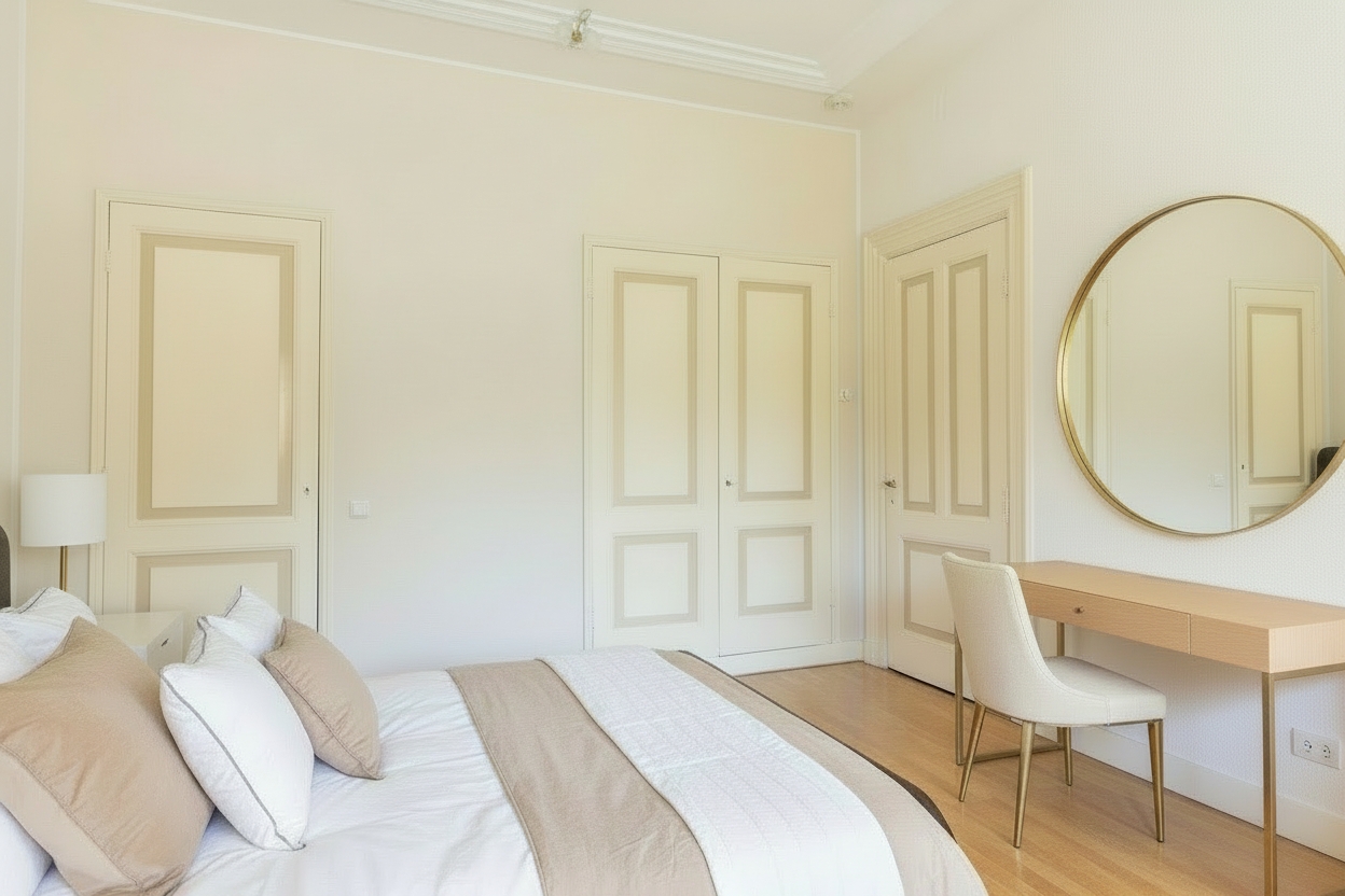 De eerste verdieping is bereikbaar via de monumentale bordestrap. Hier bevinden zich drie ruime slaapkamers, waarvan de master bedroom beschikt over twee balkons, één met loggia, en inbouwkasten. De moderne badkamer is voorzien van een inloopdouche, ligbad, dubbele wastafels met zuilen en elektrische vloerverwarming. Via openslaande deuren is er toegang tot het dakterras. Een aparte garderobekamer en een tweede toilet maken deze verdieping compleet.