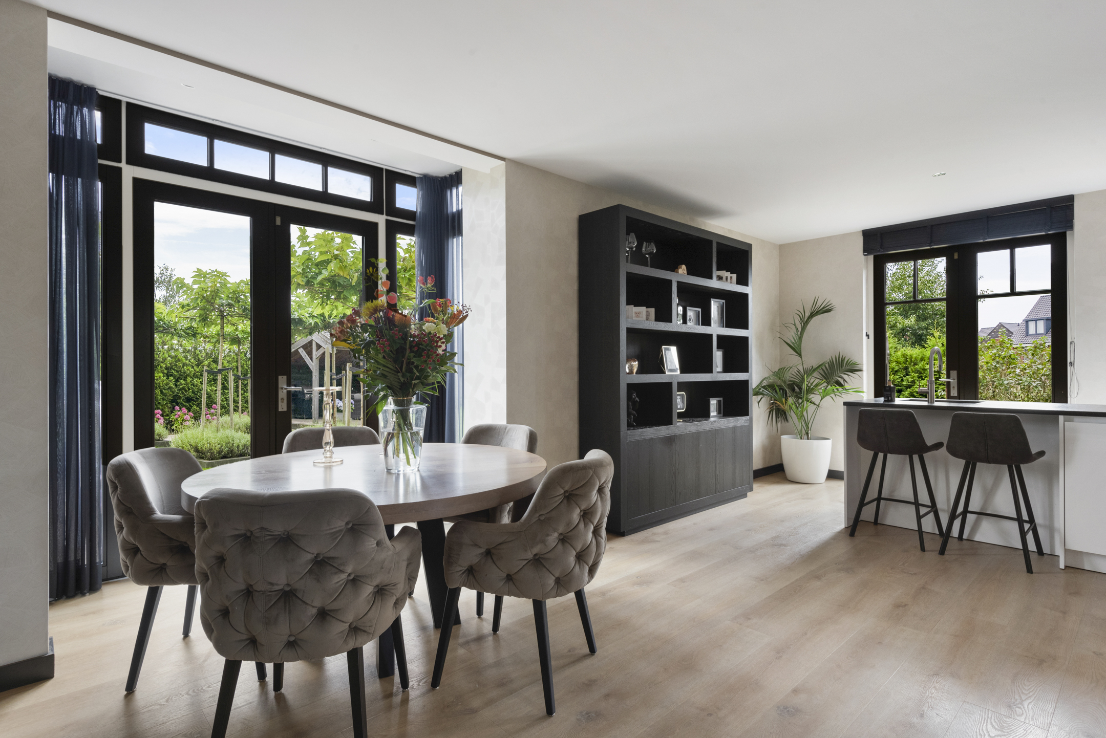 De ruime woon- en eetkamer biedt plek voor het hele gezin, met een op maat gemaakte cinewall en sfeervolle HR-gashaard voor extra warmte en gezelligheid.