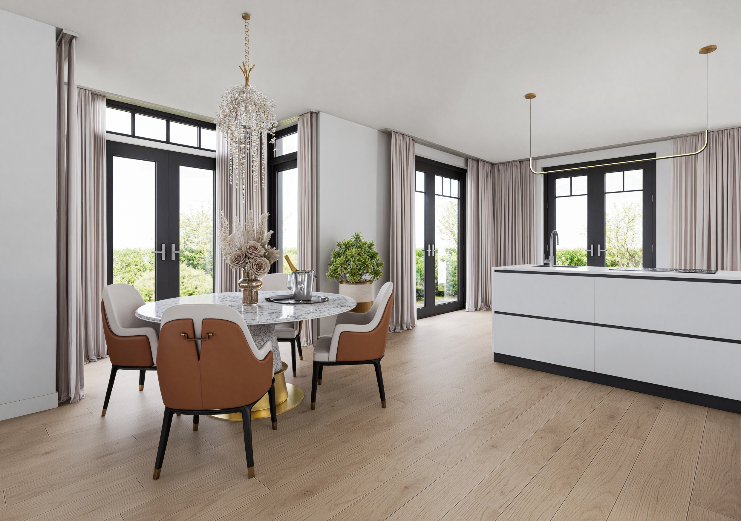 De luxe keuken met kookeiland is uitgerust met hoogwaardige inbouwapparatuur, waaronder een Miele stoomoven, wijnklimaatkoeling, Siemens combi oven, inbouwkoffiemachine, Bora inductiekookplaat met geïntegreerde afzuiging, Siemens vaatwasmachine en een koel- vriescombinatie.