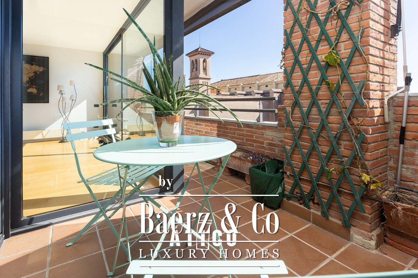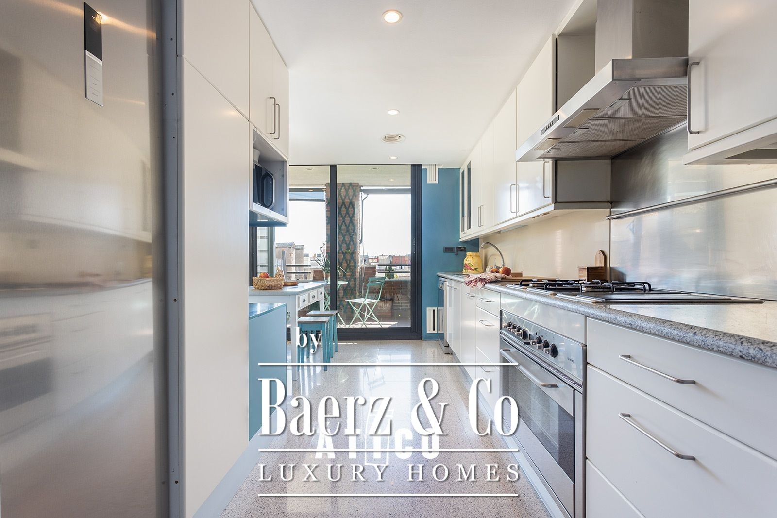 Dit duplex penthouse in Barcelona biedt 227 m² woonruimte, verdeeld over twee rustige niveaus in de sfeervolle wijk Sarrià. De eerste verdieping verwelkomt u met een royale woonkamer en eetruimte, een keuken met schuifdeuren die naar wens aanpasbaar is, en overvloedig daglicht dankzij de verhoogde ligging. Twee ruime slaapkamers delen een badkamer, wat zorgt voor een ontspannen ritme in het dagelijks leven.