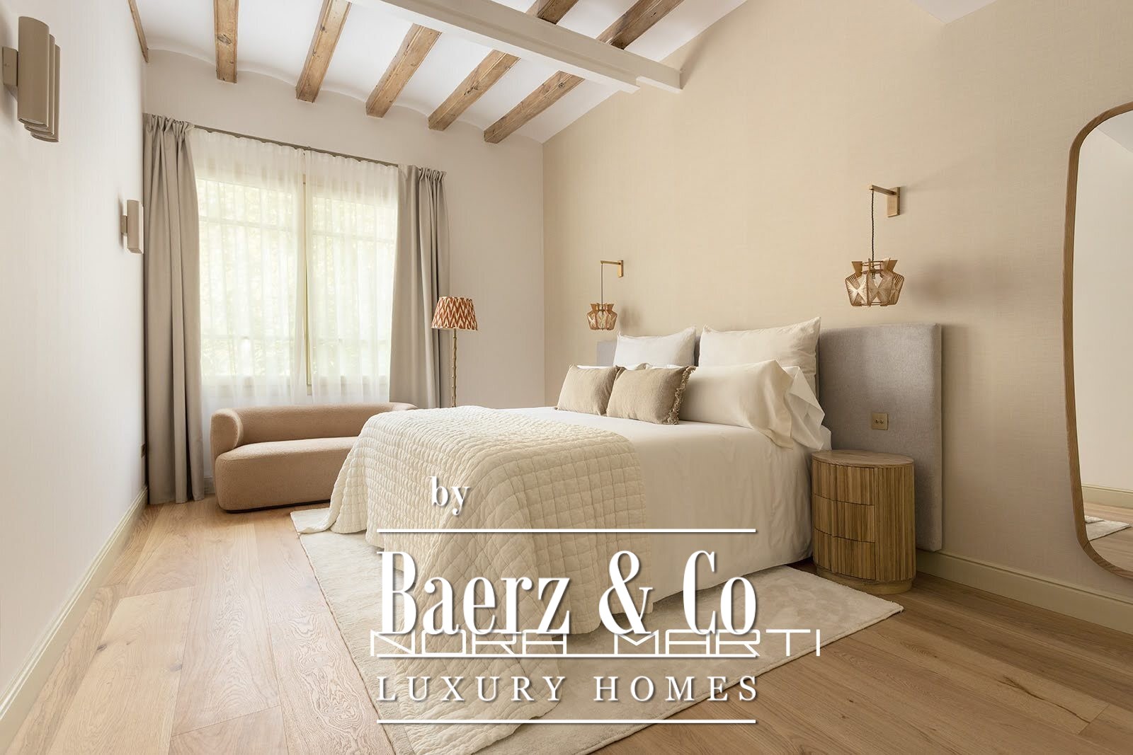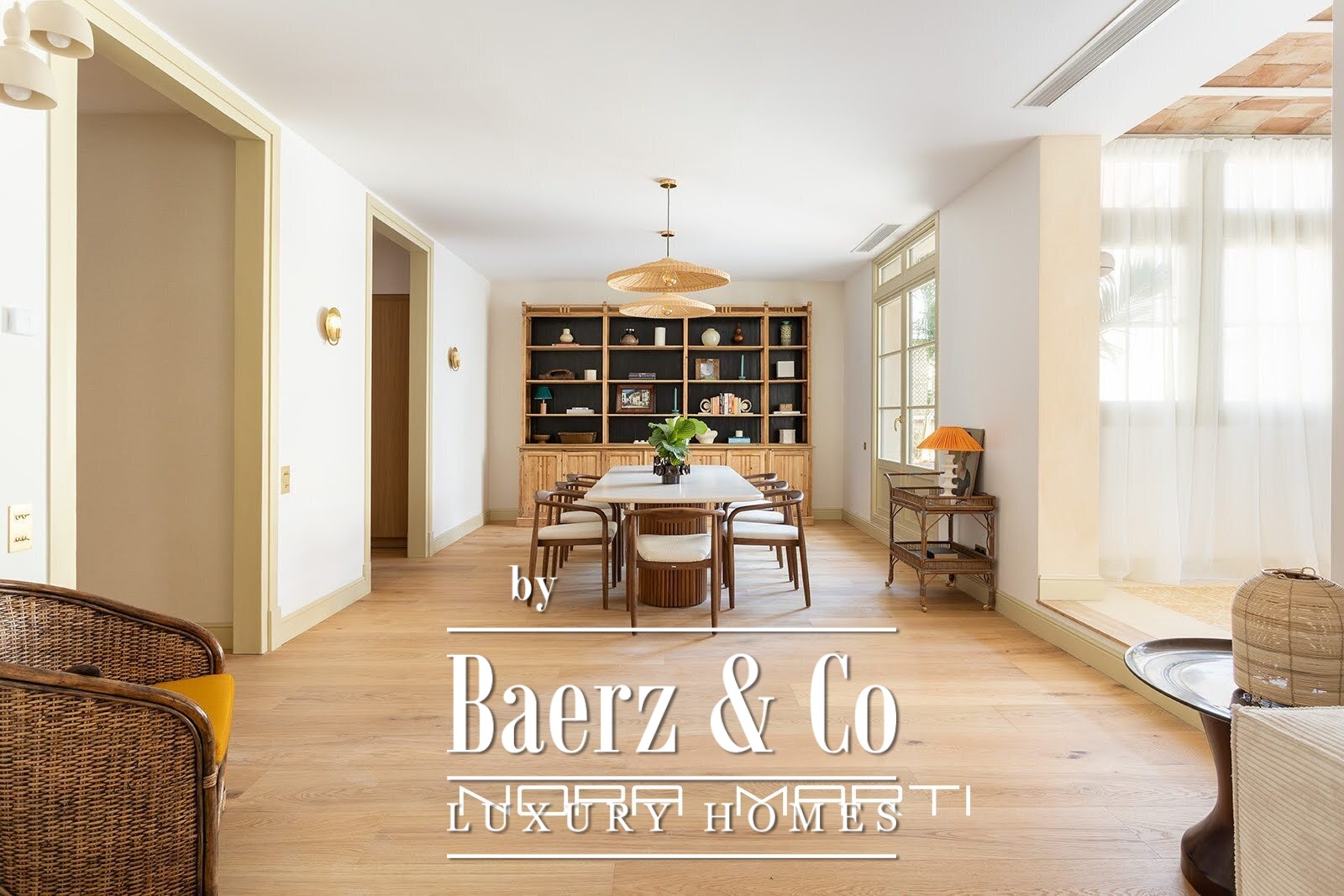 De woonkamer, voorzien van handgemaakte lokale tegels en hoge raampartijen, opent naar een rustige privéterras waar binnen- en buitenleven naadloos samensmelten. De volledig gemoderniseerde keuken beschikt over een wijnkelder, grote oven en royale eetruimte, uitstekend geschikt voor zowel dagelijks gebruik als voor het ontvangen van gasten. Het interieur weeft natuurlijke elementen met subtiele elegantie; brede planken van eikenhout, vloerverwarming en een twee-zone klimaatsysteem geven het geheel permanent comfort.
