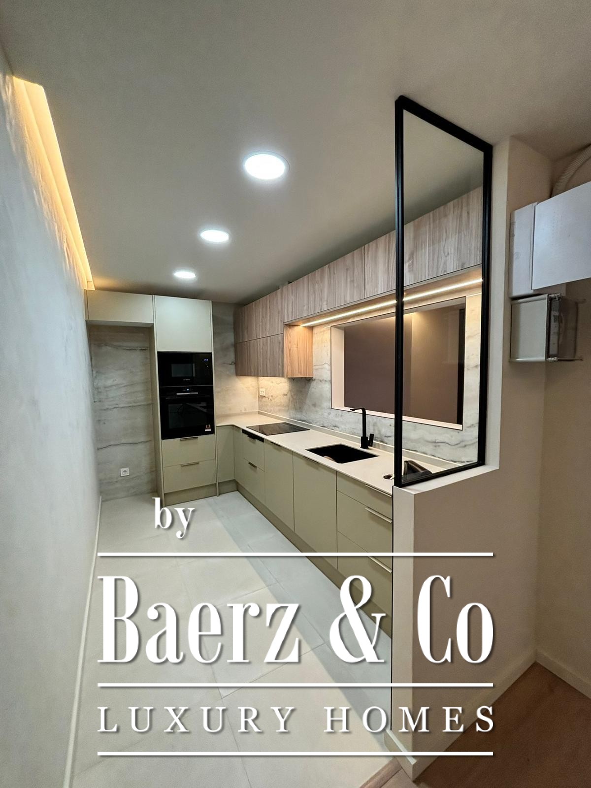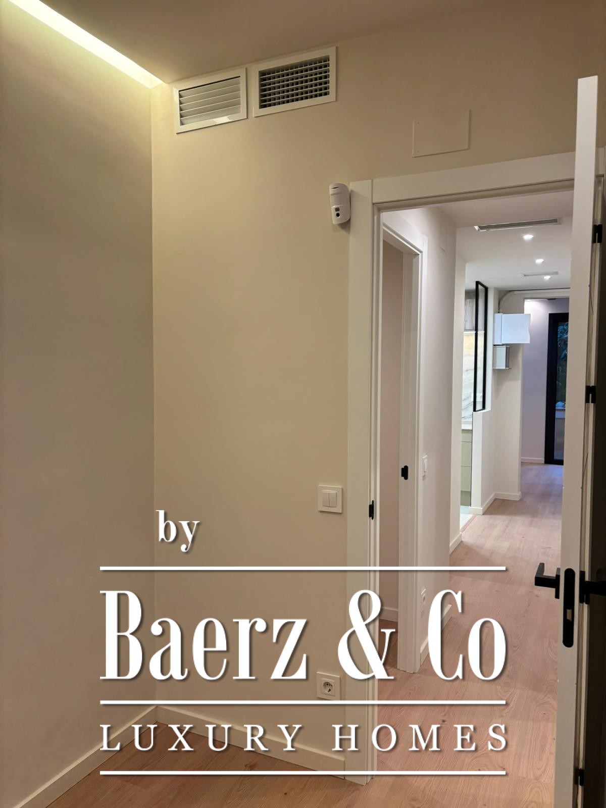 De woonkamer en eetkamer liggen op het oosten en ontvangen het ochtendlicht, met uitzicht op het rustige park wat een serene sfeer geeft. De aparte keuken, die deels open is naar het leefgedeelte, beschikt over Bosch apparatuur en marmerlook afwerkingen die doorlopen in de gang, waardoor visuele harmonie ontstaat. Katalaanse gewelfde plafonds benadrukken de architectonische waarde, terwijl centrale airconditioning, dubbele beglazing en hoogwaardige LED-verlichting voorzien in hedendaags wooncomfort.