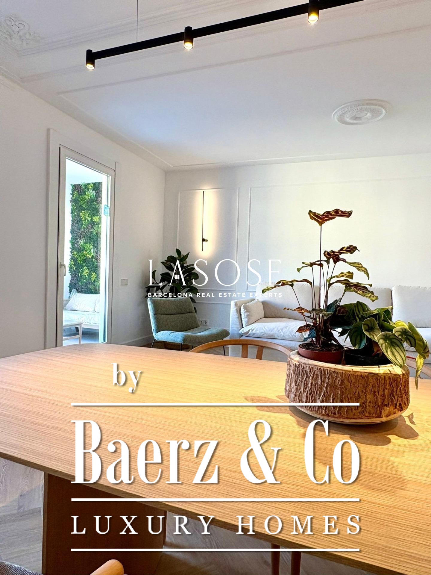 Originele hoge plafonds, sierlijke plafonddetails en traditionele dubbele houten deuren weerspiegelen het architecturale erfgoed van Barcelona, terwijl de royale multifunctionele woon-, eet- en keukenruimte baadt in natuurlijk licht en directe toegang biedt tot een privéterras van 18 m². Het terras is ingericht als lounge en eetruimte en verbindt zo het binnenleven naadloos met het befaamde buitenleven van de stad.