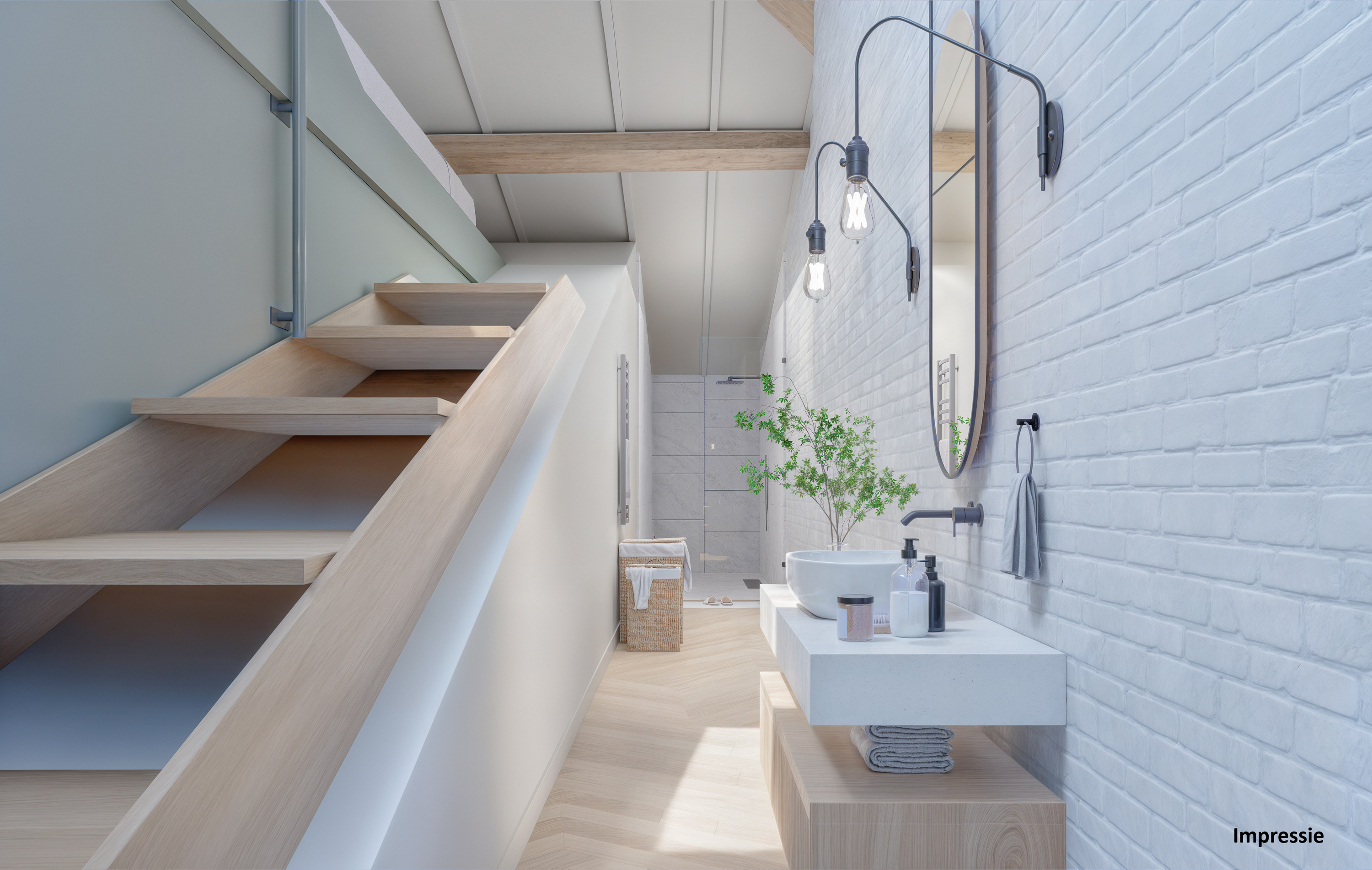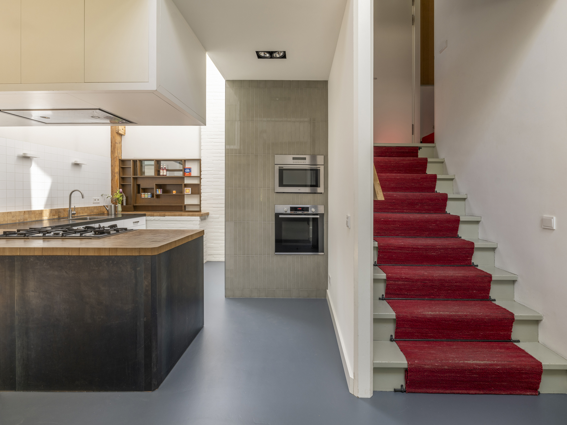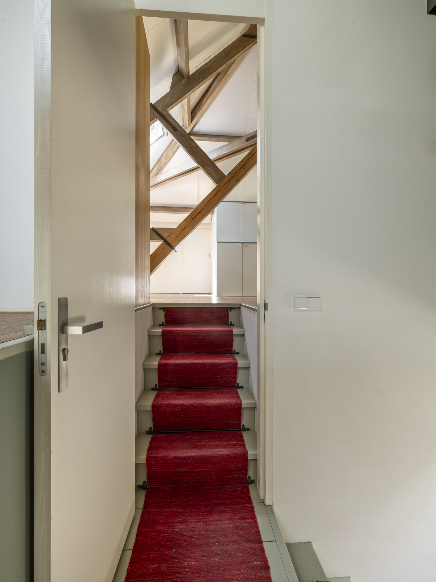 Moderne bordestrap onder de originele kapconstructie van het huis. Voorts toegang tot;