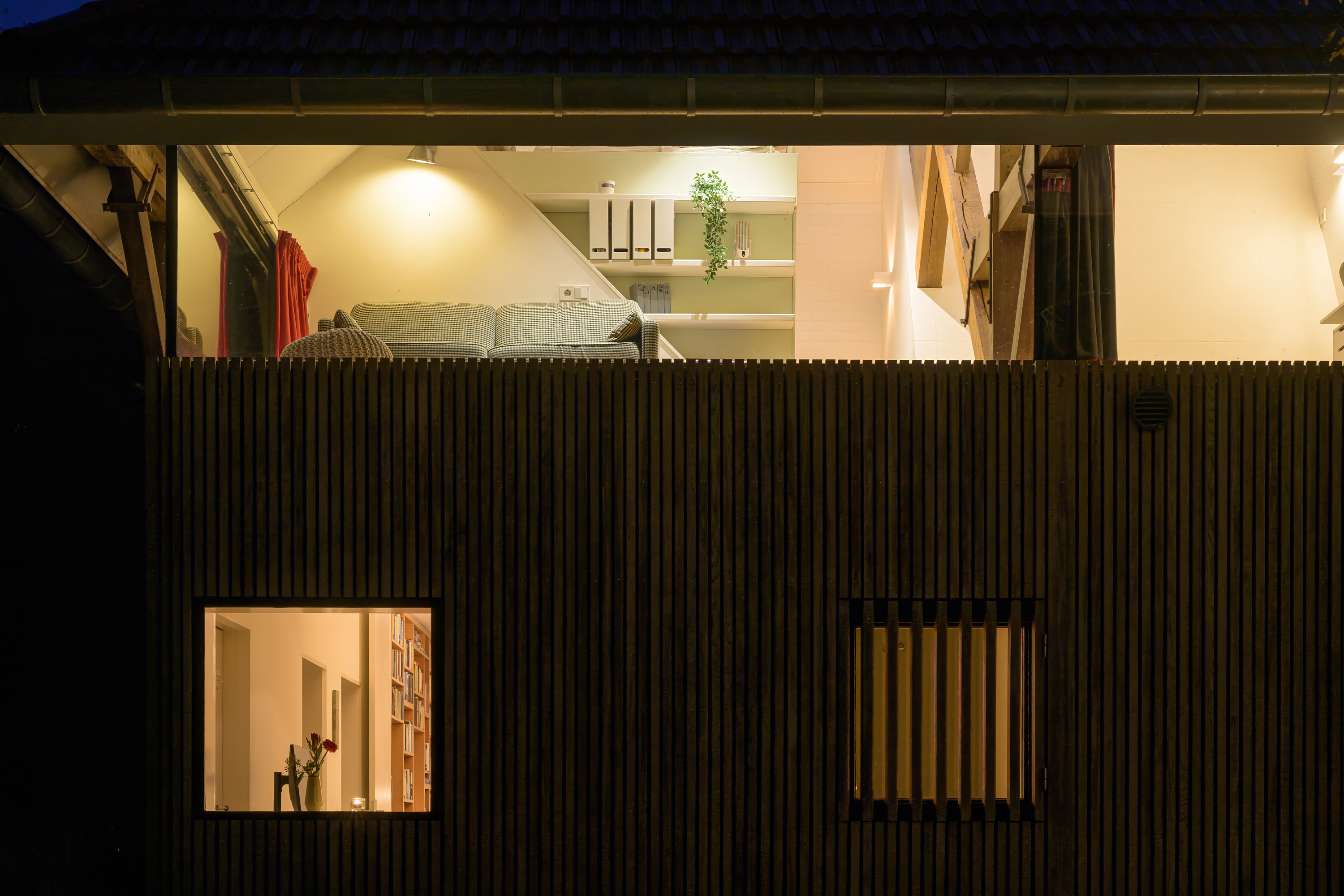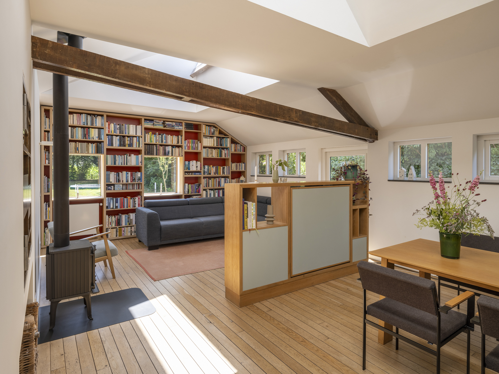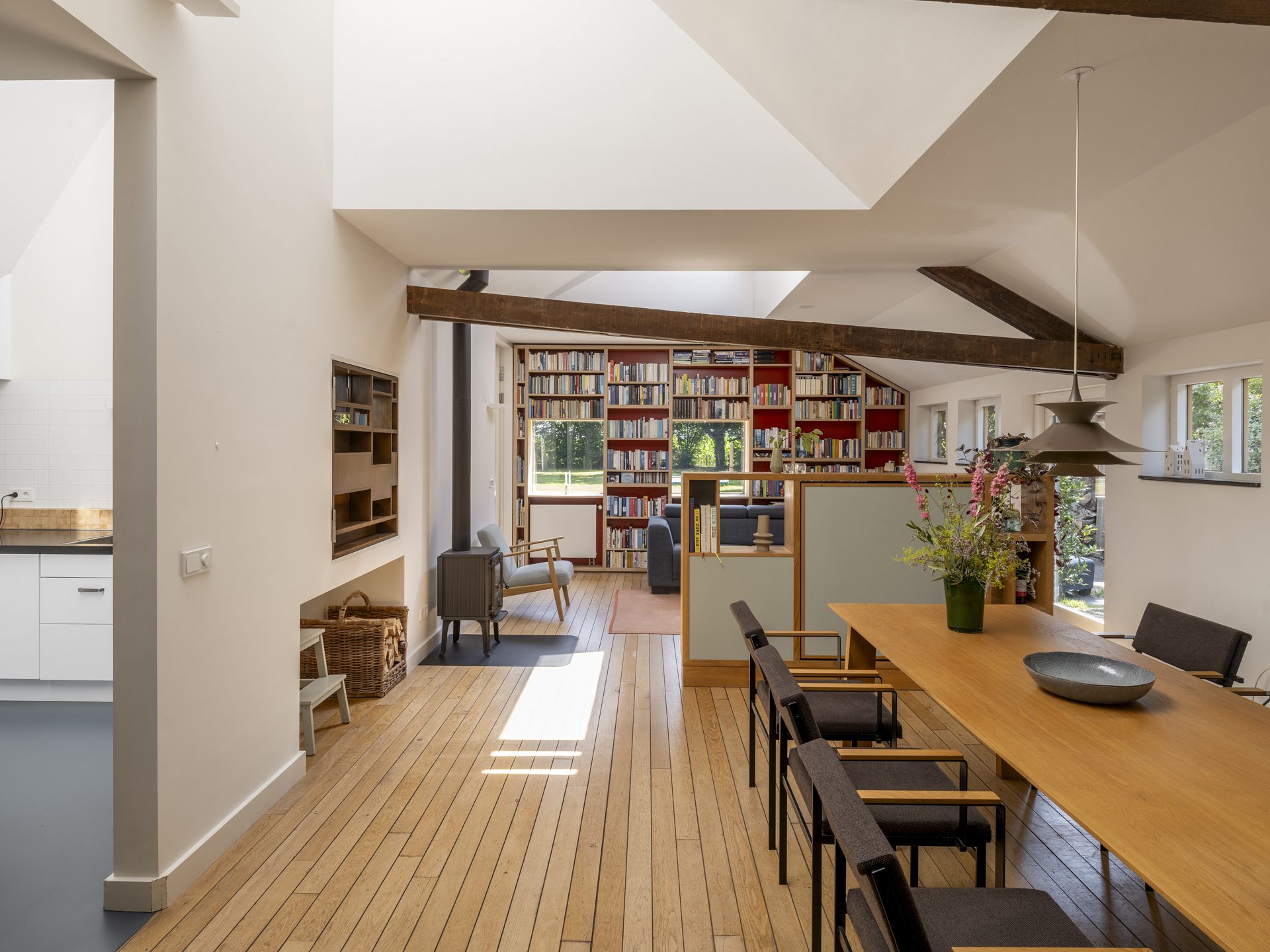 Onder leiding van architect Henri Borduin (borderarchitecture.com) is bij de verbouwing tot modern woonhuis bijzonder veel aandacht besteed aan details en lichtinval. Het oorspronkelijk karakter van de schuur is behouden gebleven, maar tegelijkertijd is deze getransformeerd tot een comfortabele, eigentijdse woning. Taps toelopende lichtkernen verbinden de ruimtes op de begane grond met het dak. Deze lichtkernen zijn zo geplaatst dat de bestaande draagstructuur en spanten een zichtbaar onderdeel van de woning vormen.