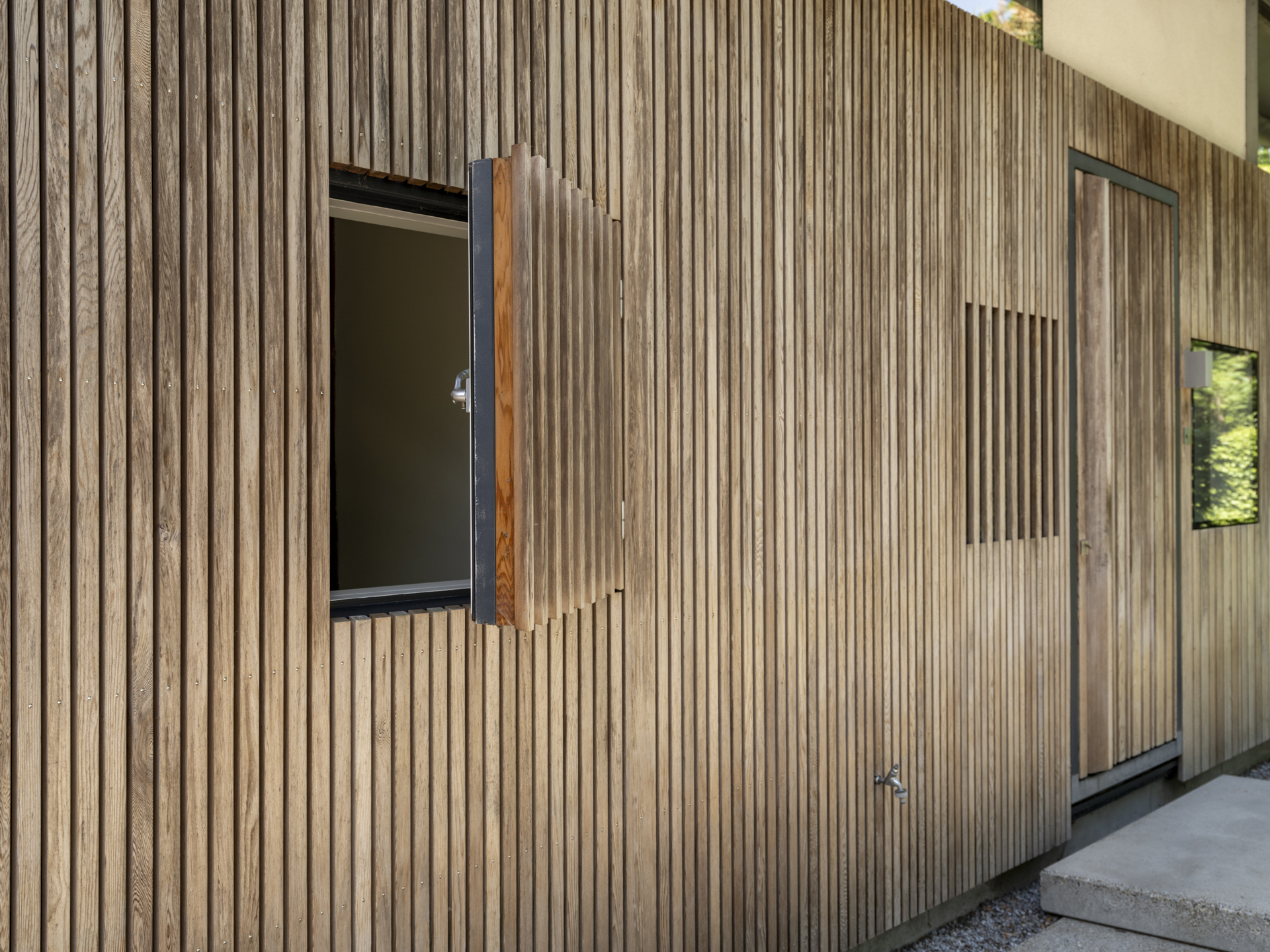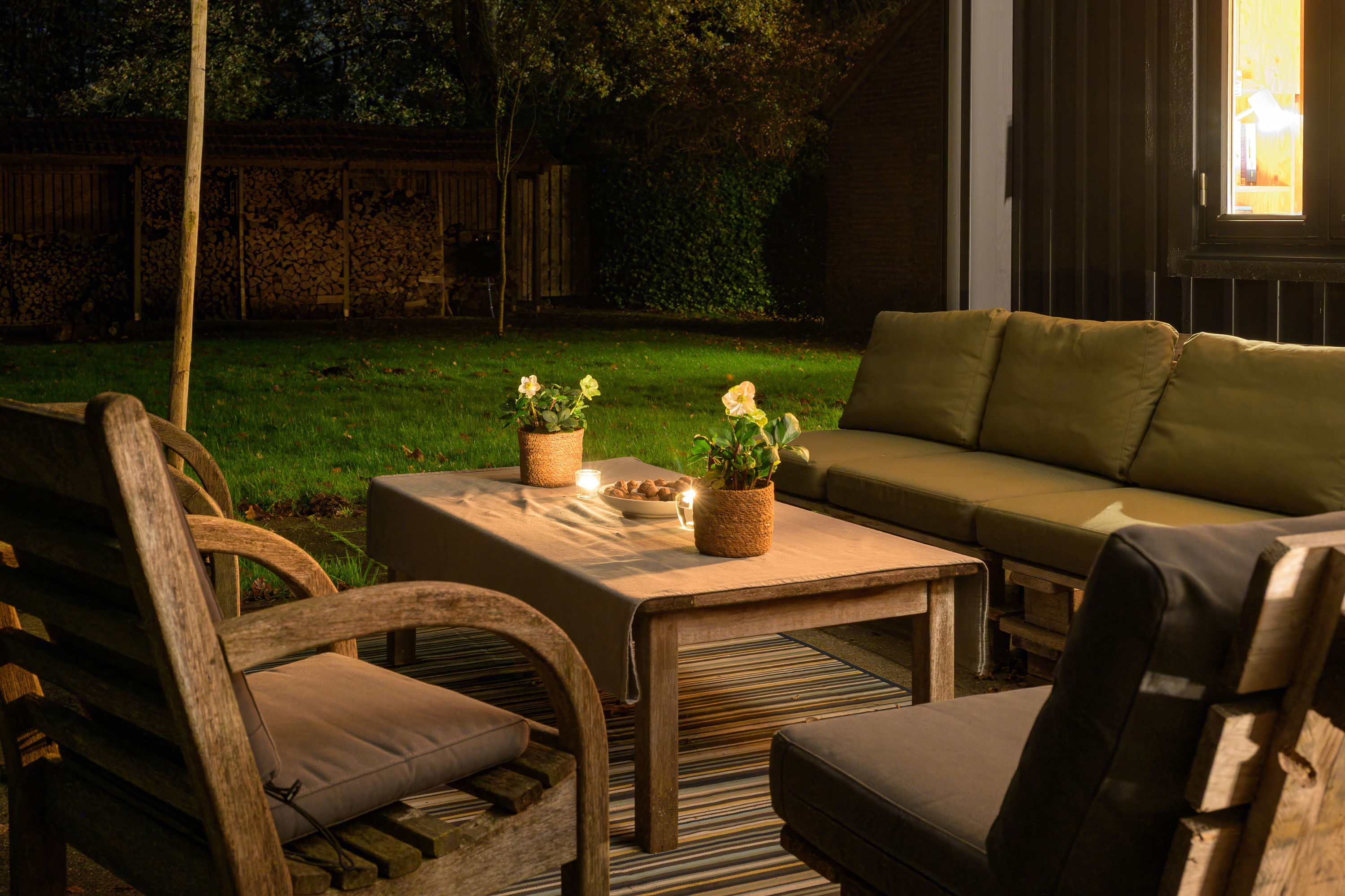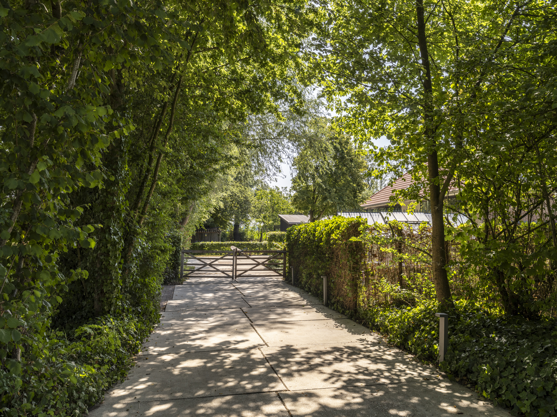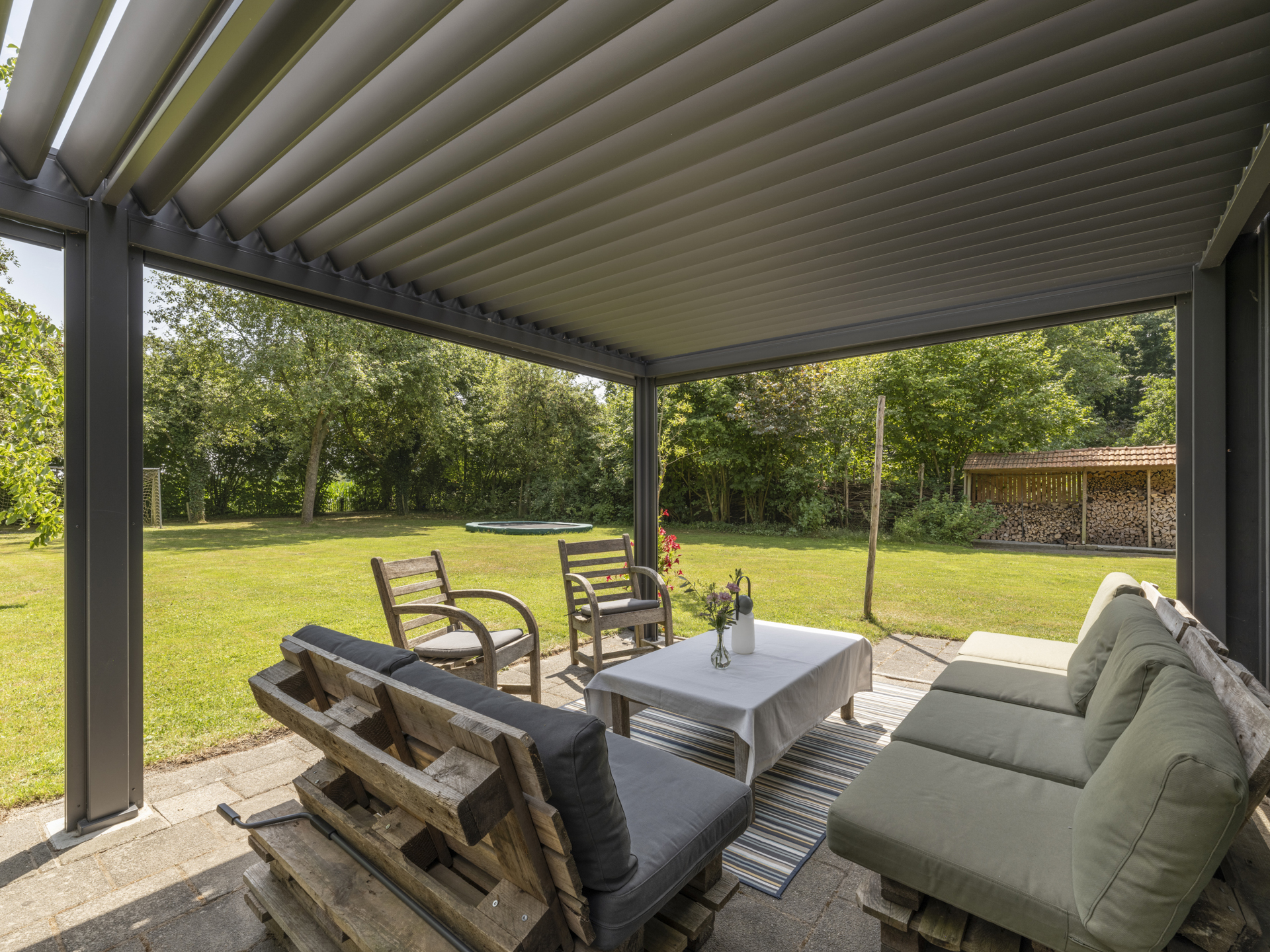 Aan dit bijgebouw is in 2025 een zeer degelijke overkapping geplaatst, een heerlijk verlengstuk van de leefruimte in de tuin. Het dak is te openen en sluiten (een lamellen-systeem), zowel voor lichttoetreding als bescherming tegen regen. Tevens is de overkapping voorzien van uitschuifbare windschermen.