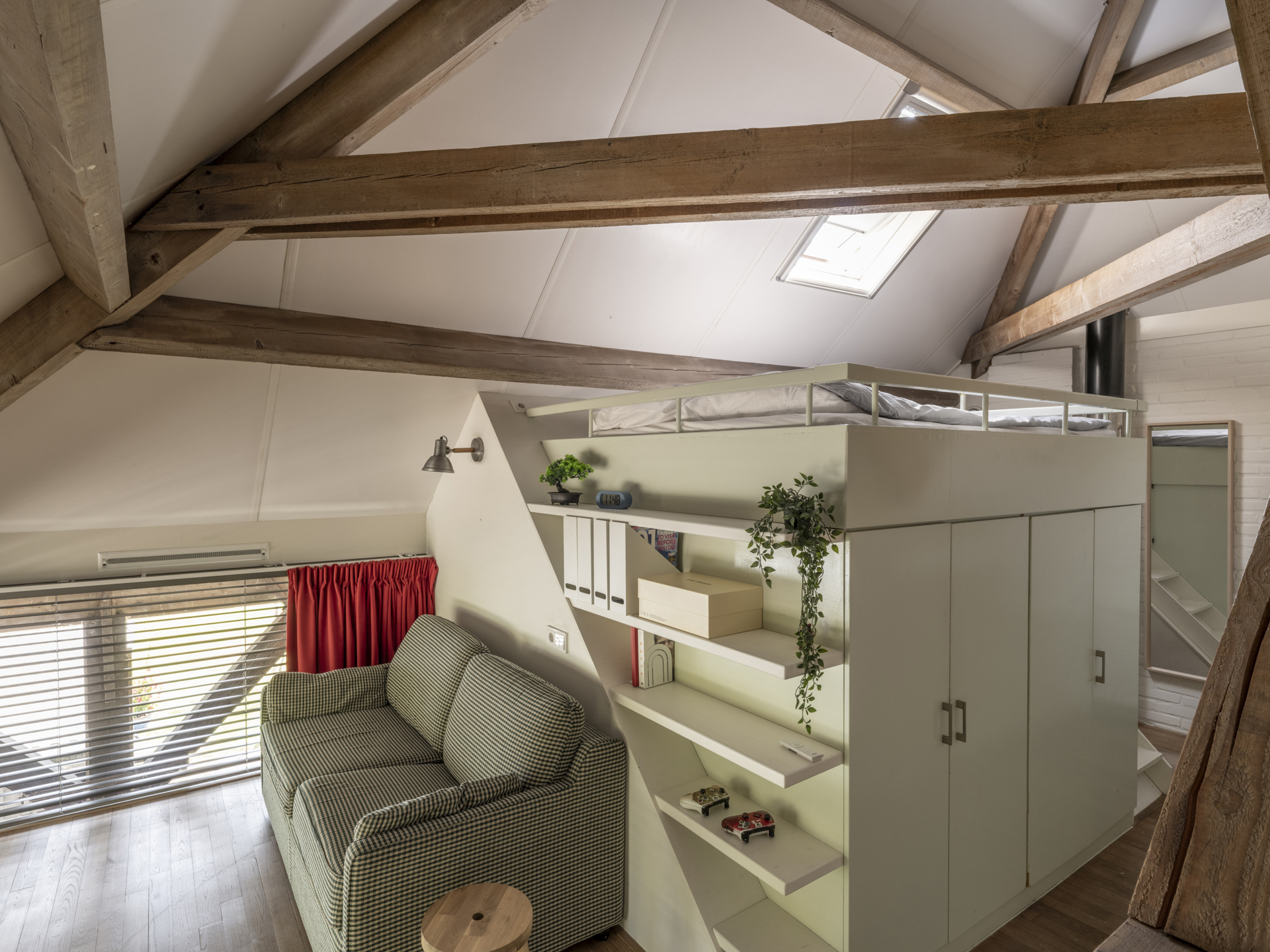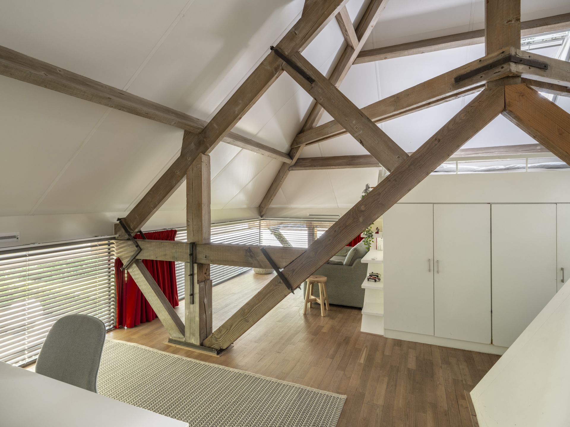 Slaapkamer, in de nok van de kapconstructie is een hoogslaper met daaronder kastruimte geplaatst. In beide slaapkamers bestaat de mogelijkheid een (tweede/derde) badkamer te realiseren.