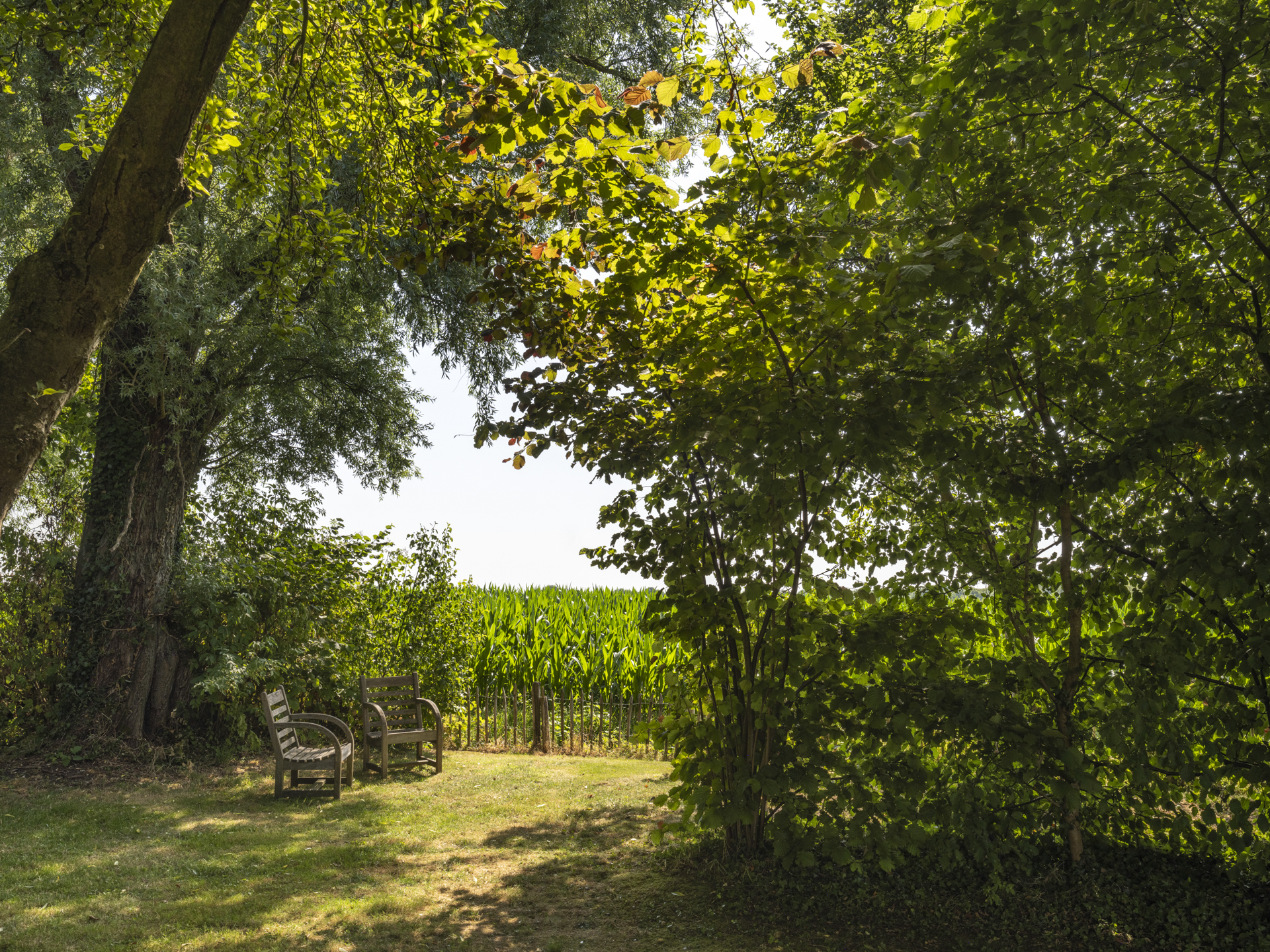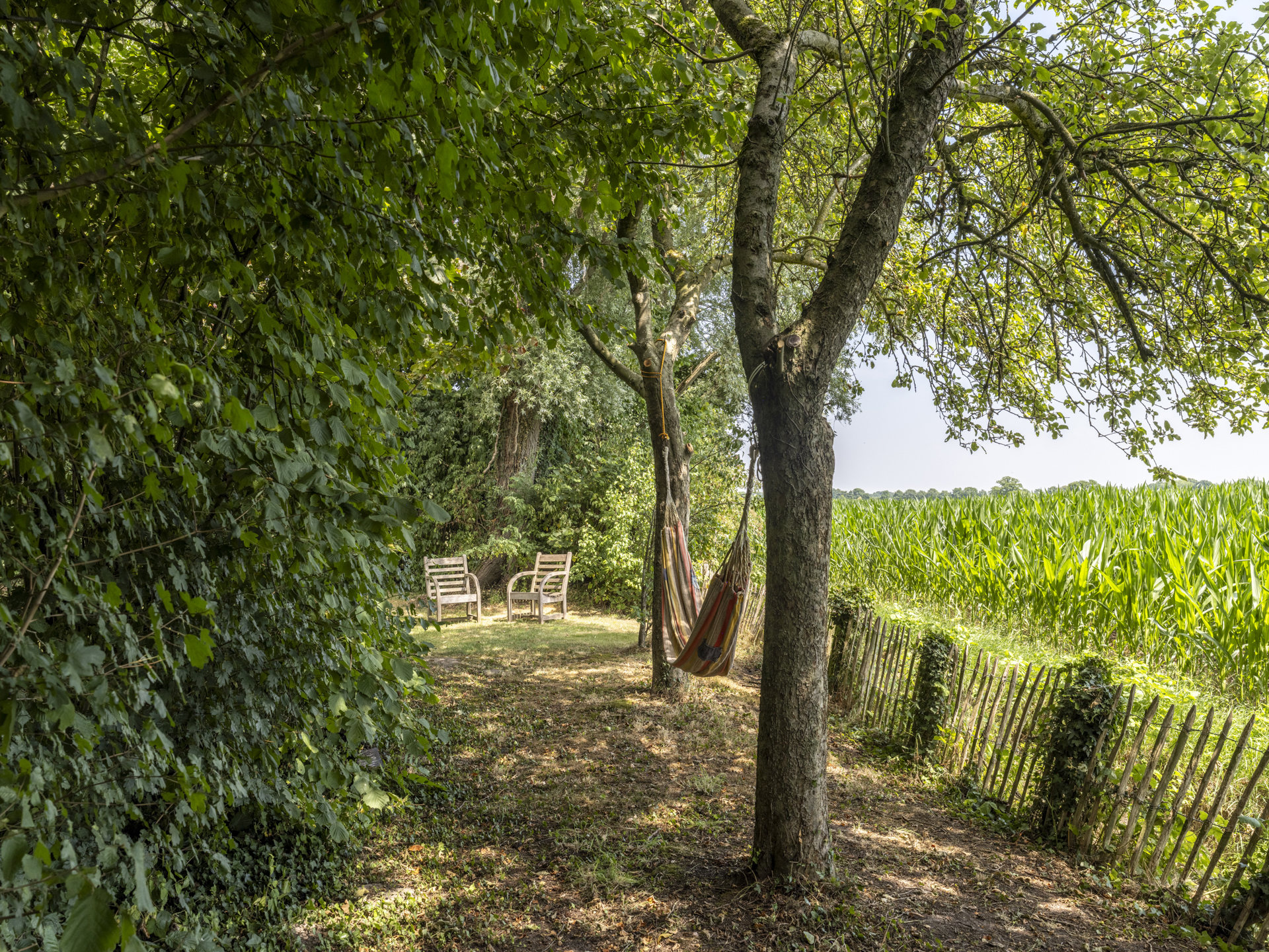 De tuin biedt zeer veel privacy en beschikt over diverse terrassen, waarvan één overkapt. Verder is de tuin rijk aan diverse boomsoorten; noten, eiken, amandel en hoogstamfruitbomen.