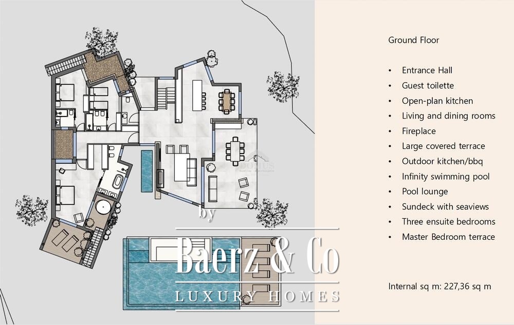 Met een perceel van meer dan 2.310 m² is de villa ontworpen om op natuurlijke wijze op te gaan in de mediterrane omgeving. De moderne architectuur, met strakke lijnen en grote ramen, zorgt voor veel natuurlijk licht. Meerdere terrassen en buitenruimtes nodigen uit om het hele jaar door van het buitenleven te genieten.