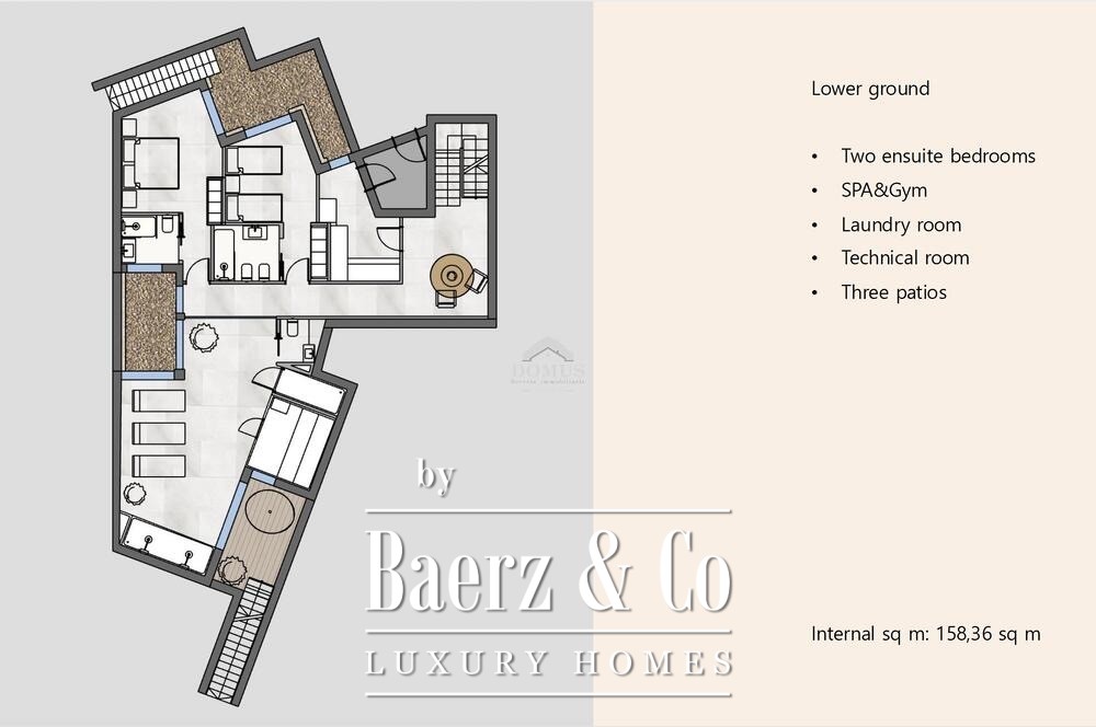 Benedenverdieping: ontworpen voor ontspanning en functionaliteit, met een kantoor dat uitkomt op een patio, een personeelskamer, een wellnessruimte (fitness, sauna, jacuzzi) en een bioscoopzaal. Opslagruimtes en een wasruimte maken het geheel compleet.