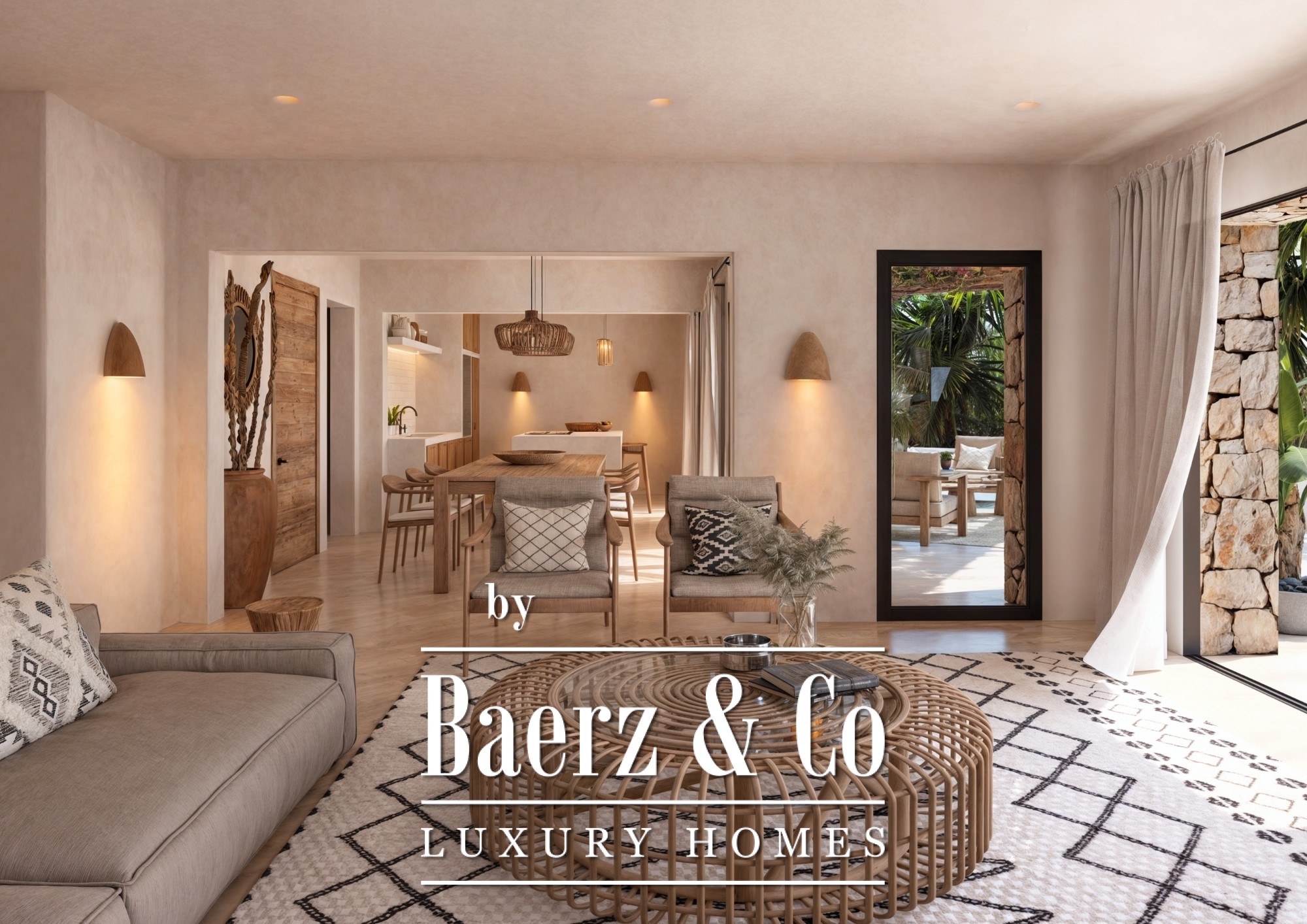 De architectuur is strak en hedendaags, maar dankzij natuurlijke materialen, zachte kleuren en warme texturen straalt de woning een uitnodigende, huiselijke sfeer uit. Grote raampartijen zorgen voor een vloeiende overgang tussen binnen en buiten, zodat je op elk moment van de dag kunt genieten van het uitzicht op je eigen tuin, het zwembad en de zee. De ruime en lichte leefruimte vormt samen met de moderne open keuken – voorzien van hoogwaardige apparatuur – het kloppende hart van de villa. Vanuit de woonkamer wandel je moeiteloos naar het zonnige terras en de sfeervolle naya, waar je een privézwembad, verschillende loungeplekken en een stijlvolle buitenkeuken uitnodigen tot ontspanning en gezelligheid.