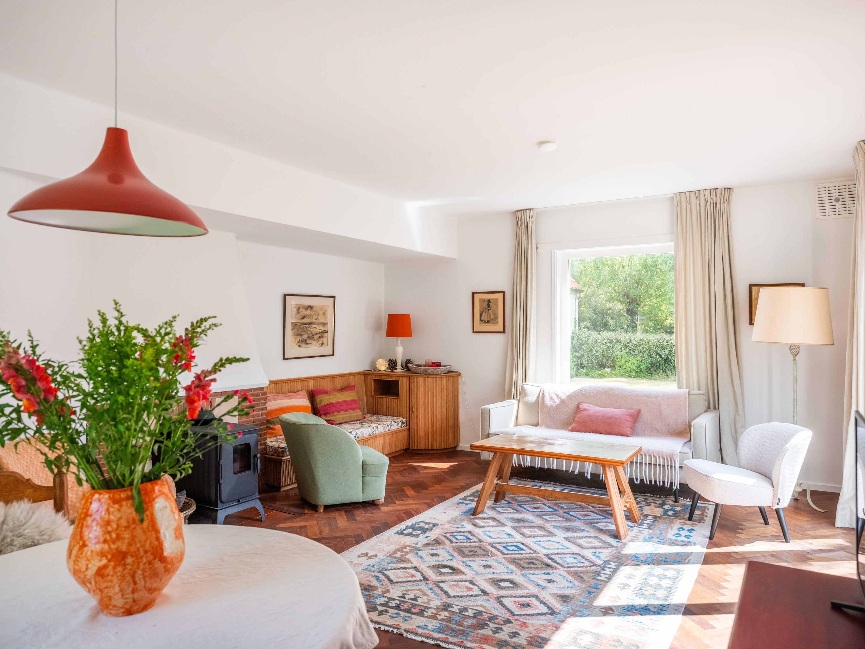 We nemen u mee naar binnen. Bij binnenkomst valt direct de fraaie entreehal op met een stijlvolle trapopgang met smeedijzeren leuning, een moderne toiletruimte en een handige kelderkast. De woonkamer is licht en sfeervol met een originele houten parketvloer, een houtkachel en openslaande tuindeuren naar de groene tuin. Ingebouwde houten maatwerkkasten zorgen voor extra charme én bergruimte.