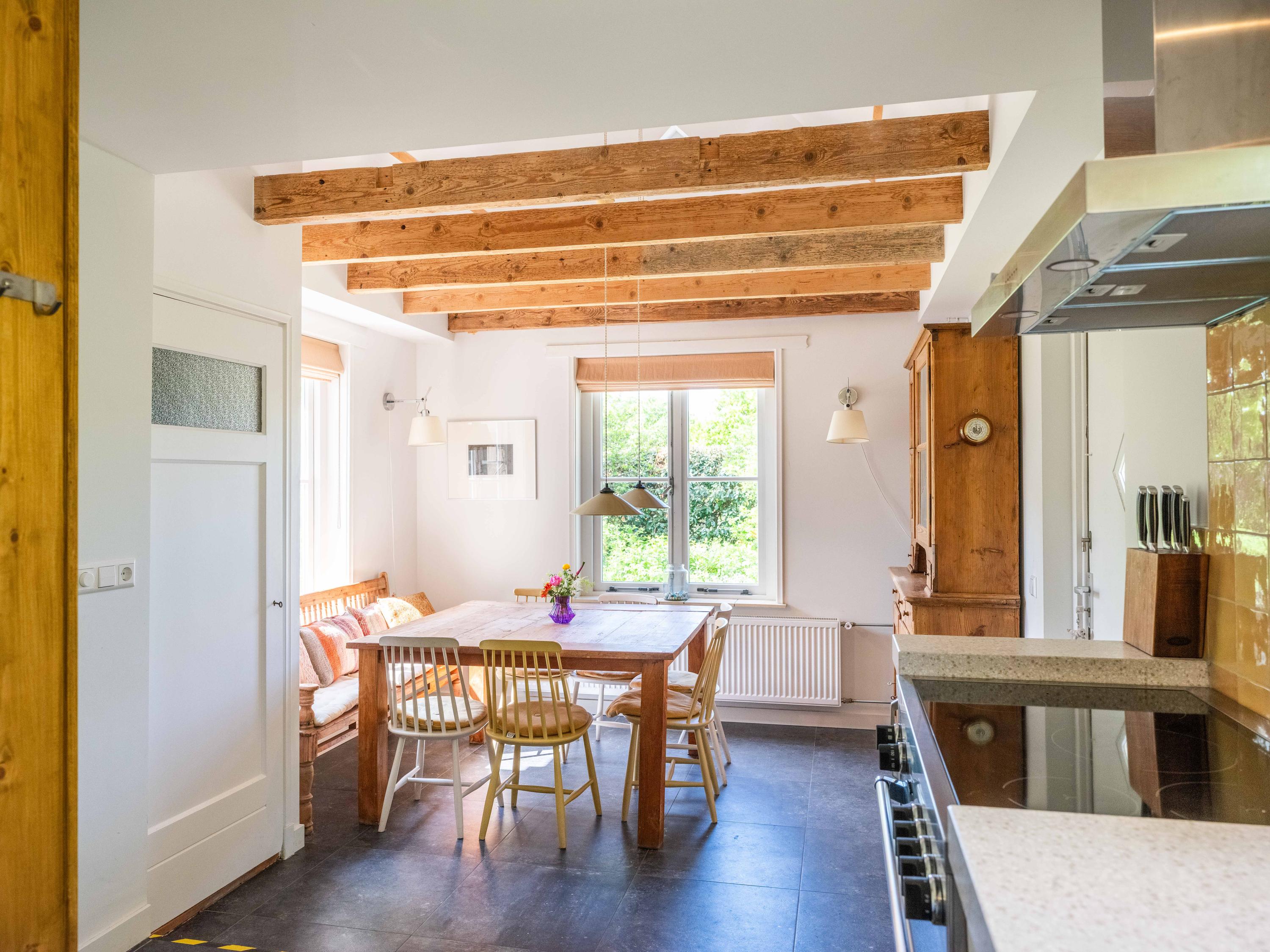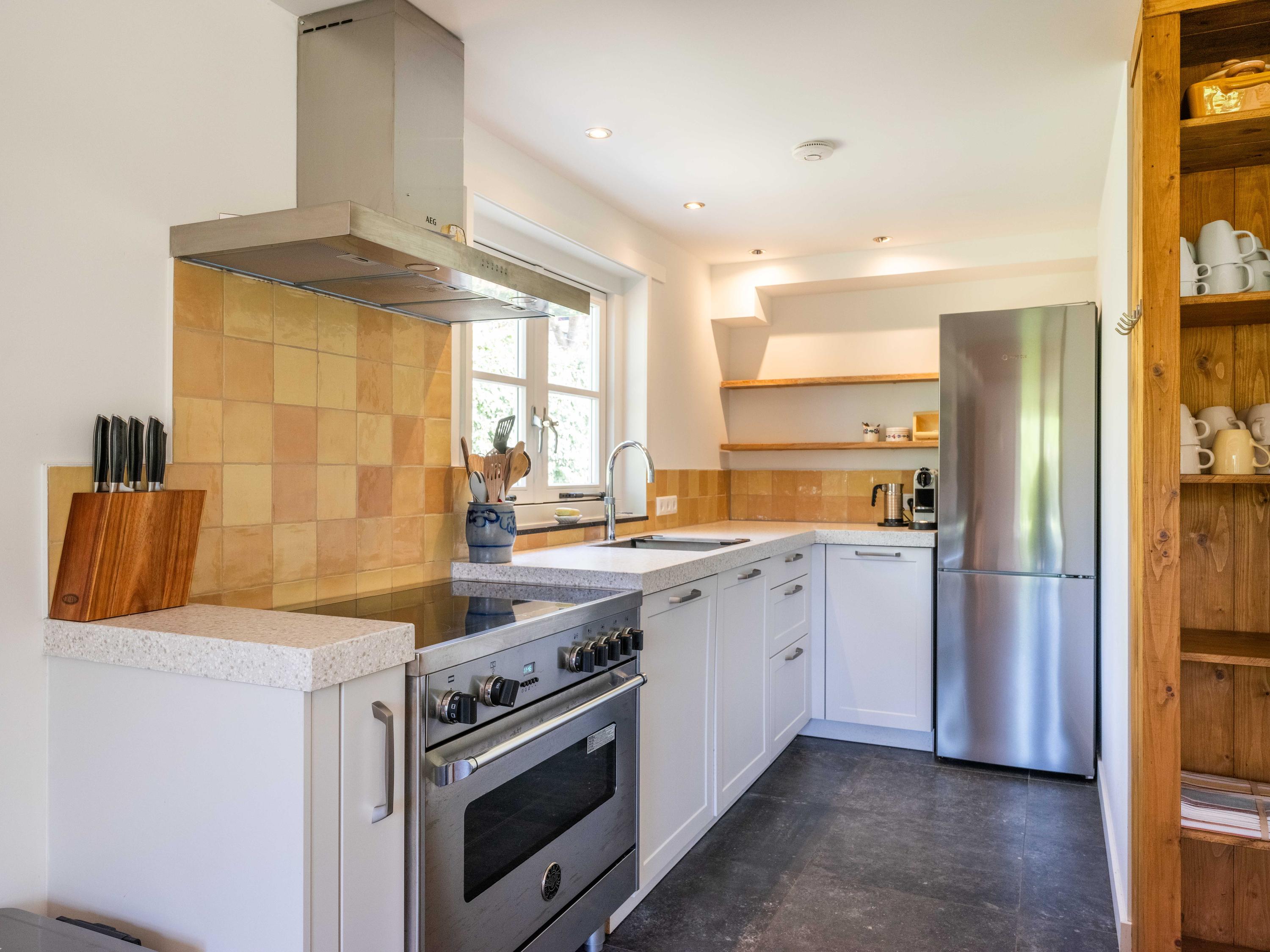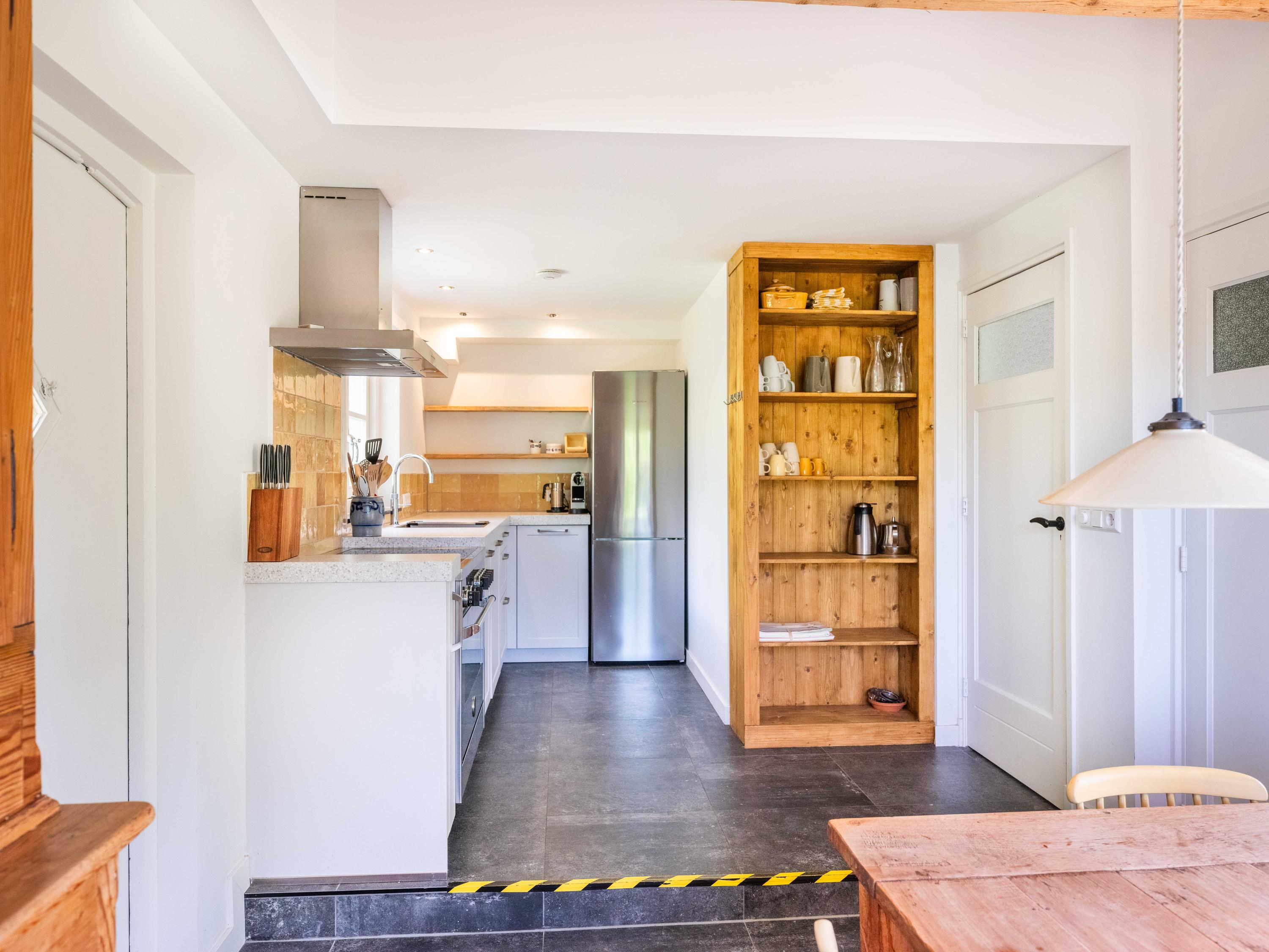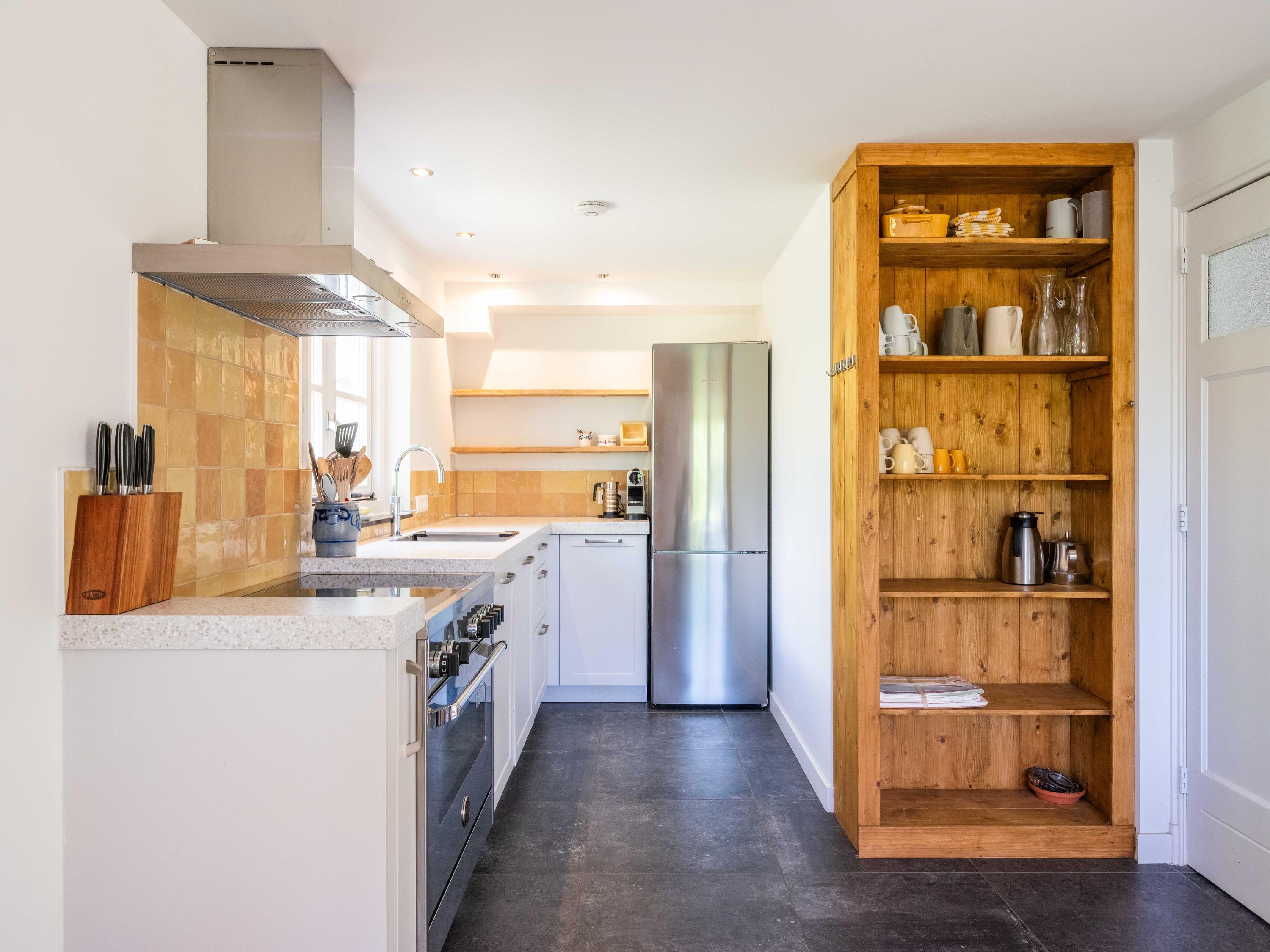De woonkeuken is een fijne plek voor het hele gezin, voorzien van alle gemakken: een quooker, vaatwasser, afzuigkap, grote oven met inductiekookplaat en een losse koel-vriescombinatie. Vanuit de keuken is ook toegang tot de meterkast.