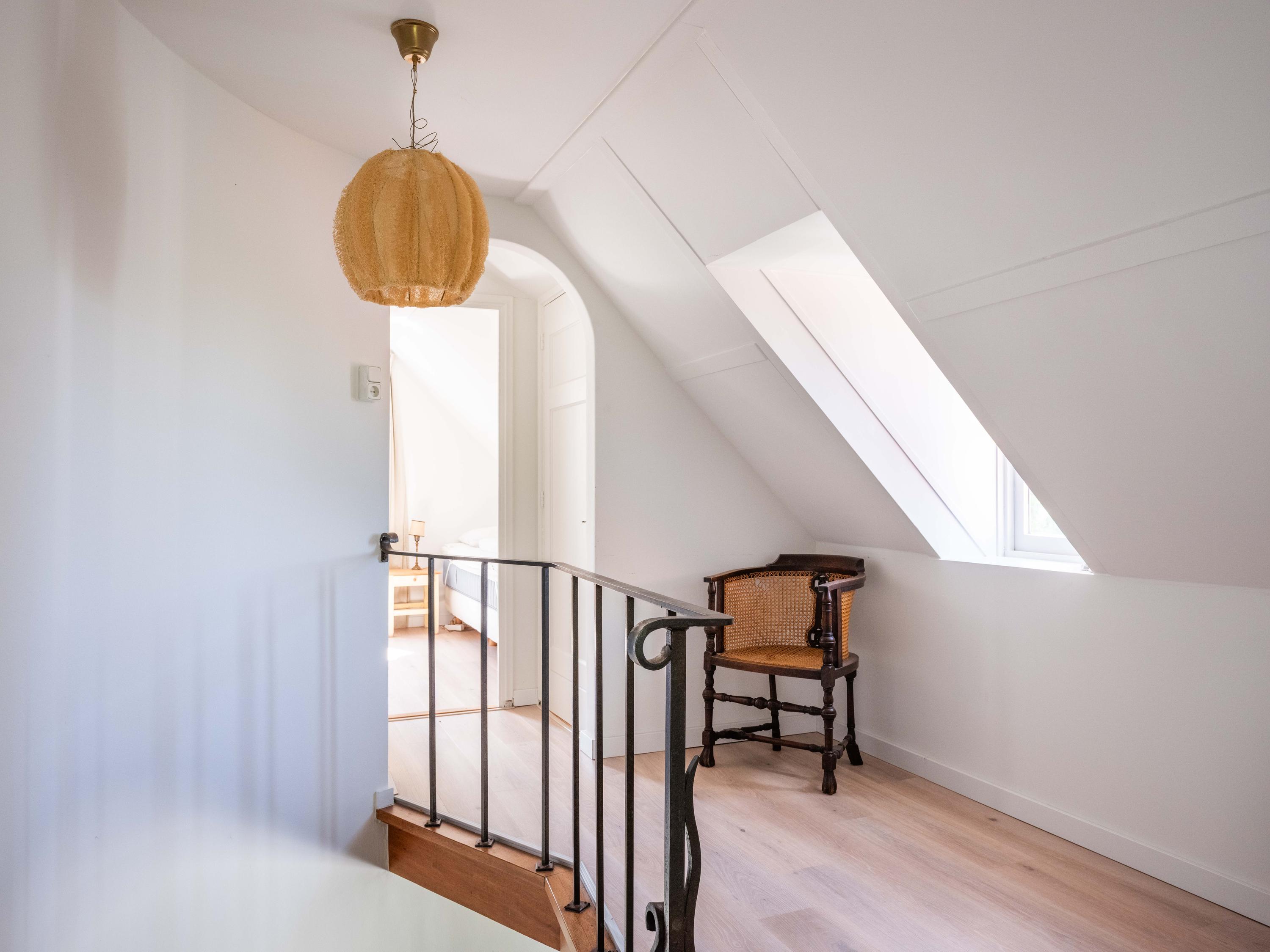 De eerste verdieping beschikt over drie slaapkamers, elk met een wastafel en vaste kast. Dankzij meerdere dakkapellen is er veel licht en ruimte. Er is een aparte cv-kast en een tweede badkamer met ligbad, douche, toilet, dakraam en mechanische ventilatie.