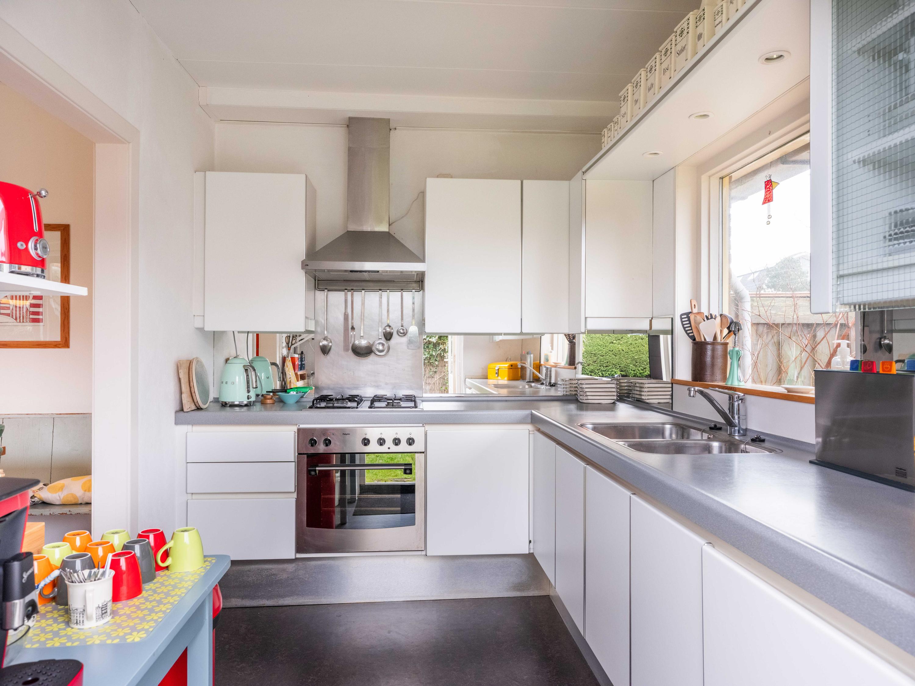 Bij binnenkomst ervaart u meteen de ruimte. De royale hal biedt toegang tot het toilet, de meterkast, de trap naar boven en een handige provisieruimte onder de trap. De lichte woonkamer kijkt uit op het groen aan de overzijde en vormt een fijne plek om te ontspannen. Vanuit de hal bereikt u bovendien de eetkamer en de keuken, die is voorzien van diverse inbouwapparatuur en een directe toegang tot de tuin.