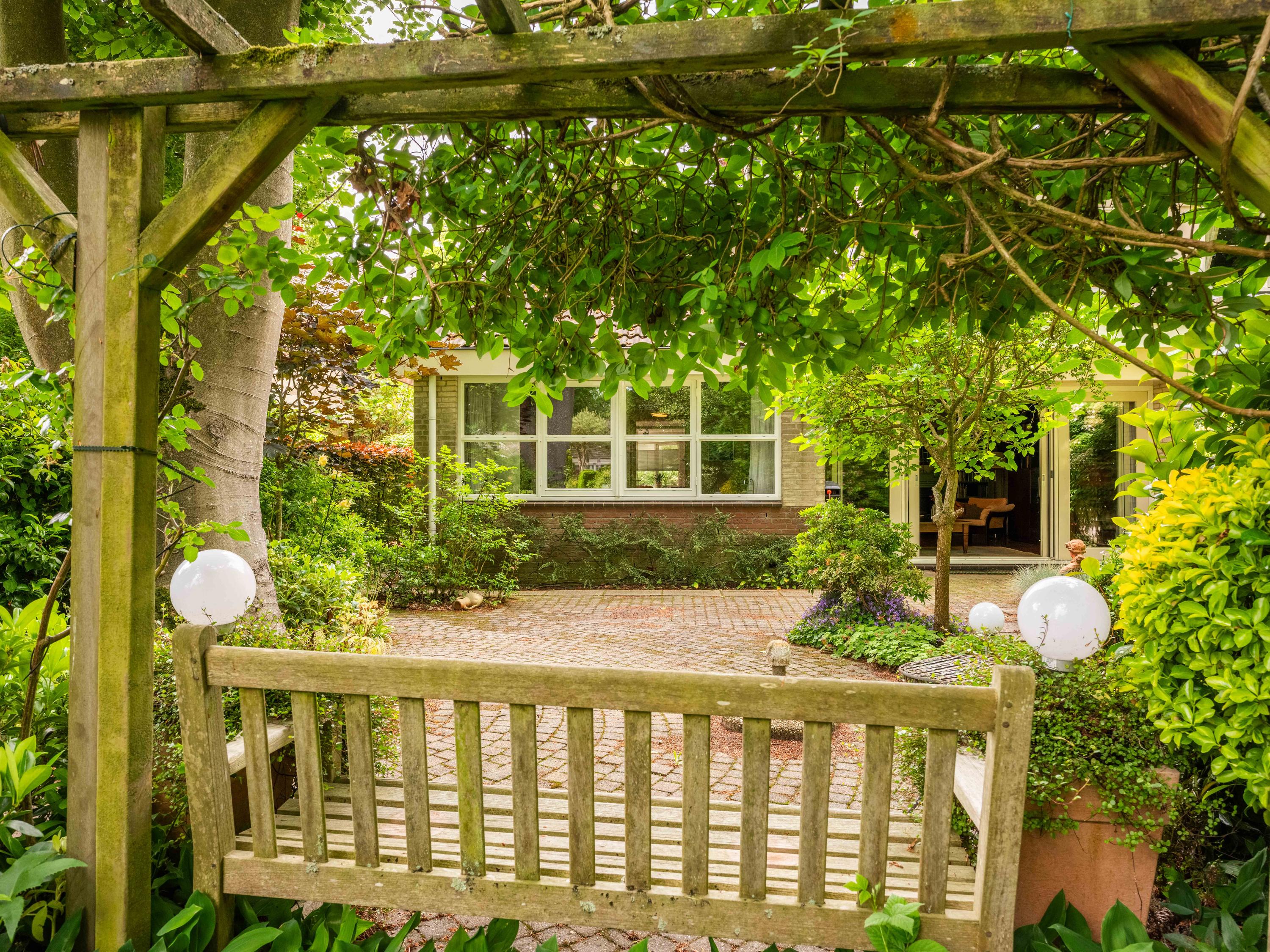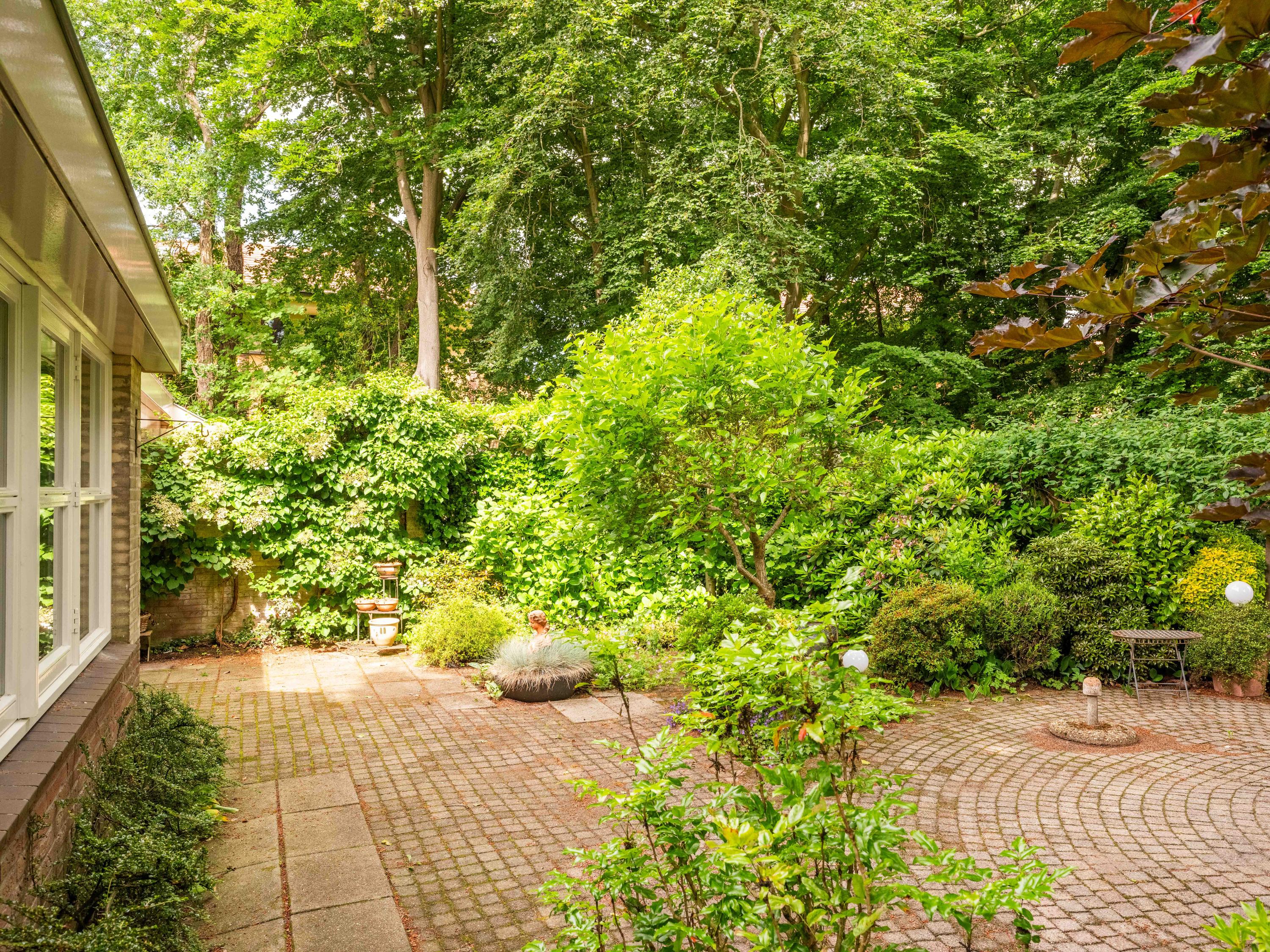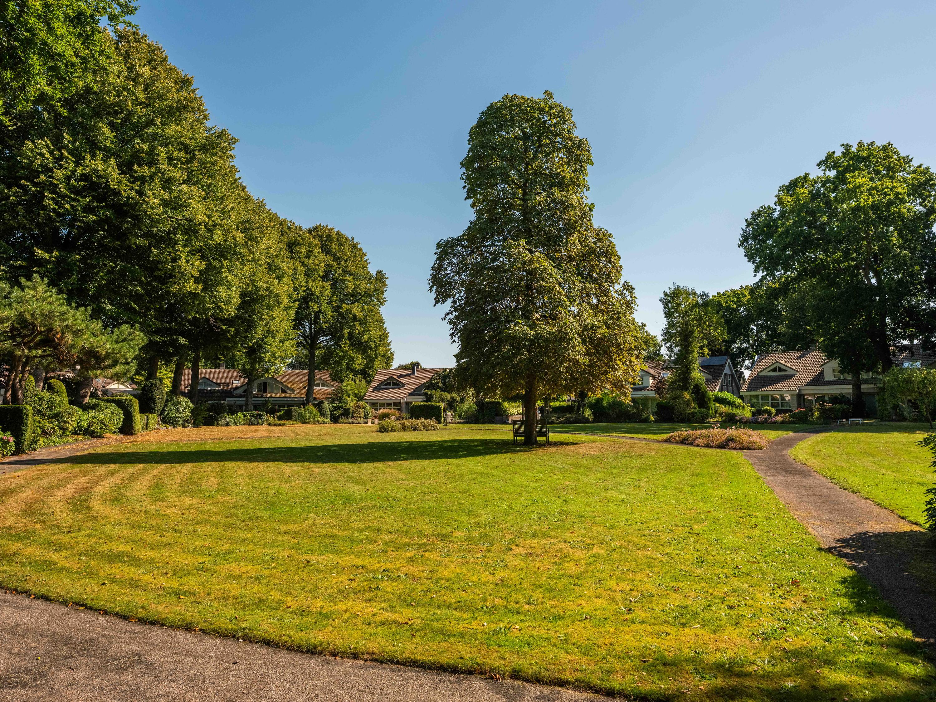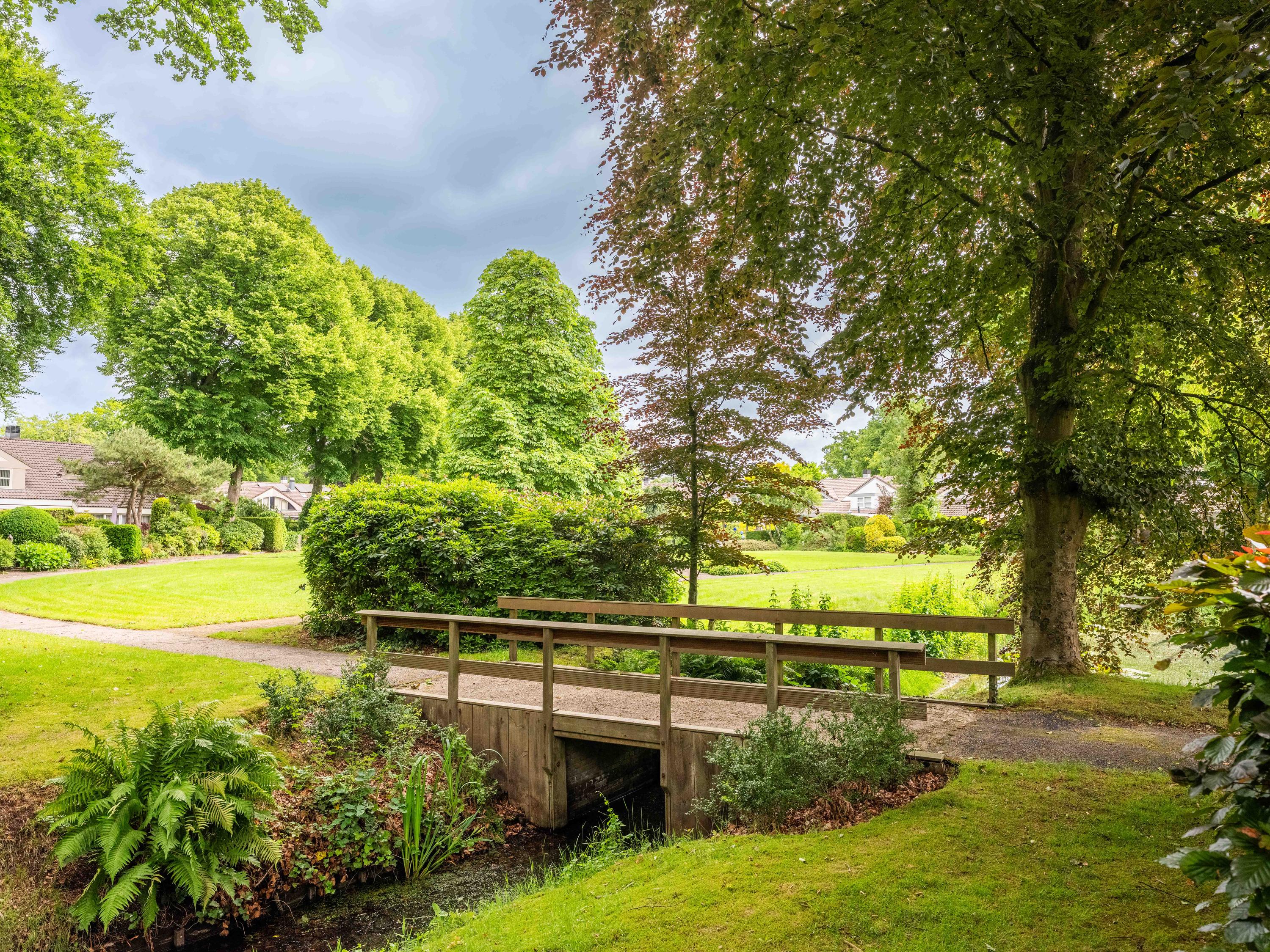 Via de grote schuifpui stapt u zo de zonnige, beschutte achtertuin in, een heerlijke plek om te genieten van rust en privacy, met een terras en uitzicht op de vijverpartij. De fraai aangelegde, zonnige tuin is een oase van rust en privacy. Het terras grenst aan het exclusieve, mandelige park met vijverpartijen – een unieke plek waar u volop kunt genieten van de natuur. Het park is uitsluitend toegankelijk voor omwonenden.
