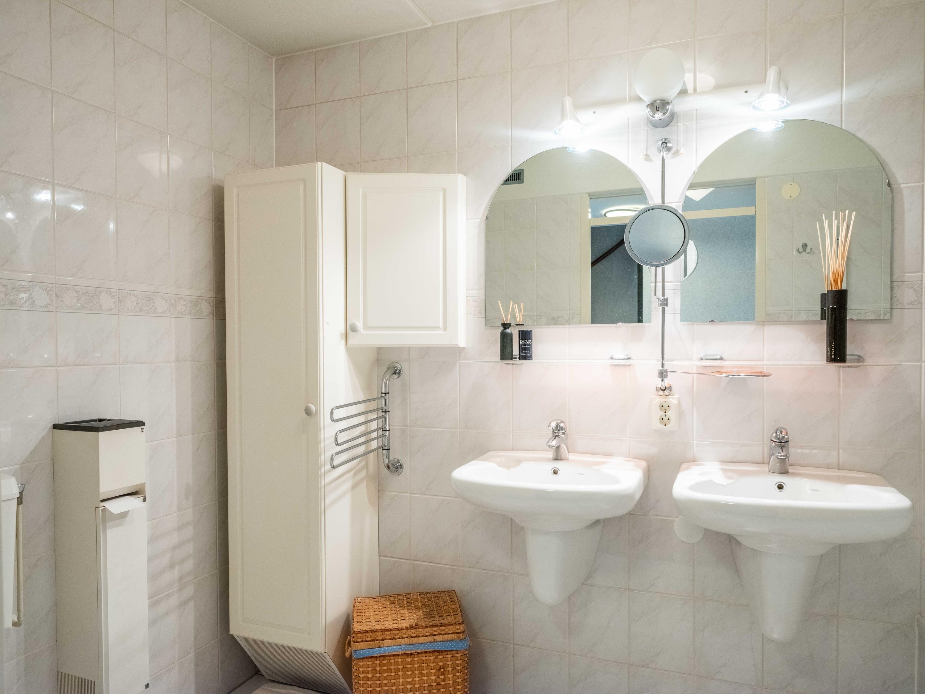 De eerste verdieping met dakkapellen biedt drie slaapkamers, waaronder een bijzonder ruime master bedroom. Daarnaast is er een tweede badkamer met douche, toilet, wastafel en wasmachine-aansluiting. Extra bergruimte en een separate stookruimte met wasmachine-aansluiting en toegang tot extra bergruimte maken het plaatje compleet.