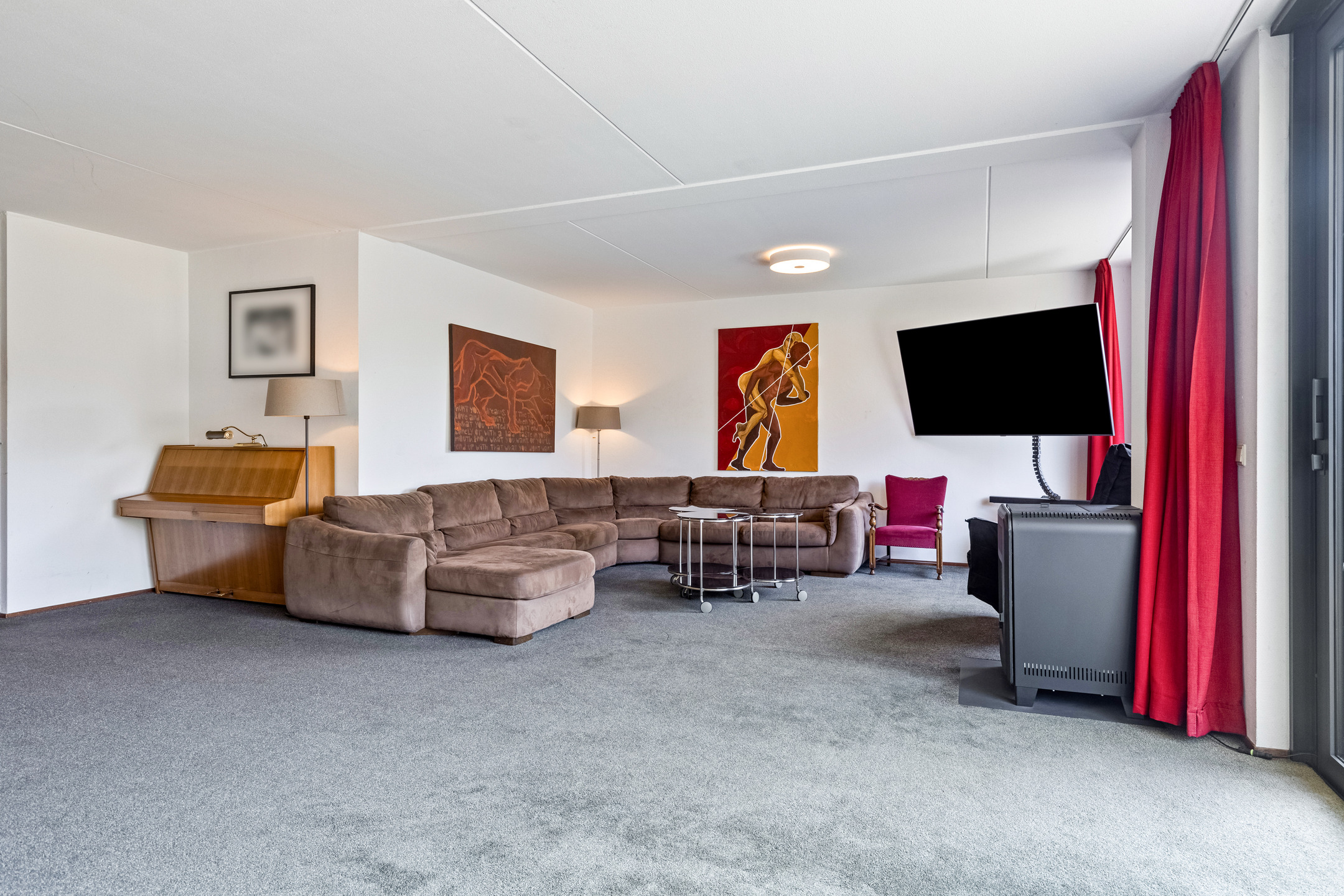 De ruime woonkamer is gelegen aan de achterzijde. De grote ramen zorgen voor veel lichtinval en de schuifpui geeft toegang tot achtertuin. De L-vormige woonkamer heeft een gezellige zithoek en voldoende ruimte om met een groot gezelschap aan een lange tafel plaats te nemen.