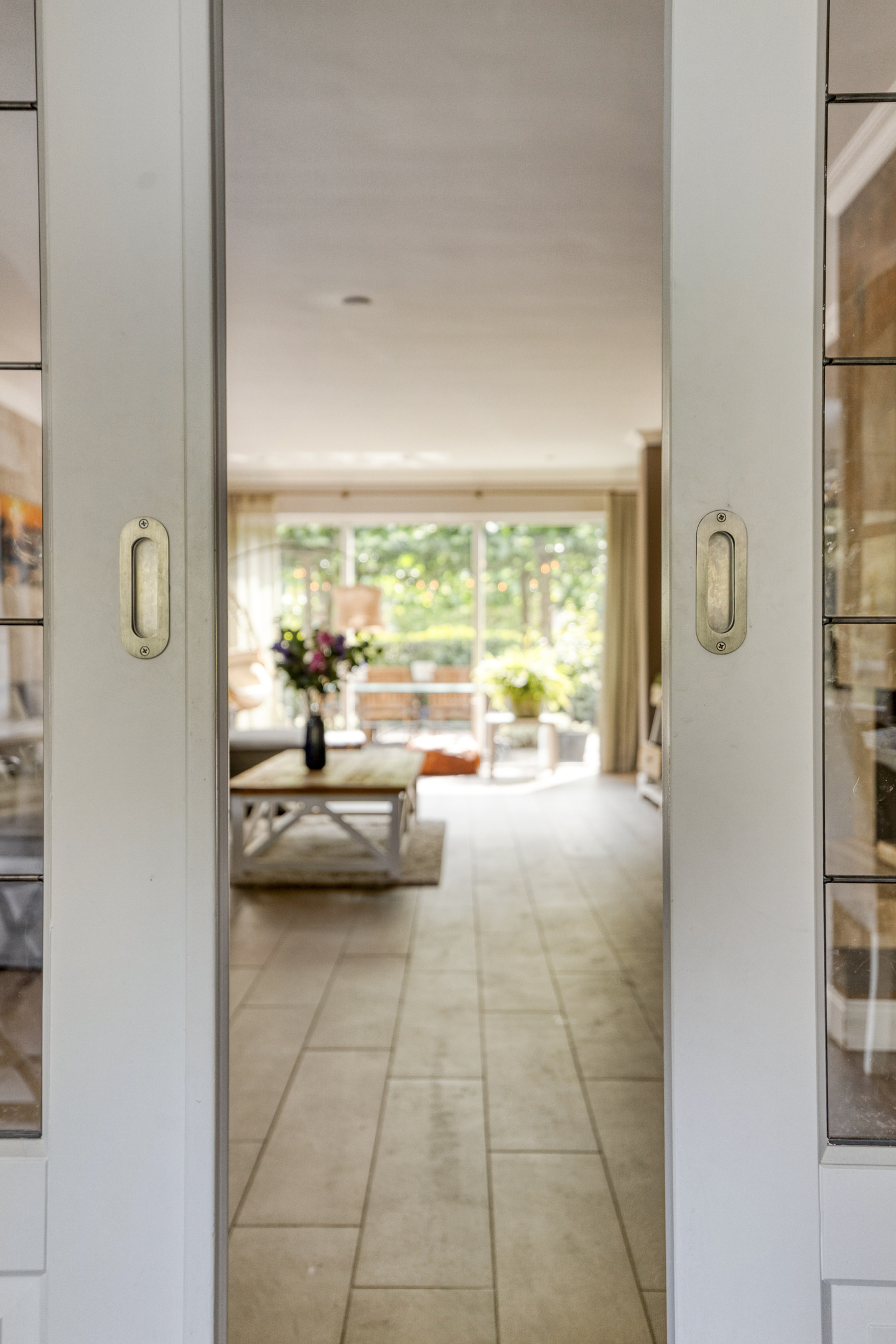 De gehele begane grond inclusief de veranda is voorzien van een houtlook tegelvloer met vloerverwarming.