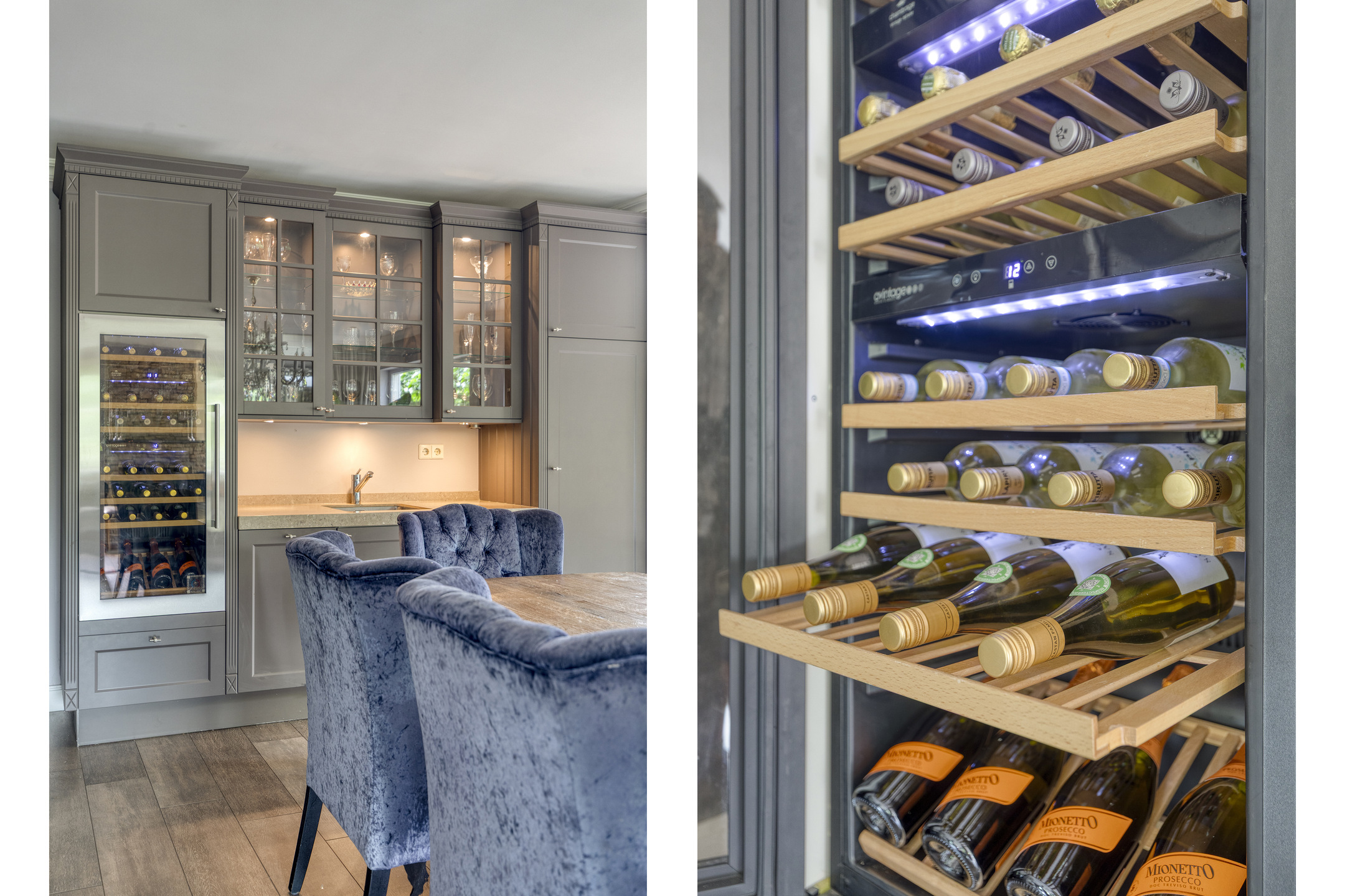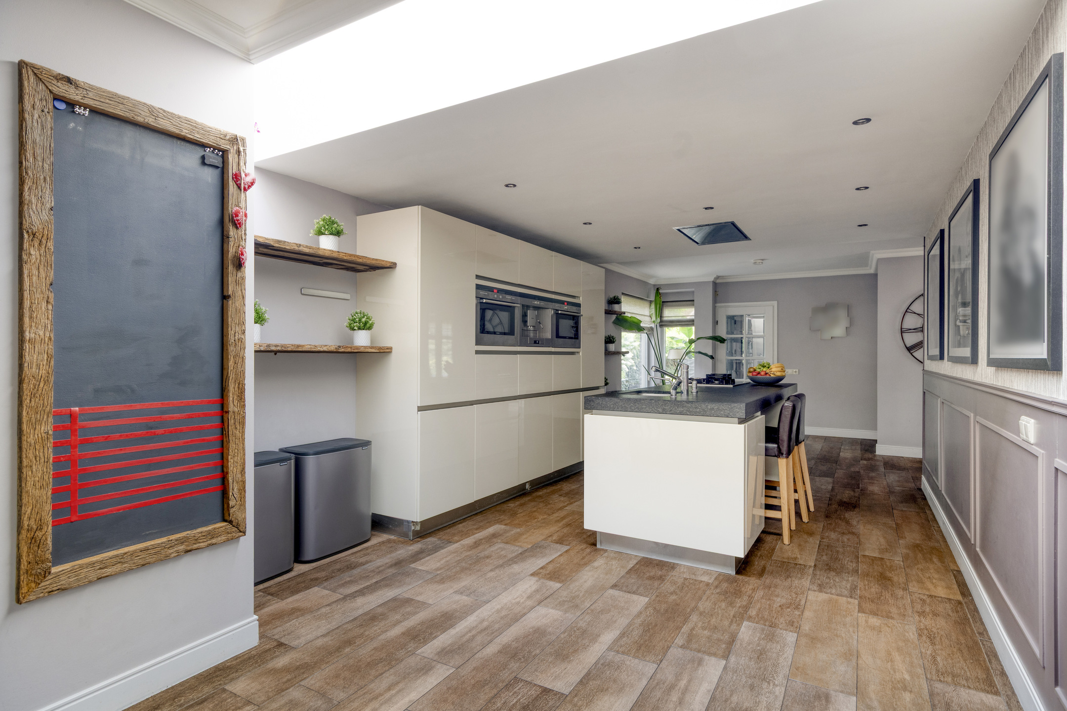 Binnenkomst in de open keuken met kookeiland en een uitgebreide kastenwand met apparatuur van Siemens. De volgende apparaten zijn hierin verwerkt: koffiezetapparaat, combi oven/magnetron, en een koel-vriescombinatie. In het kookeiland zitten naast de spoelbak en veel berglades, een vaatwasser, 5 pits gaskookplaat met daarboven een geïntegreerde afzuigkap. De in het dak verwerkte lichtstraat zorgt voor een prettige, natuurlijke lichtinval.