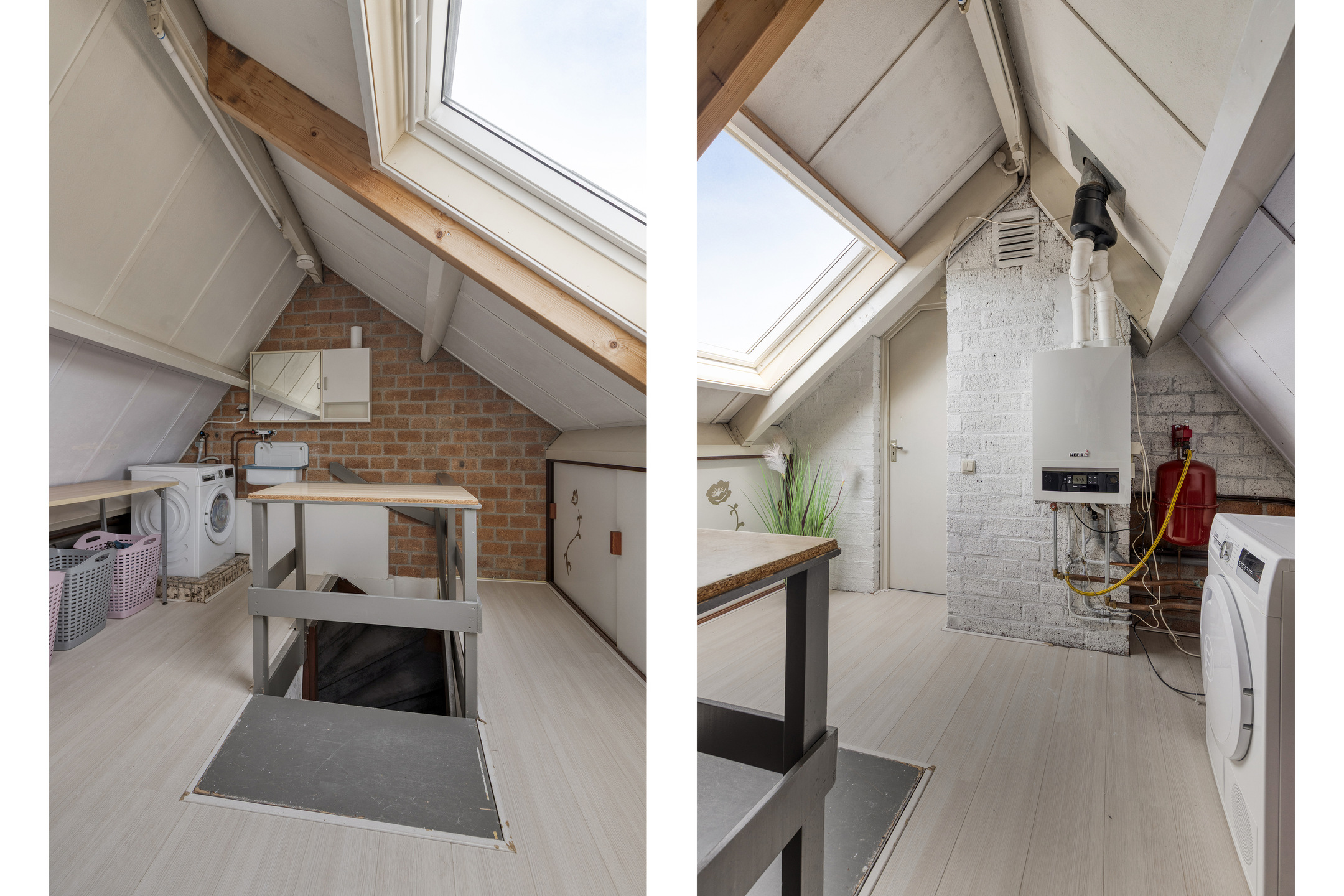 Ruime voorzolder met dakraam, wastafel, aansluiting voor de wasmachine, wasdroger en opstelplaats cv-ketel.
