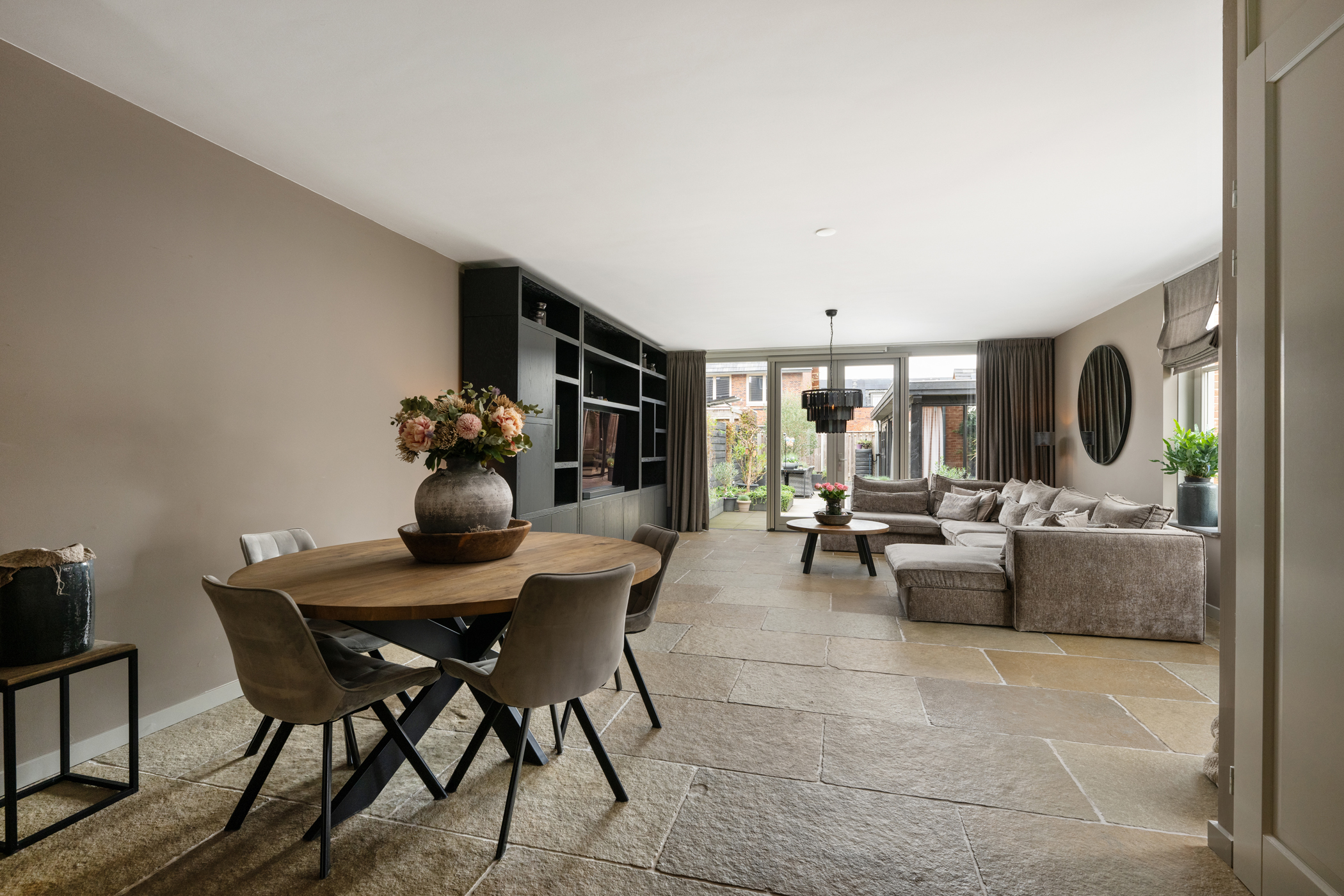 De tuingerichte woonkamer is ruim en licht, afgewerkt met een fraaie Bourgondisch dallen natuurstenen vloer met vloerverwarming. De trap naar de eerste verdieping bevindt zich in de woonkamer en de trapkast is praktisch ingericht als extra garderobe. Openslaande deuren bieden toegang tot de diepe achtertuin, compleet met overkapping en vrijstaande houten berging.