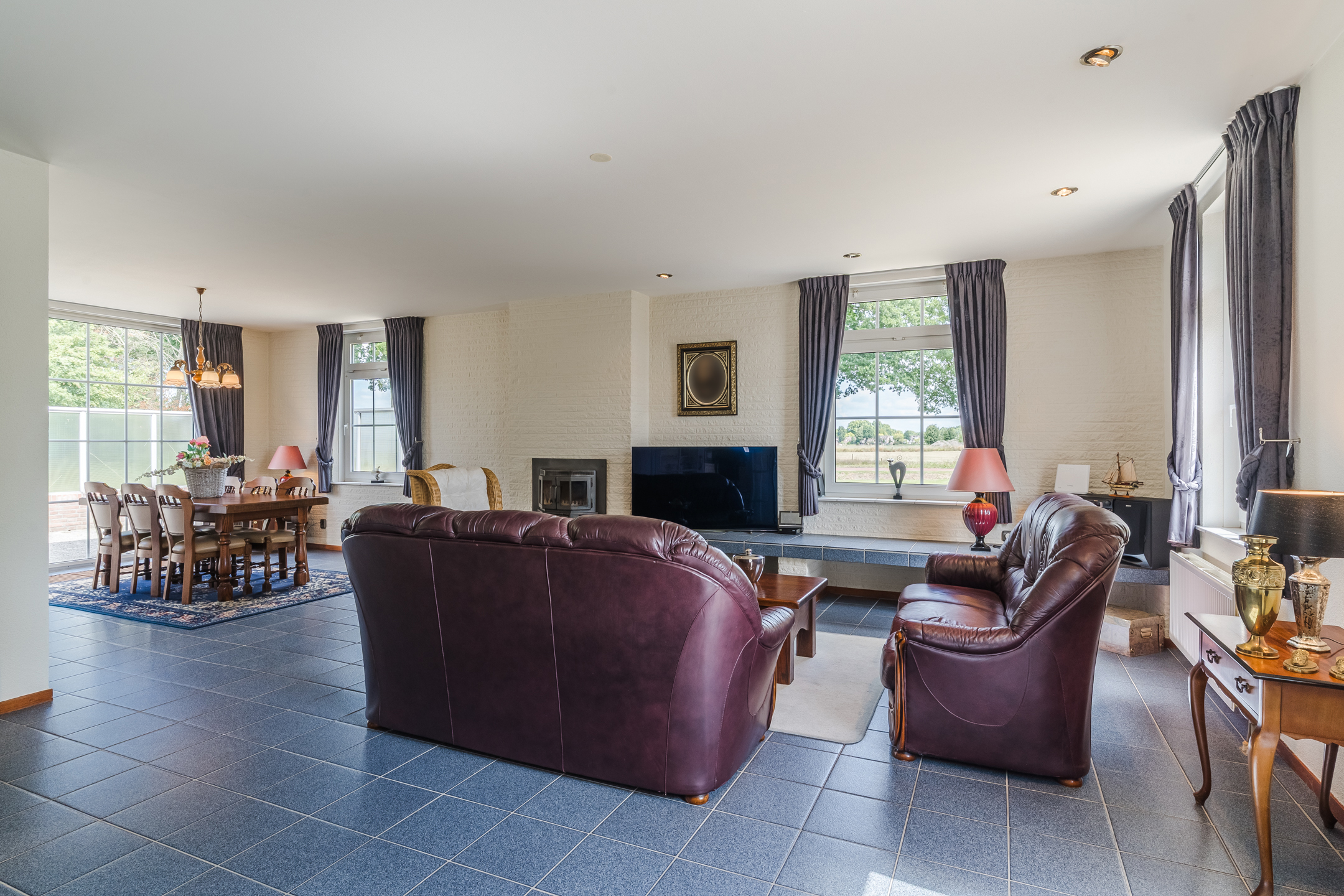 ca. 46 m² met tegelvloer voorzien van vloerverwarming, granol wanden, stucwerk plafond met inbouwspots en voorzien van een dichte houthaard, en-suite deuren naar de keuken en een schuifpui met toegang tot het voorste deel van het perceel.
