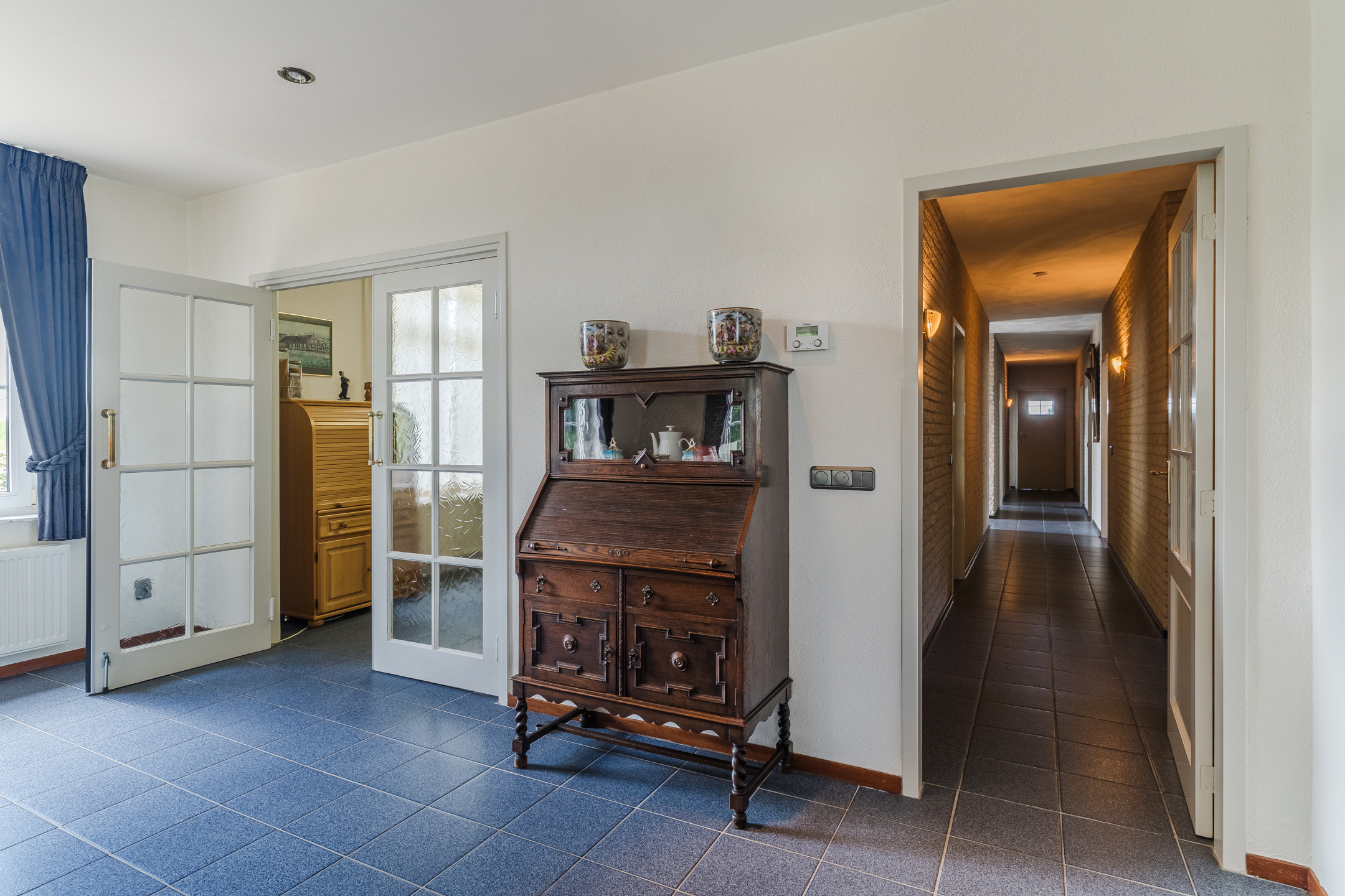 ca. 32,5 m² met tegelvloer, metselwerk wanden, stucwerk plafond en voorzien van een afsluitbare garderobekast en meterkast met 14 groepen, 3 aardlekschakelaars en 3 fase aansluiting. De hal geeft verder toegang tot de toiletruimte, keuken, woonkamer, 3 slaapkamers, badkamer, bijkeuken, inpandige garage, tuin en toegang tot de 1e verdieping middels een vaste trap.