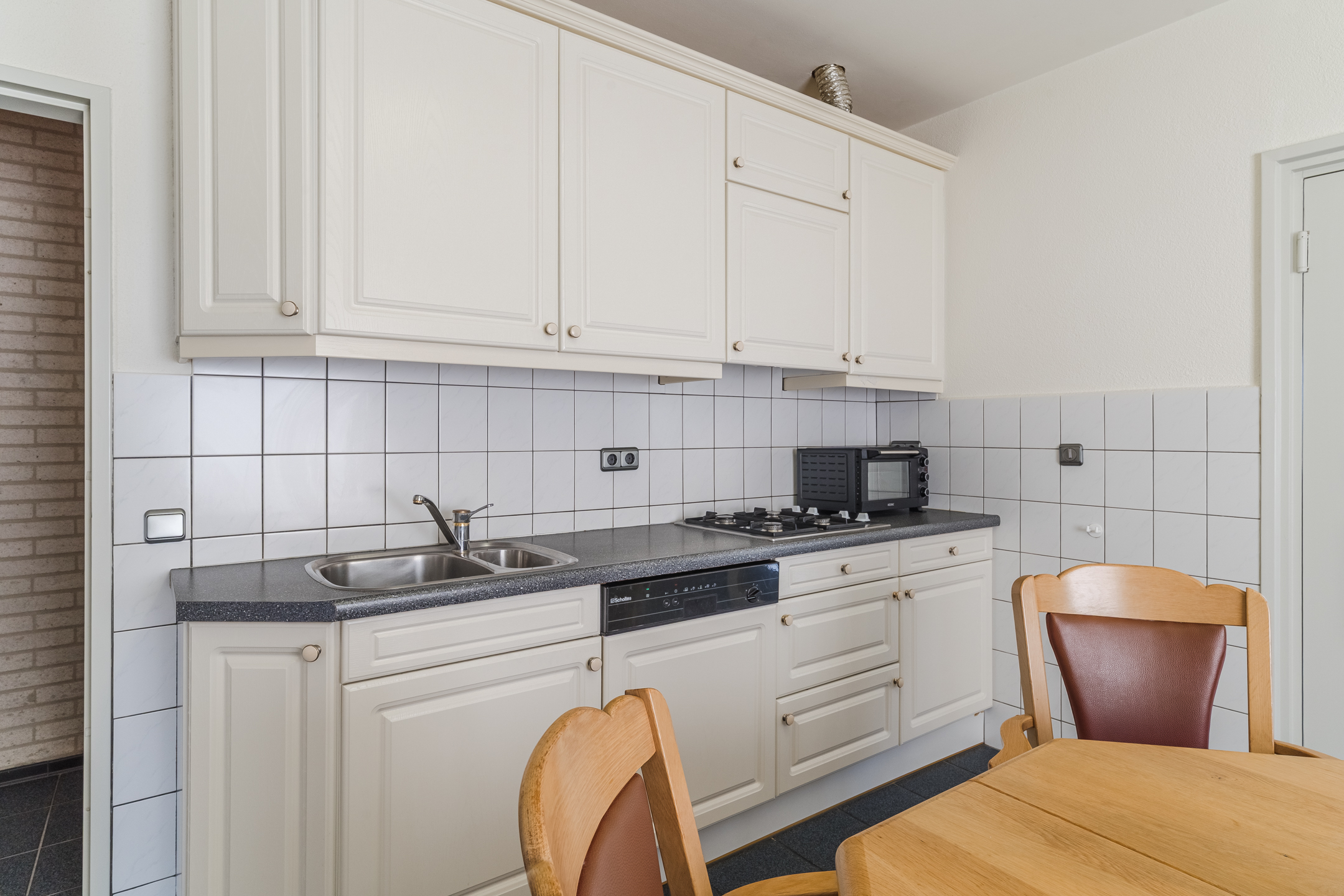 ca. 15,5 m² met tegelvloer voorzien van vloerverwarming, gedeeltelijk betegelde wanden, stucwerk plafond en 2x rechte keukenopstelling voorzien van 4-pits gaskookplaat, afzuigkap, 1,5 spoelbak, koelkast, combimagnetron, vaatwasser en verdiepte trapkast.