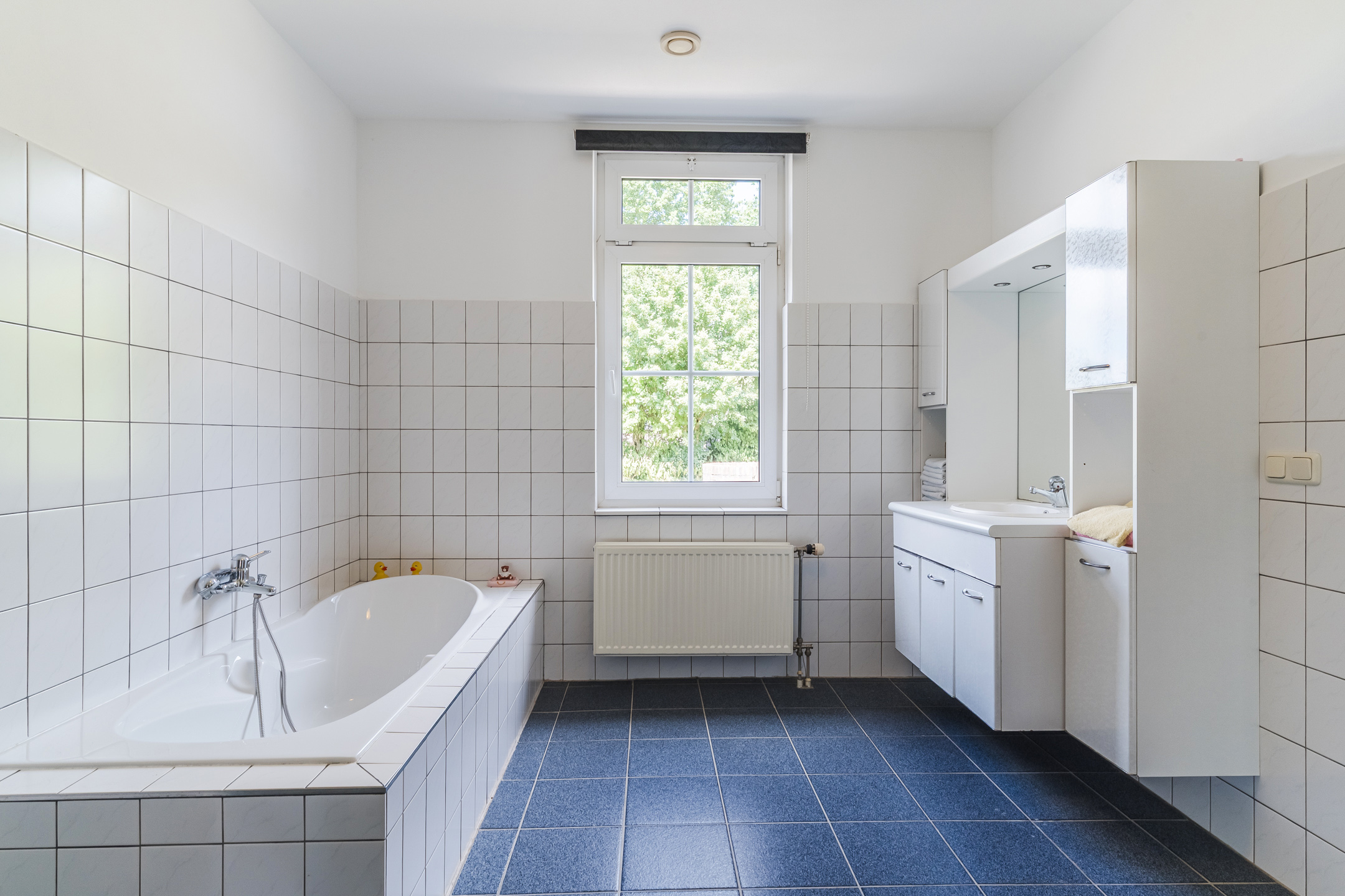 ca. 11,5 m² met tegelvloer voorzien van vloerverwarming, gedeeltelijk betegelde wanden, stucwerk plafond en voorzien van douche met thermostatische kraan, ligbad met thermostatische kraan, wastafelmeubel met 1 kraan en toilet.