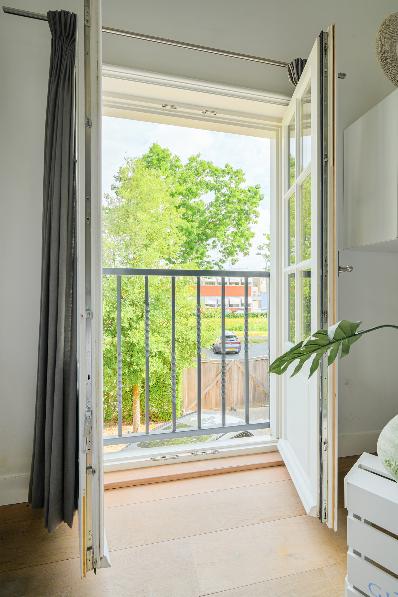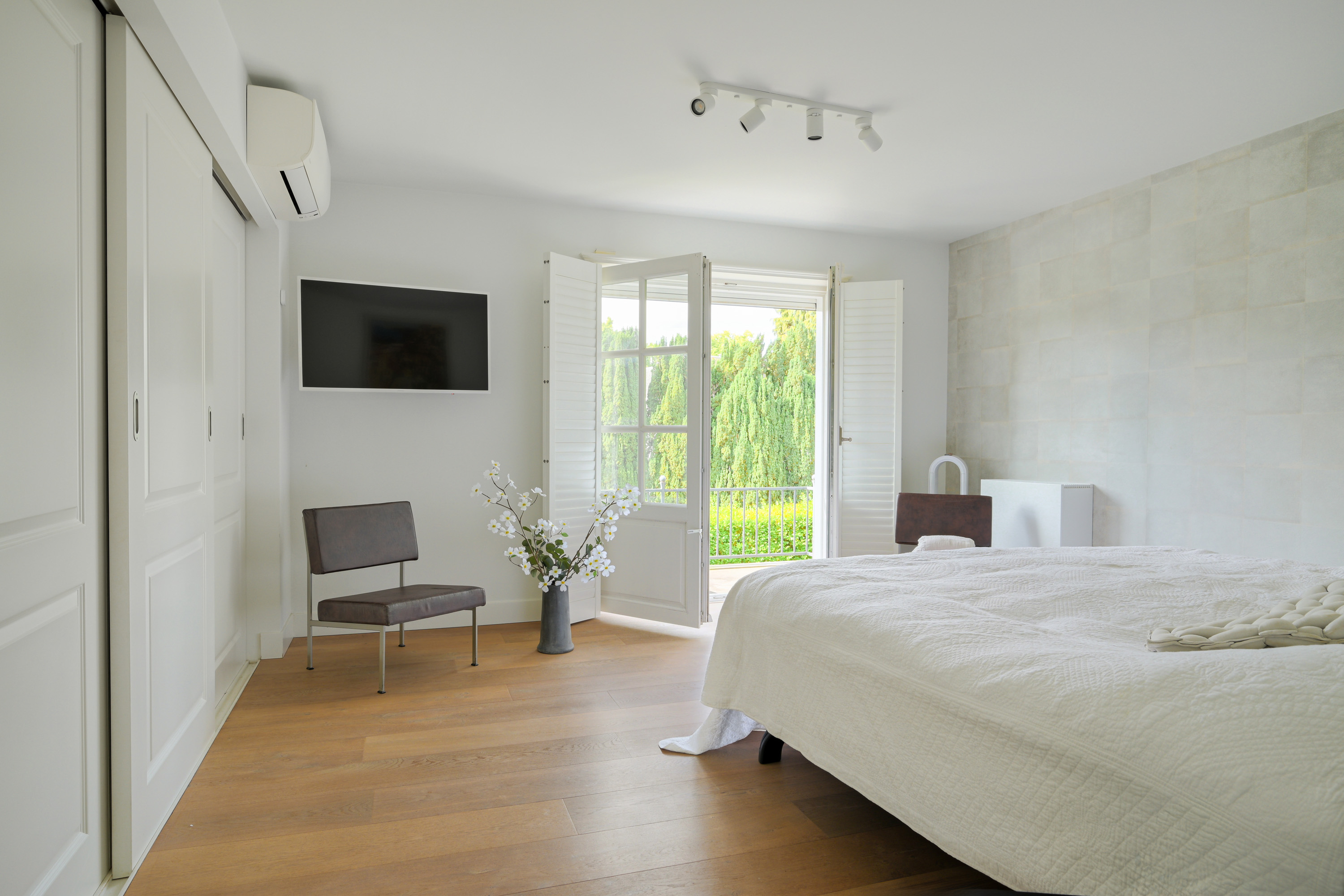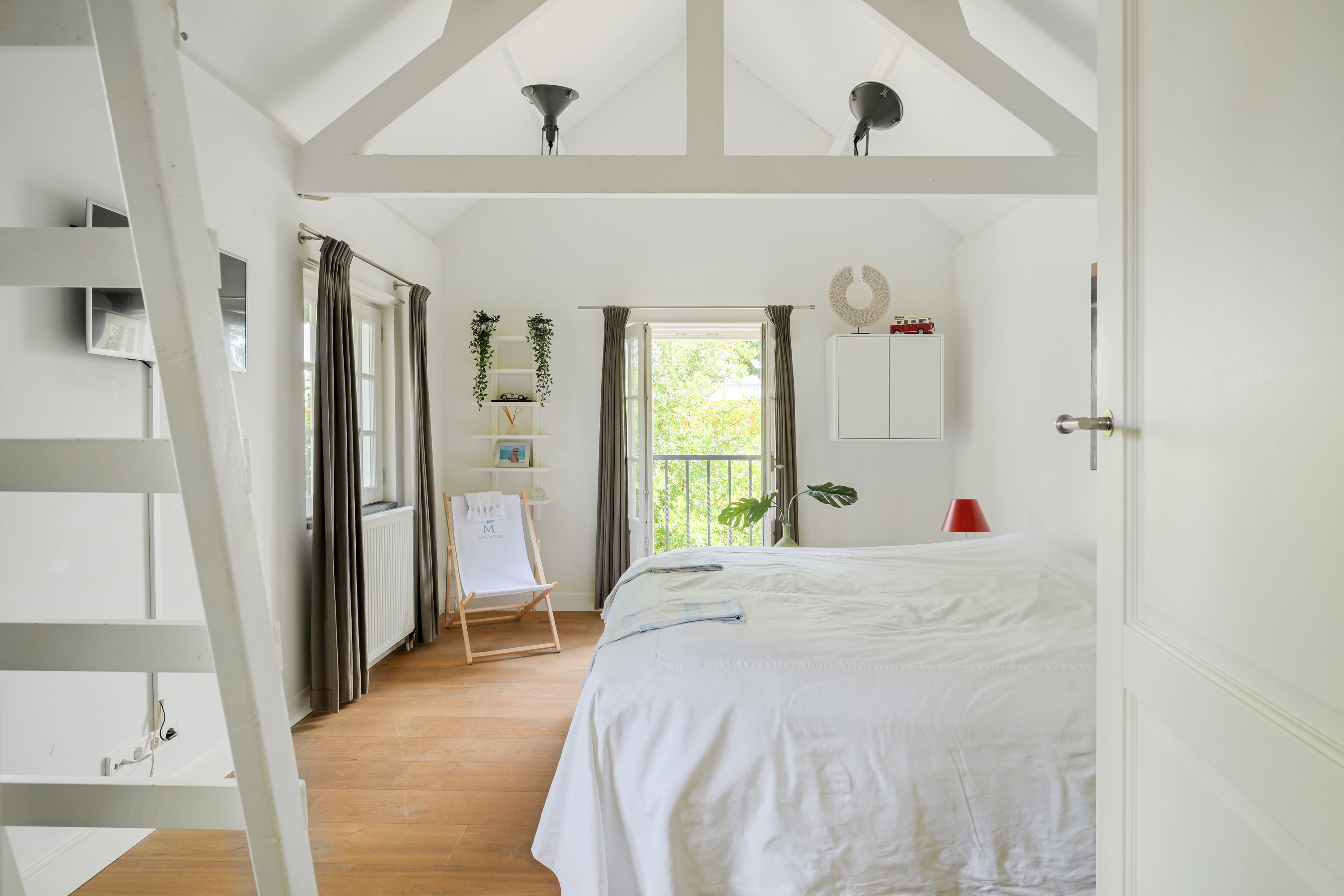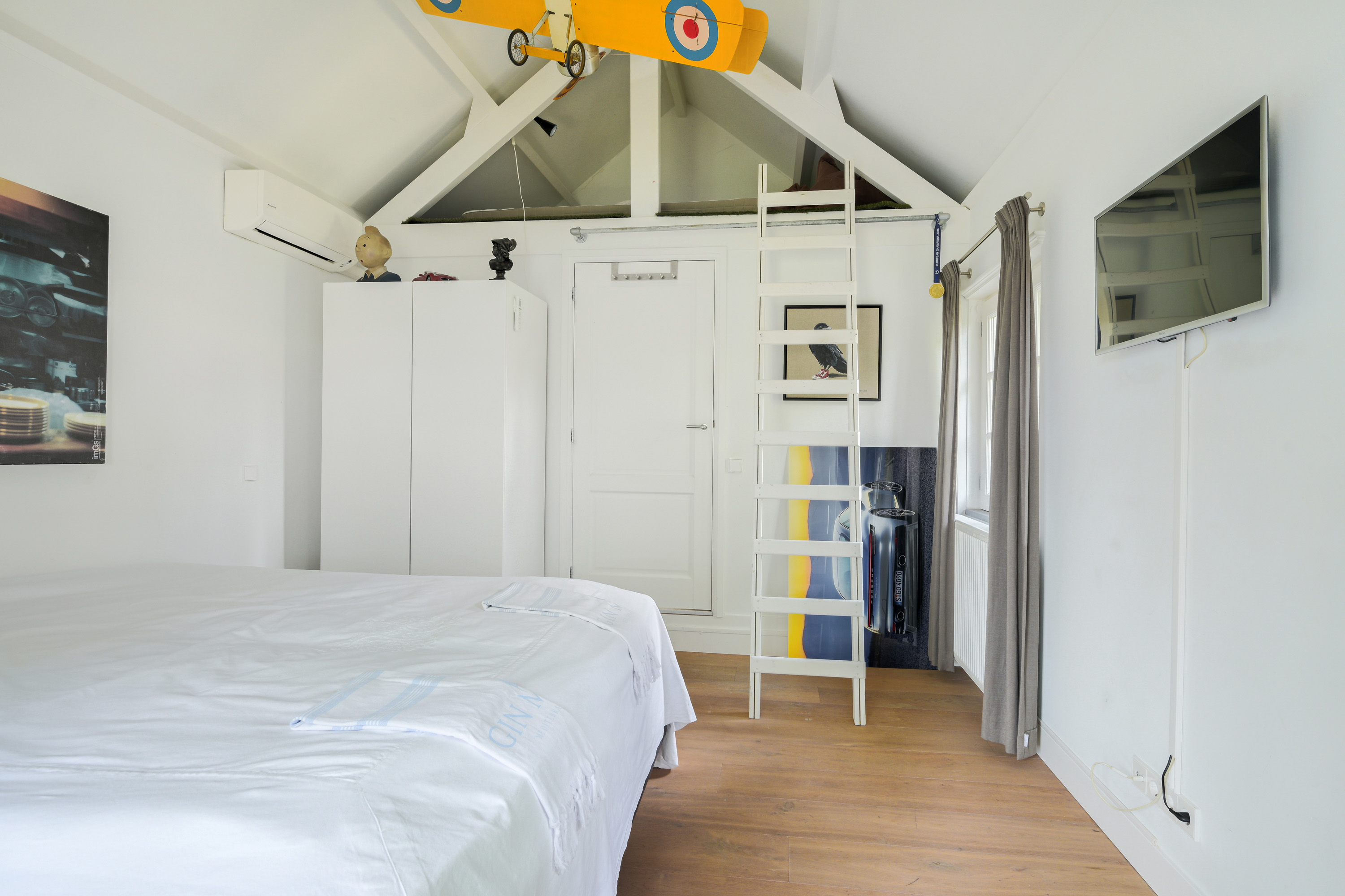 Ruime voorslaapkamer met Frans balkon en extra ruimtelijk effect doordat de kapconstructie in het zicht gebleven is. In deze kamer tref je een entresol/hoogslaper. Bovendien is deze kamer voorzien van airconditioning.