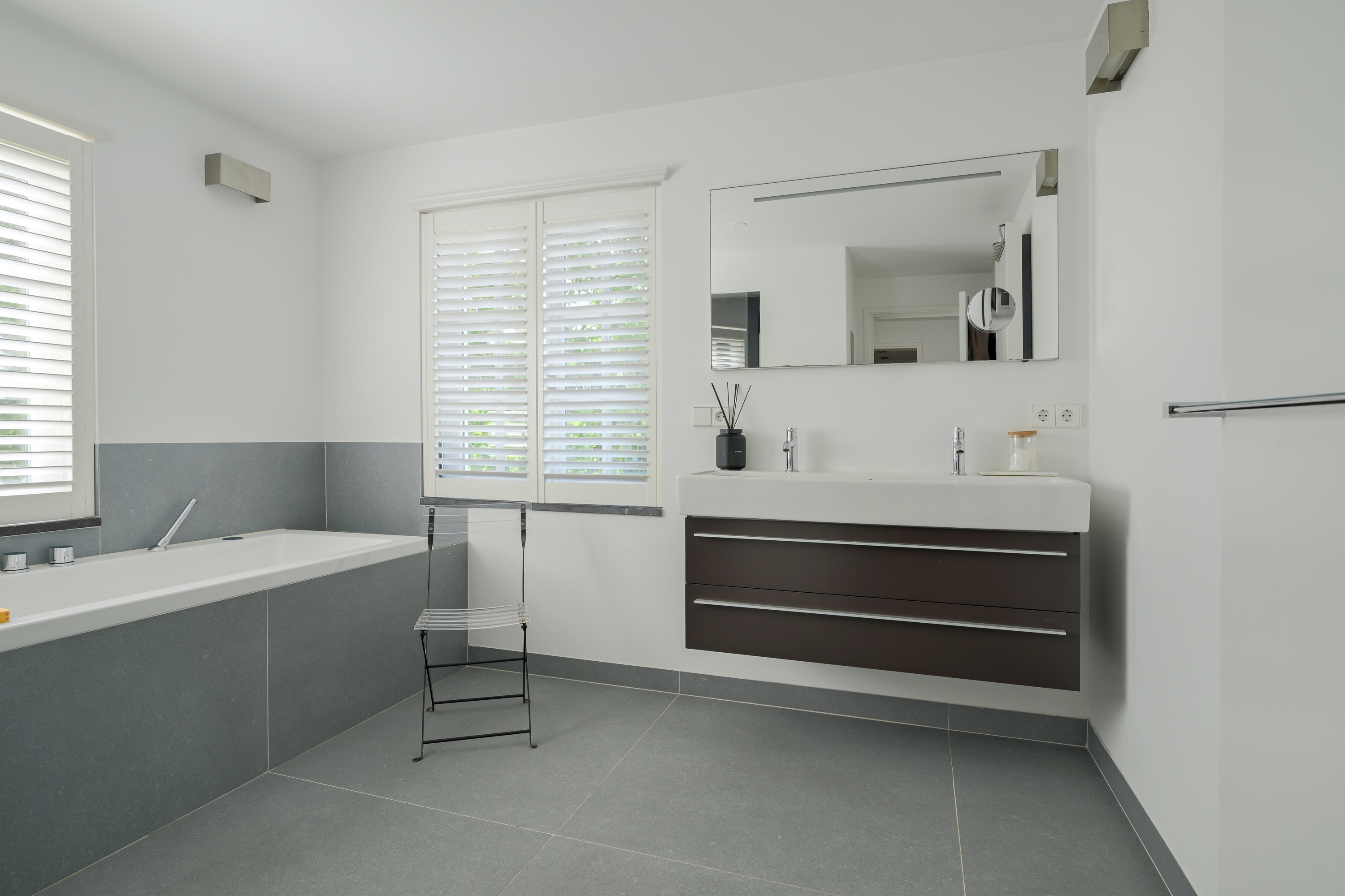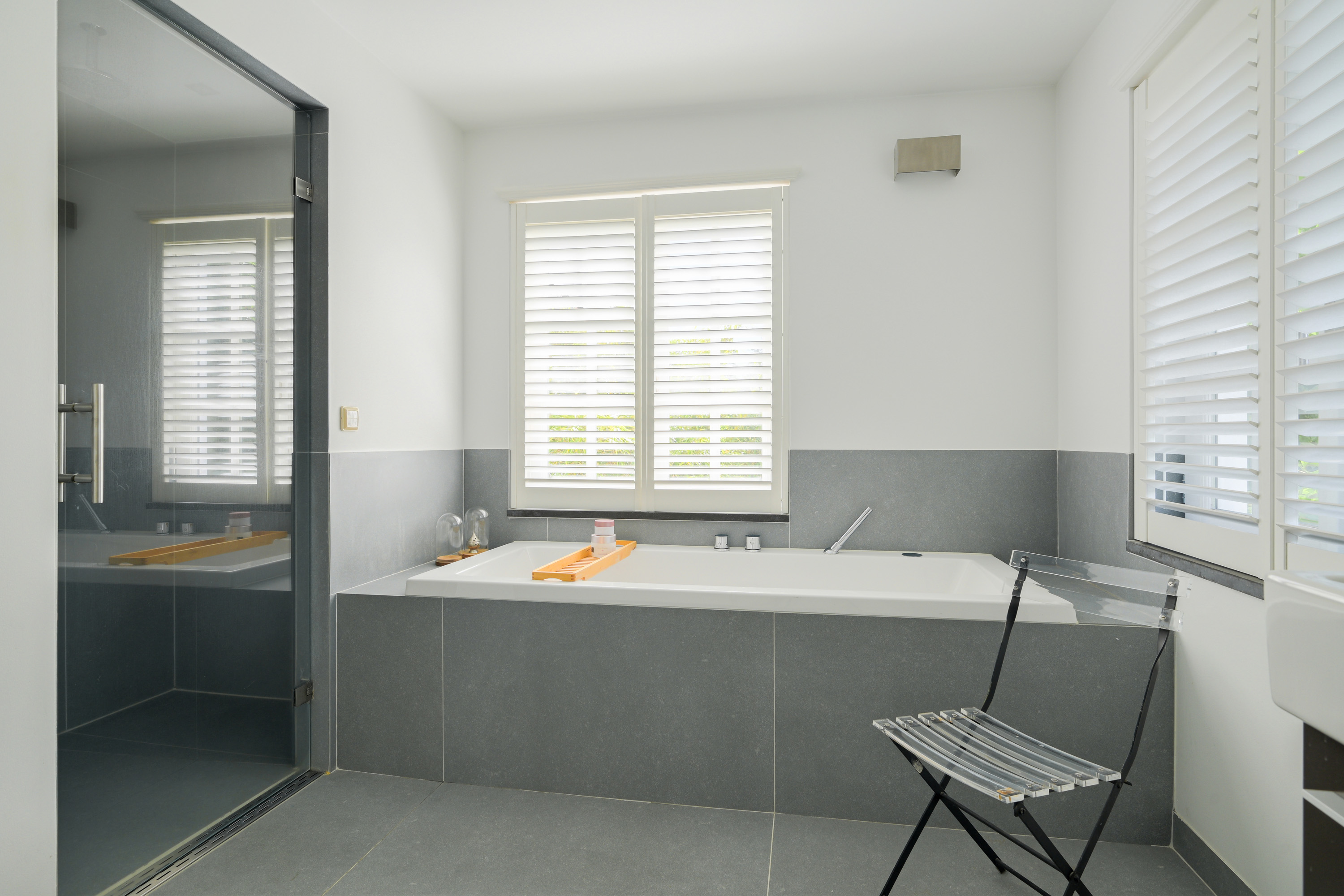 Badkamer met luxe inrichting, bestaand uit riante inloopdouche met hand- en regendouche, ligbad met designkraan en