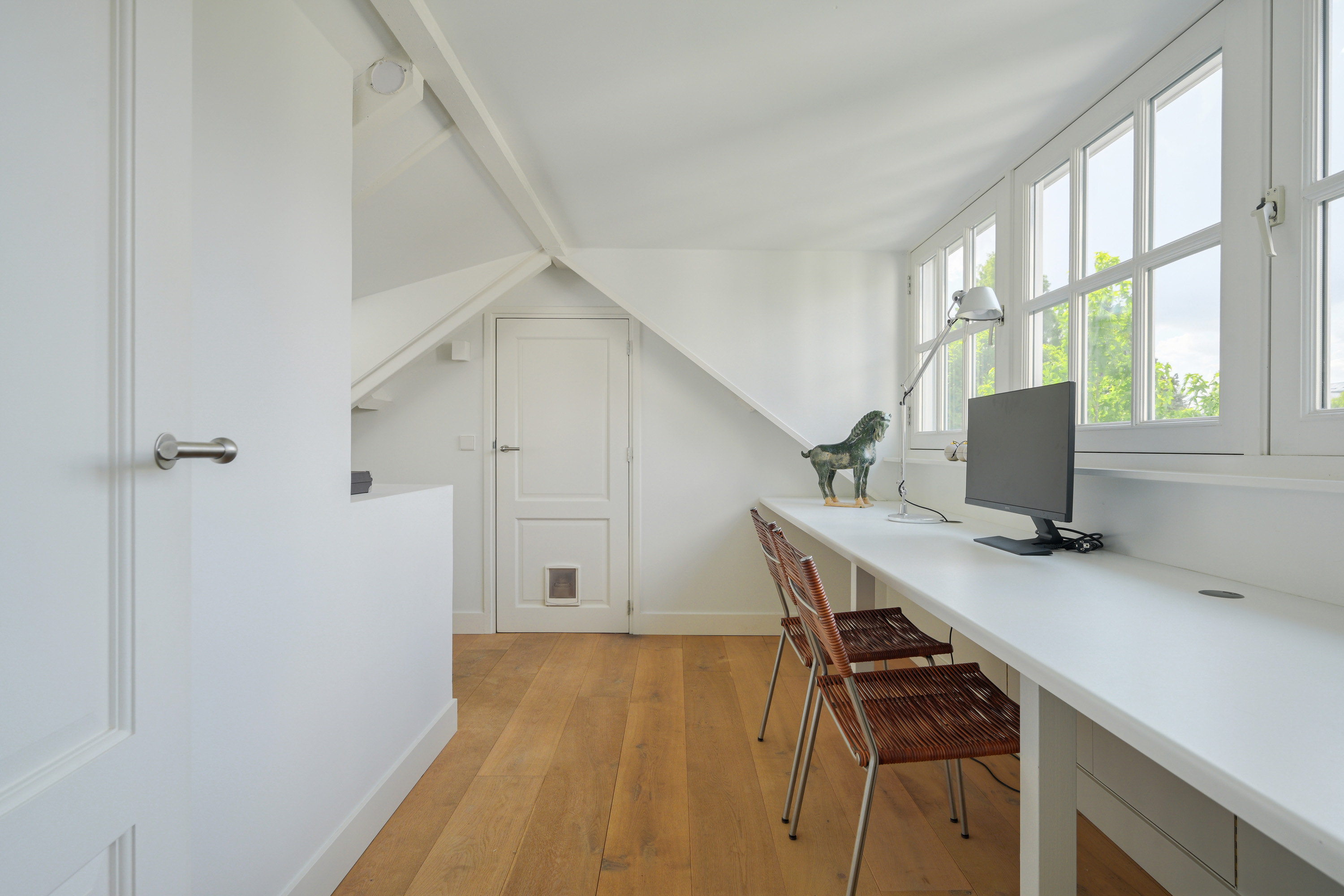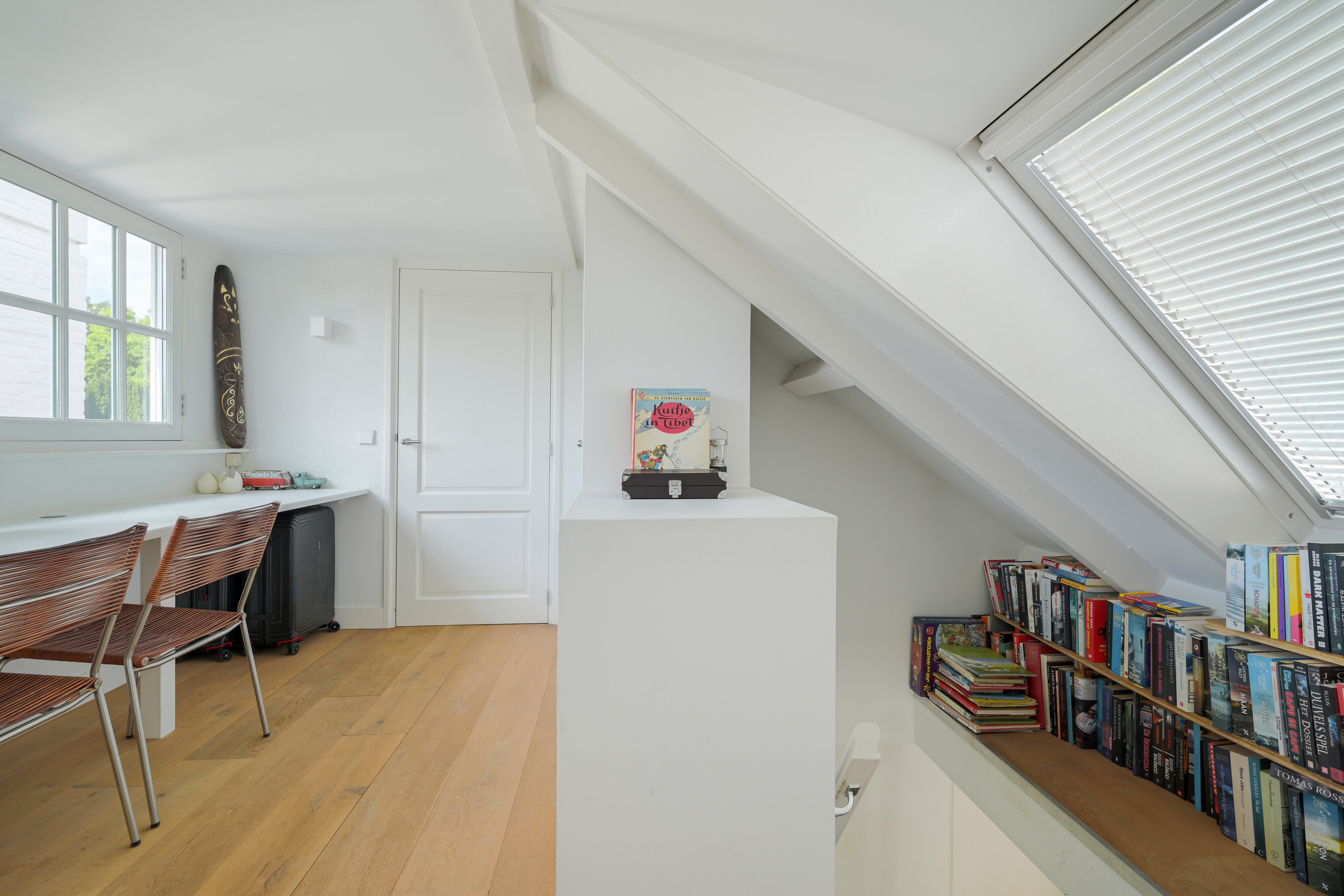Overloop met dakkapel: hierin is een fijne brede werkplek gecreëerd. En ook hier tref je een inbouwkast. Aan de voorzijde is een Velux dakraam voor extra daglichttoetreding geplaatst.