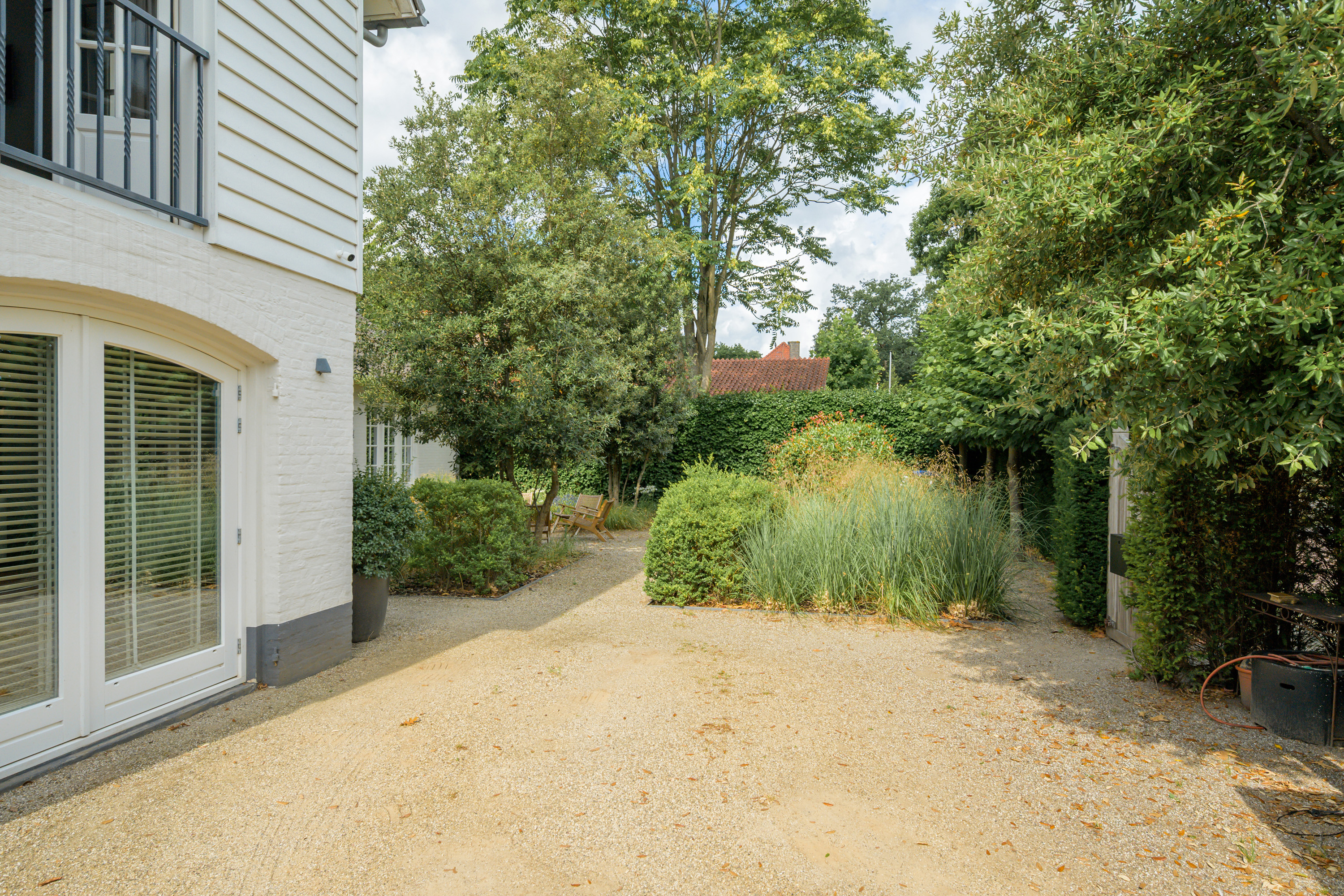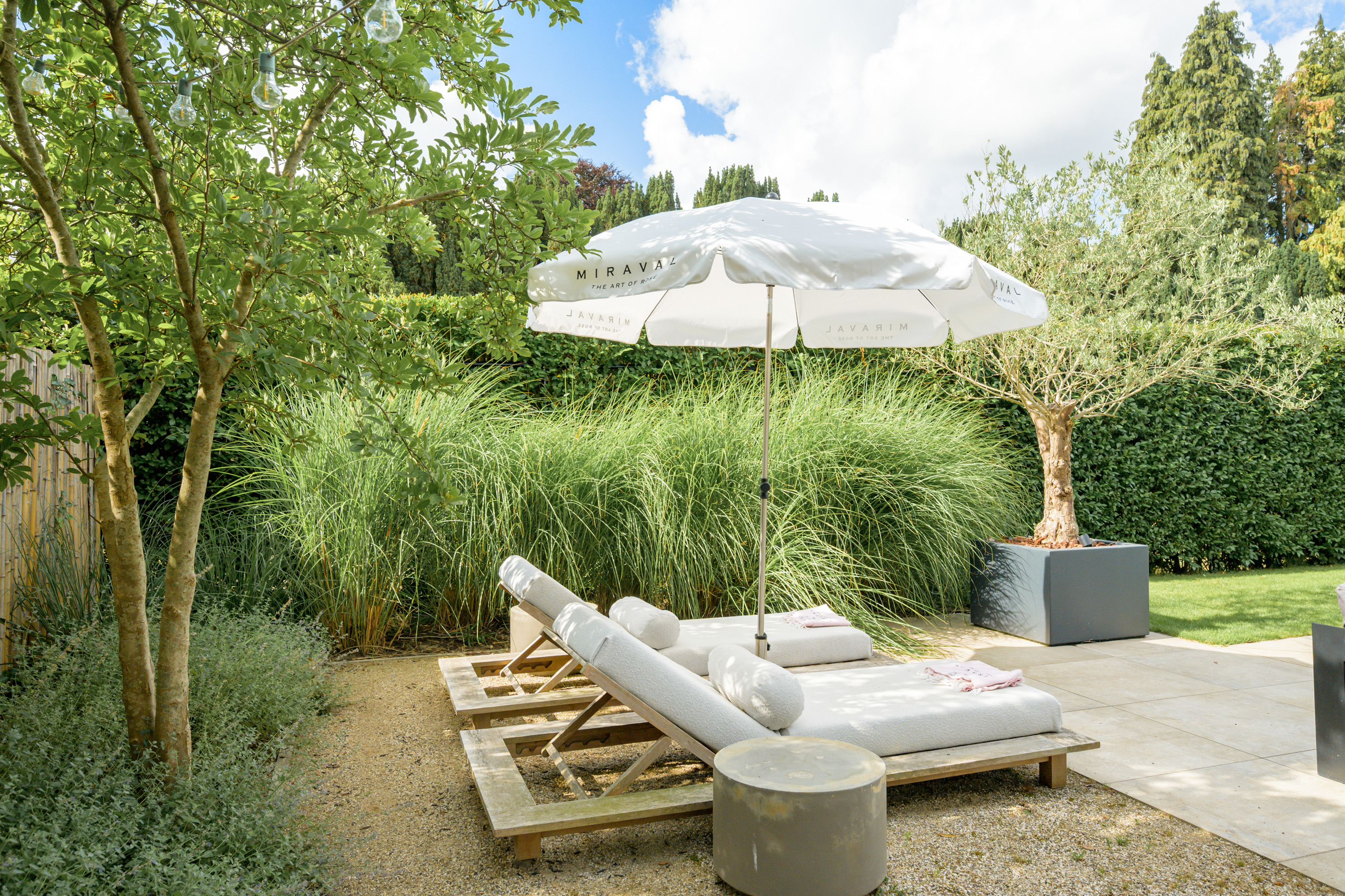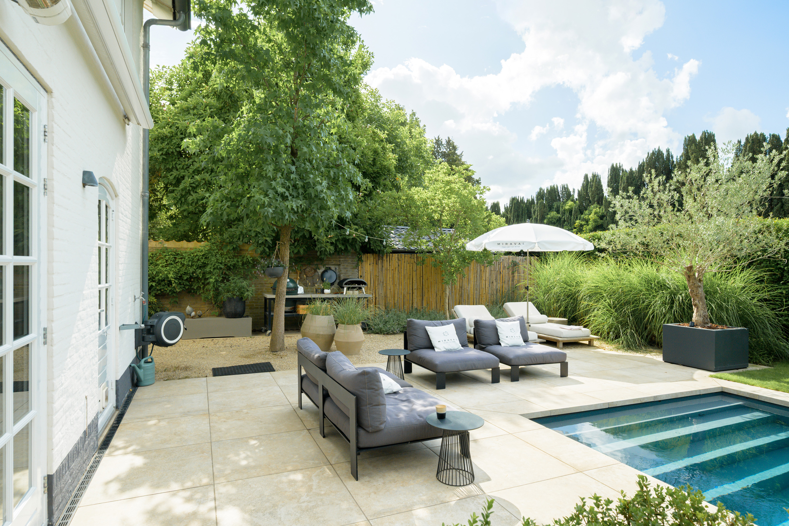 De tuin is ontworpen door Ronnie Renette, Arterior en voorzien van een gazon, een modern, strak zwembad met roldek/solardek en warmtepomp, diverse terrassen. In de borders tref je variërende beplanting, siergrassen etc. Ook