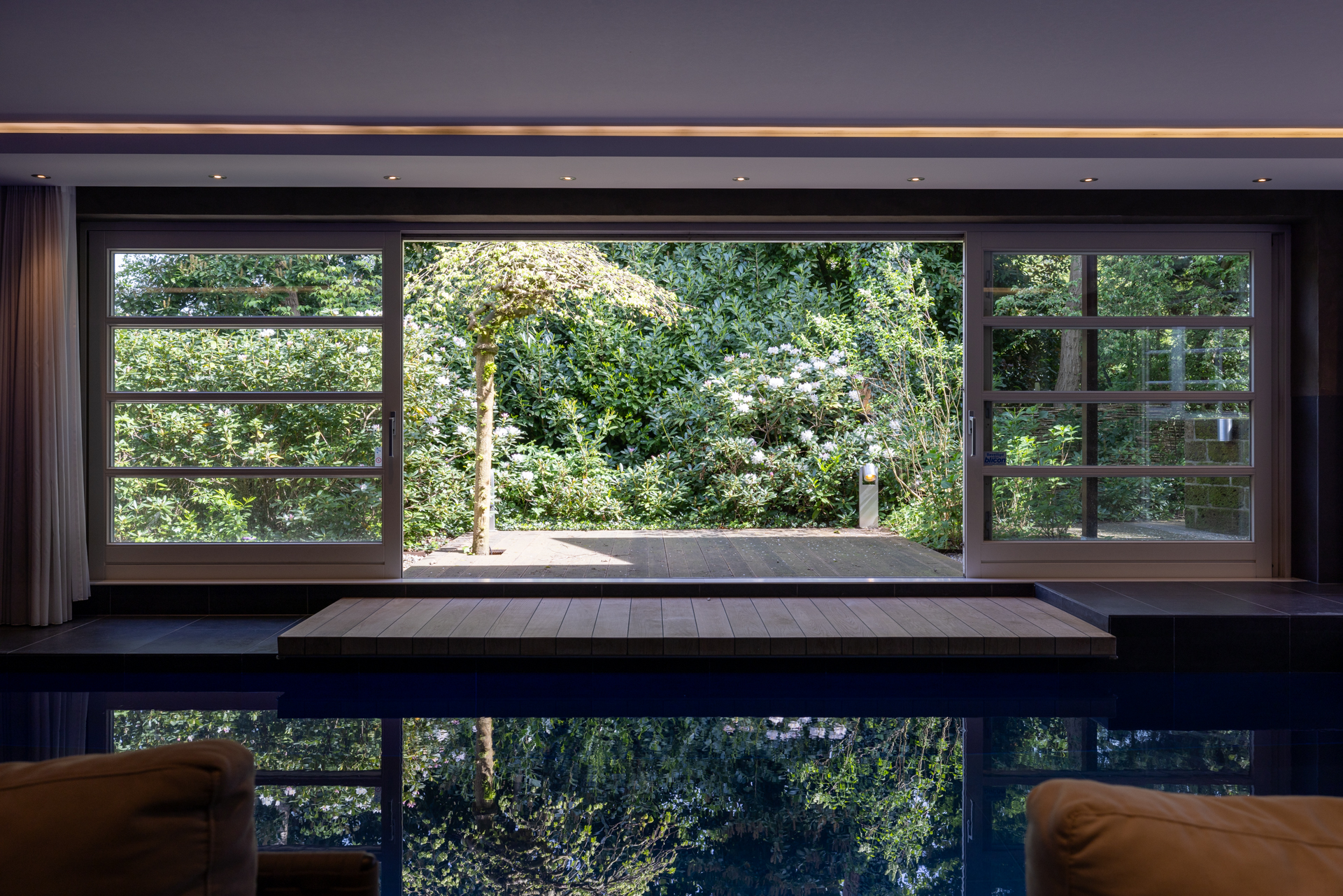 Deze ruimte is voorzien van twee grote schuifpuien welke te openen zijn en zo ervaart u het gevoel van een buitenzwembad. Tevens ontstaat hierdoor een mooie integratie met het terras, de geweldige buitenruimte en de tuin.