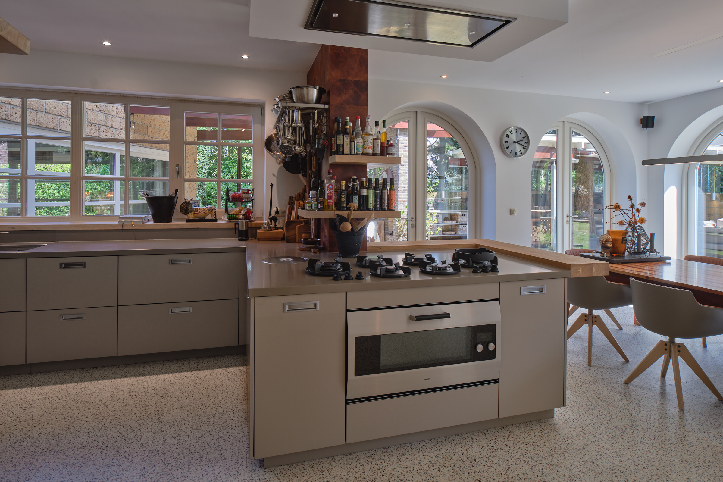 Geweldige woonkeuken (2022), op maat gemaakt door Antonissen interieurbouw en voorzien van alle wenselijke apparatuur zoals o.a. een ingebouwde koffiemachine, combi-oven, heteluchtoven, 6-pits gastoestel (Pitt Cooking), composiet aanrechtblad en een fraai stalen werkblad met stoere achterwand, afzuigkap, dubbele spoelbak, geïntegreerde afvalbak, Quooker en een grote roestvrijstalen koelkast met aparte wijnklimaatkast van Liebherr. De meeste inbouwapparatuur is van hoogstaande kwaliteit van het exclusieve merk Gaggenau.
