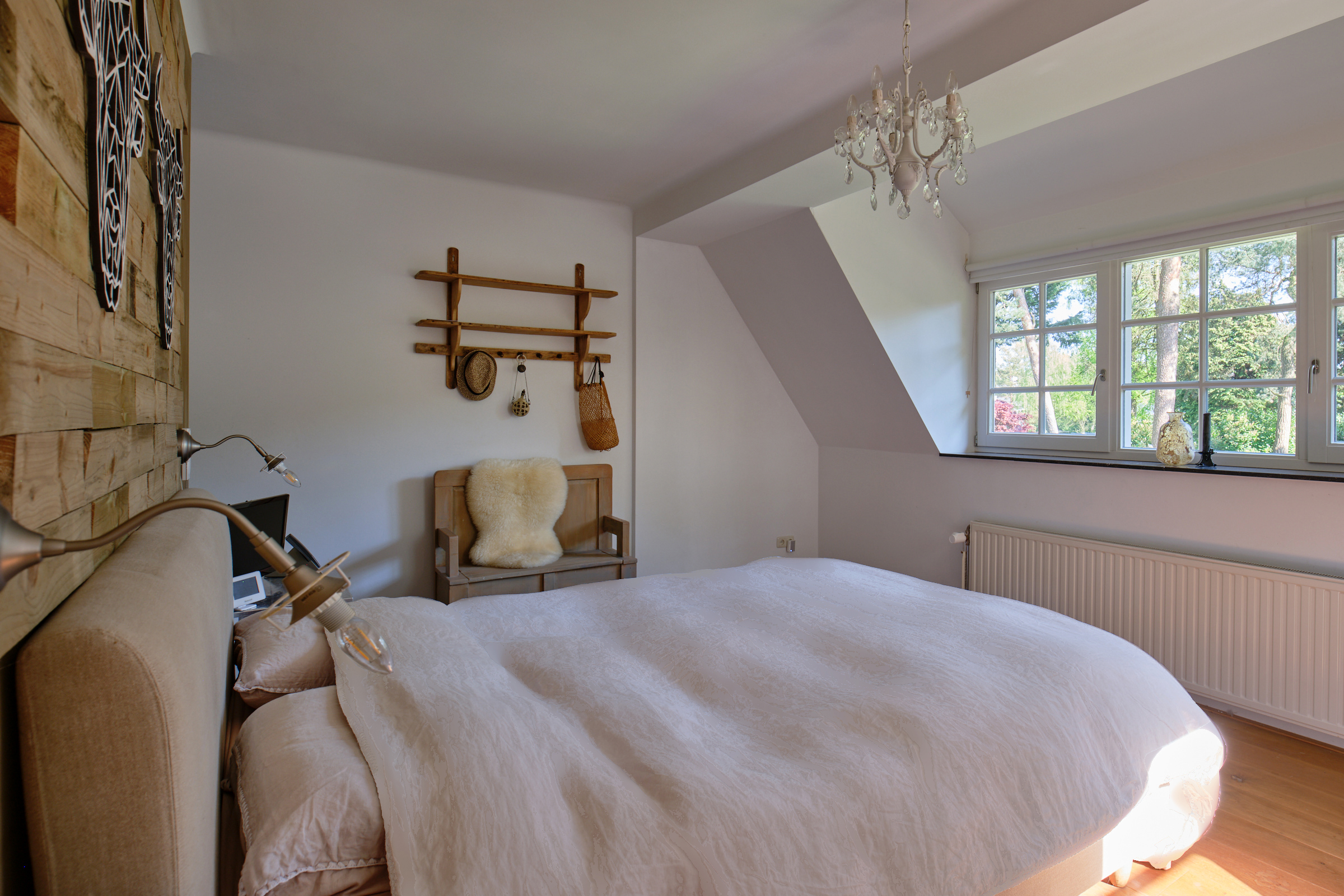 Slaapkamer IV hoofdslaapkamer met dakkapel, grote inloopkast, ideaal om overzichtelijk kleding en accessoires in op te bergen en toegang tot de badkamer. De slaapkamer en dakkapel bevinden zich boven de uitbouw van de woonkamer. Hierdoor is de dakkapel mooi geïntegreerd in het rieten dak.