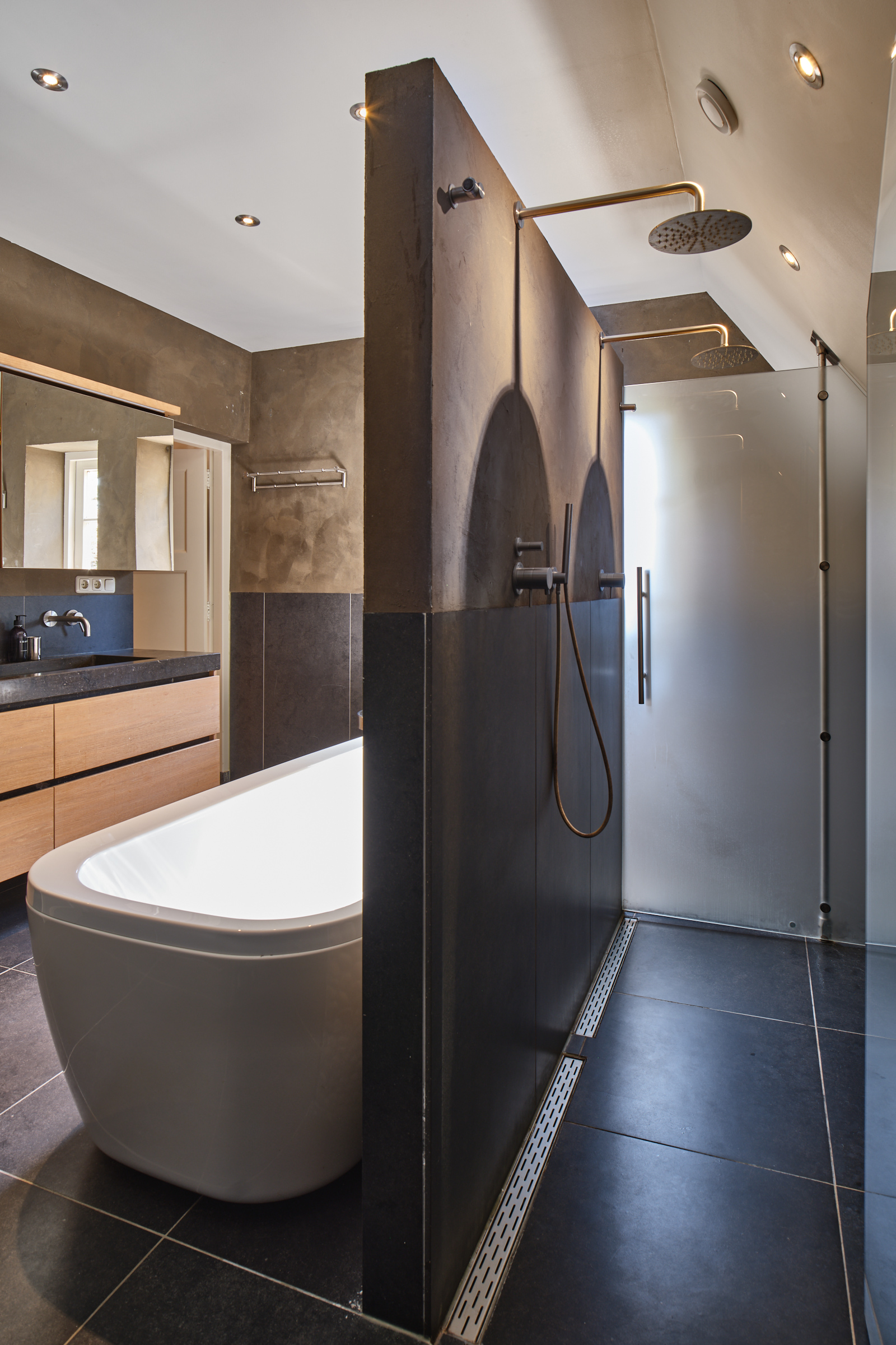 Royale en luxe badkamer voorzien van een dubbele wastafel, dubbele inloopdouche, ligbad, toilet, designradiator, elektrische vloerverwarming en mechanische ventilatie. Alle badkamermeubels zijn op maat gemaakt door Antonissen interieurbouw.