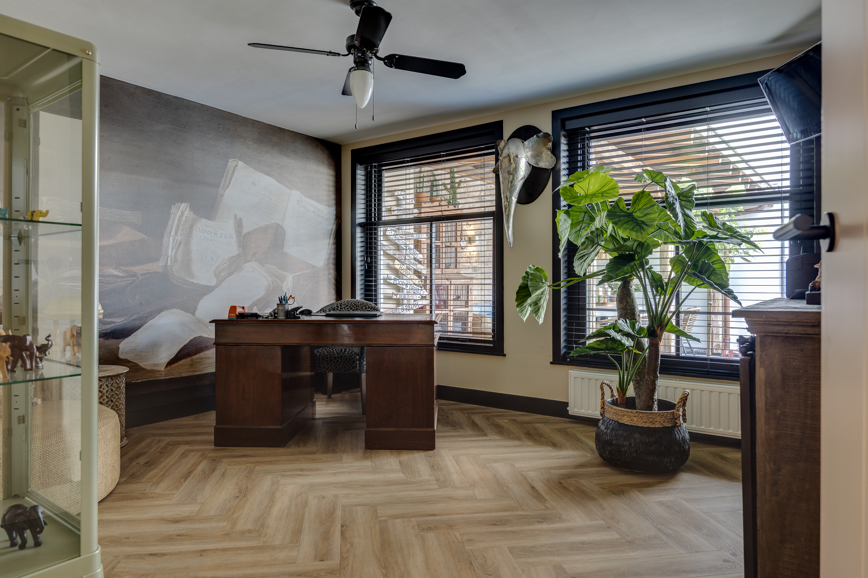 De ruimtelijke woonkamer aan de voorzijde is een ware blikvanger, met grote raampartijen die zorgen voor een overvloed aan natuurlijk licht en een prachtig uitzicht bieden op de levendige Kerkbrink. Wat direct opvalt, is de stijlvolle PVC-vloer die is doorgelegd over de gehele woonverdieping. Deze vloer combineert een warme, rustgevende uitstraling met praktische eigenschappen als duurzaamheid en onderhoudsgemak. Hij vormt de perfecte basis voor elk interieur. De moderne gashaard creëert een gezellige ambiance, ideaal voor sfeervolle avonden. Daarnaast zorgt de aanwezige airconditioning ervoor dat het binnenklimaat het hele jaar door aangenaam blijft. Alles aan deze woonlaag ademt comfort, stijl en luxe.