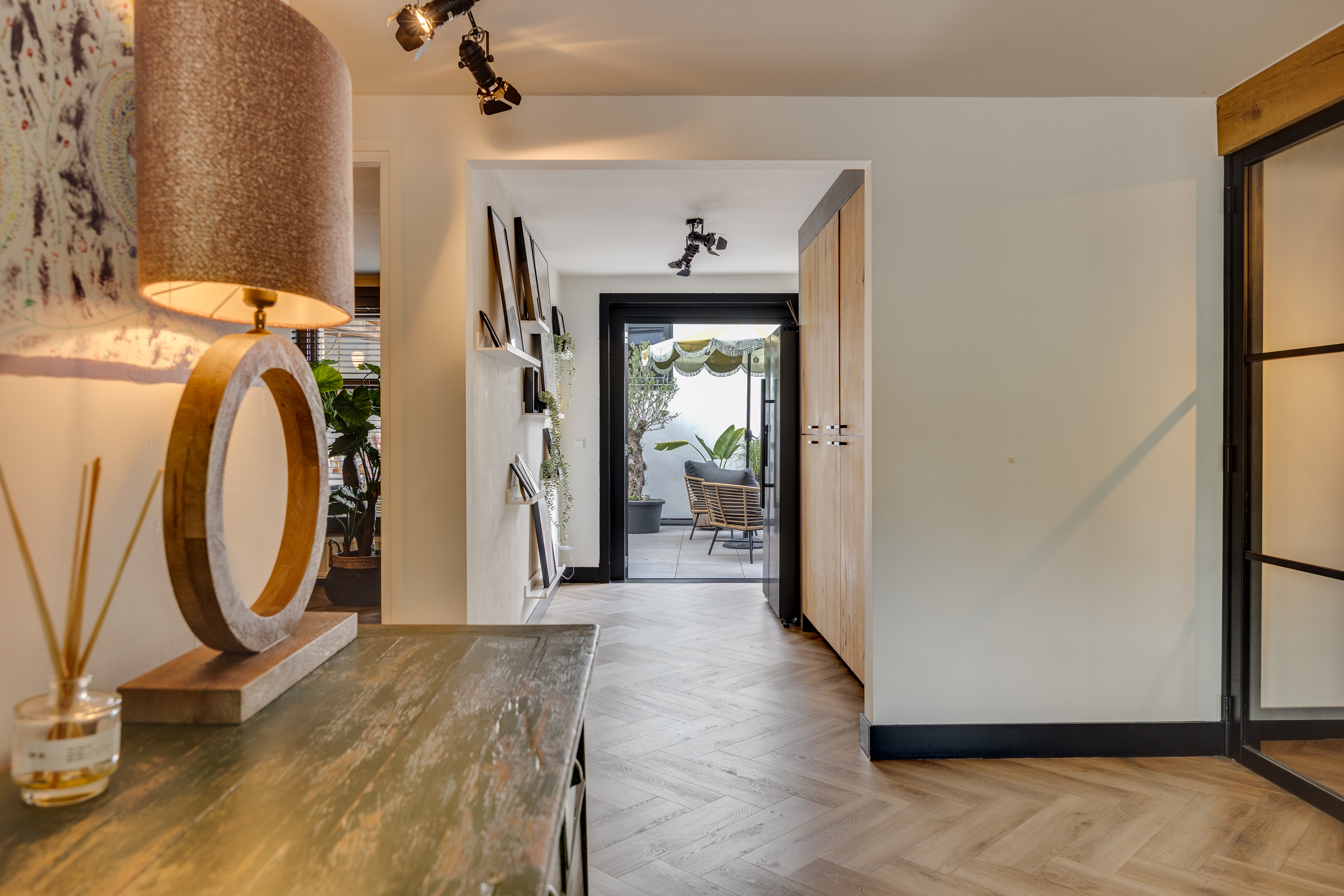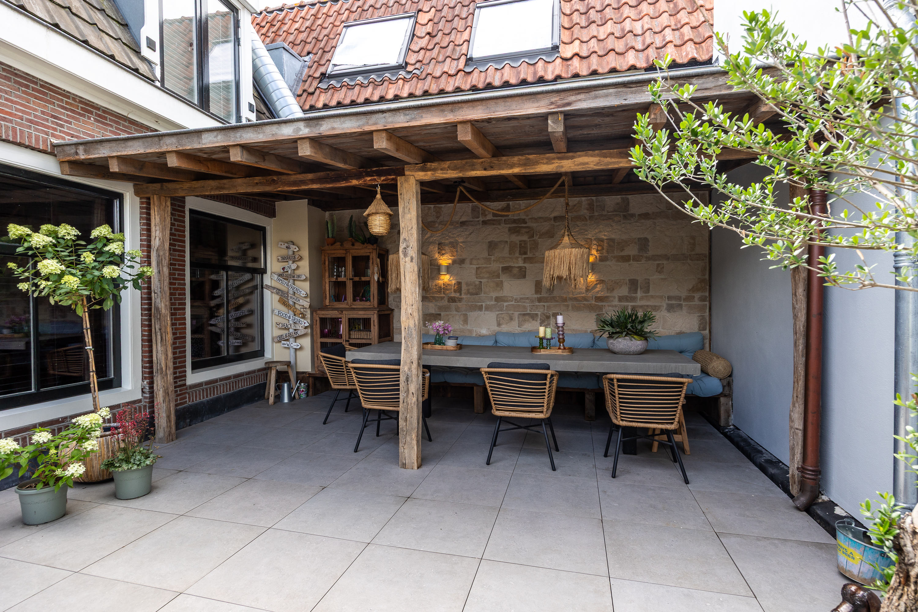 Via een tussenruimte, voorzien van inbouwkasten en plek voor een extra koelkast, stap je zó dakterras op. Dit ruime zonnige terras is volledig betegeld en voorzien van een sfeervolle overkapping, een vaste bank en op maat gemaakte tafel. Hier ervaar je volledige rust en privacy, midden in het centrum. Een heerlijk buitenverblijf, perfect voor diners, borrels of een kop koffie in de ochtendzon.