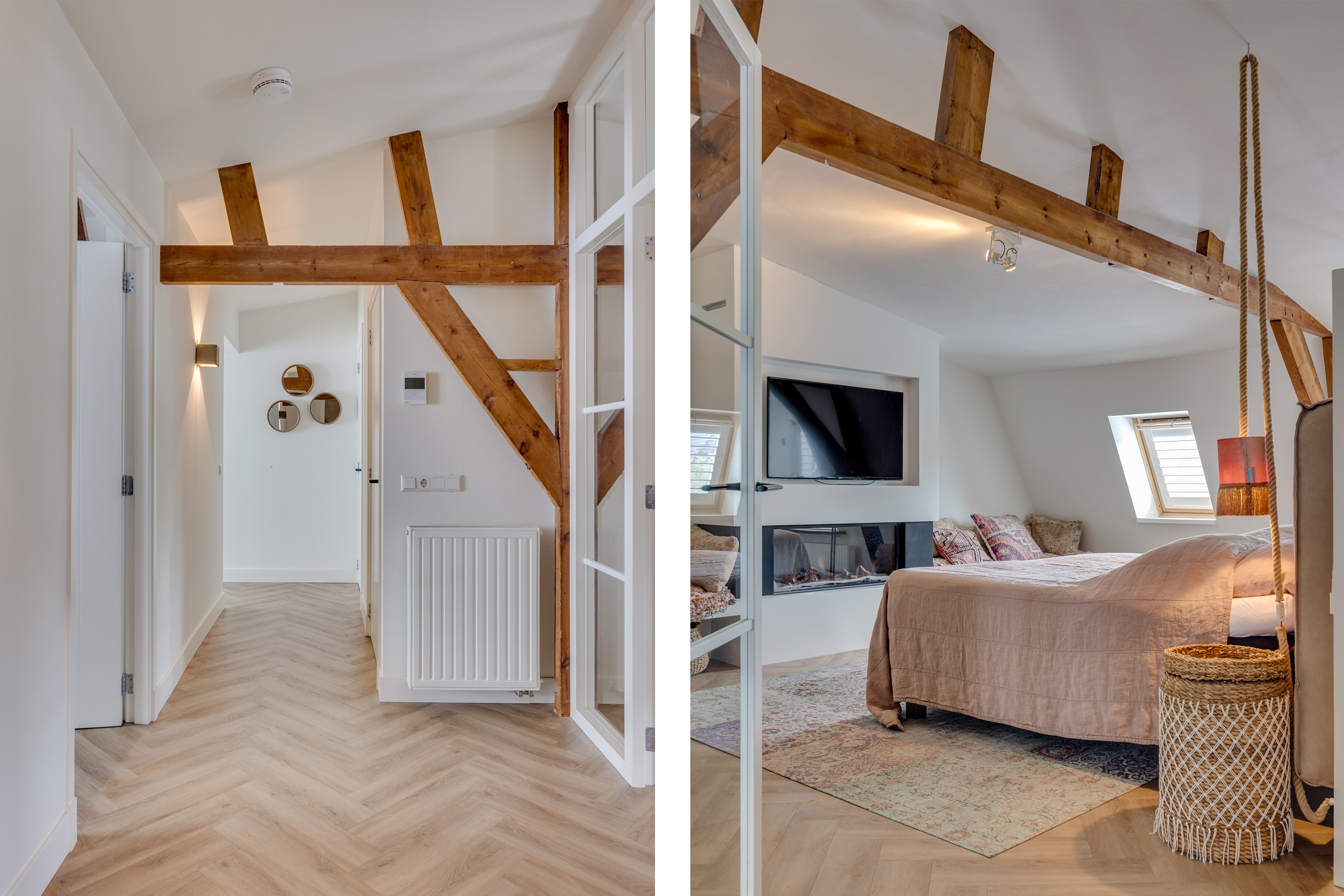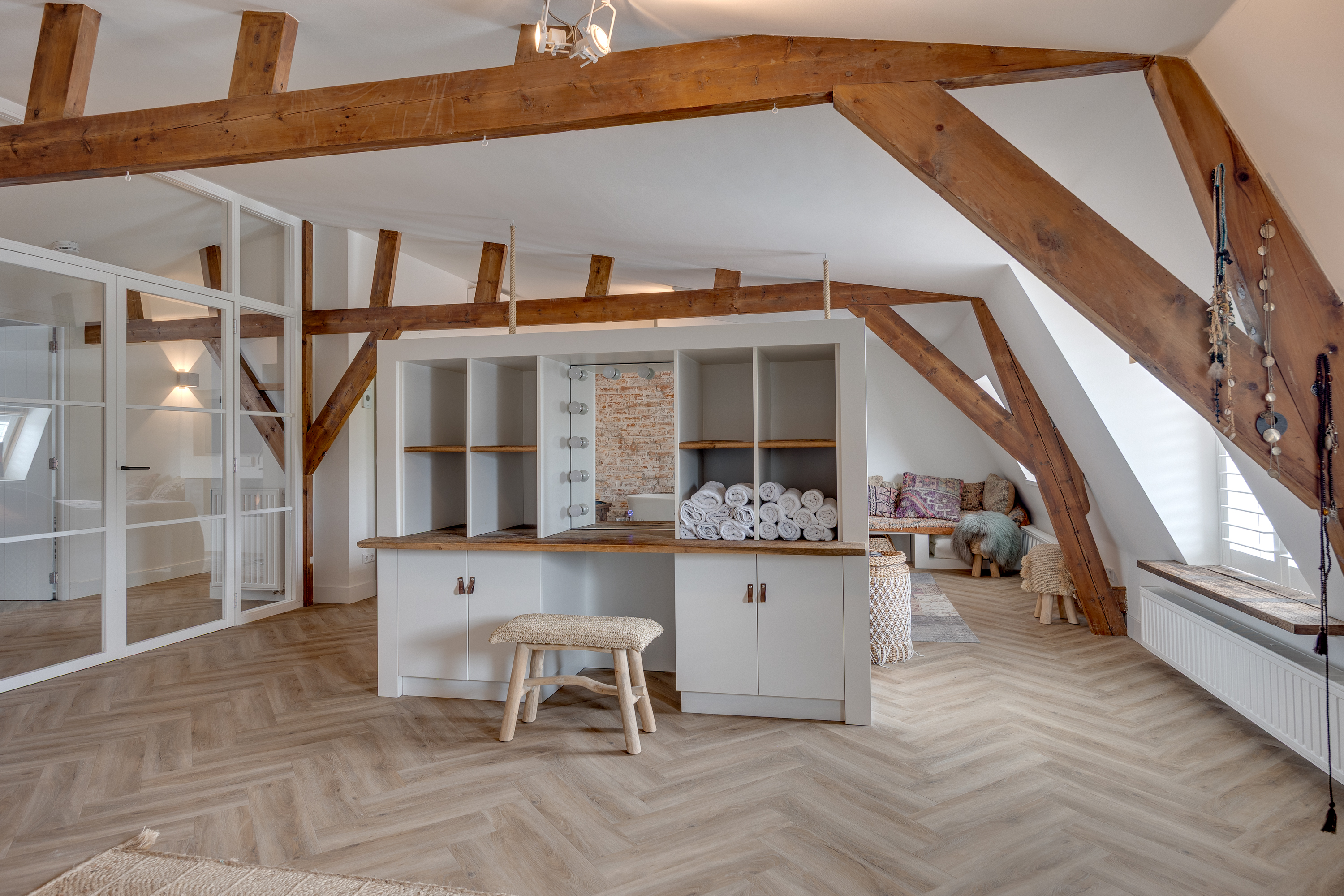 Daarnaast is er een tweede badkamer met inloopdouche, wastafelmeubel, toilet en ruimte voor wasmachine en droger. Een extra separaat toilet bevindt zich op de overloop. Authentieke houten balken zijn in het zicht gebleven en zorgen voor een sfeervol contrast met de moderne afwerking.